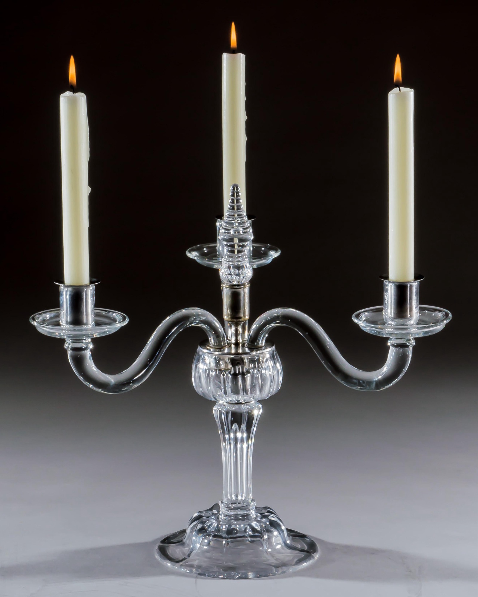 The pulled ribbed base on a domed foot with annulated knop below a pedestal stem, supporting a ribbed container issuing three plain one piece candle arms with decorative knop. The drip pan and candle tube fitted with silver savealls, the central mount fitted with tiered annulated finial upon an air bead knop.