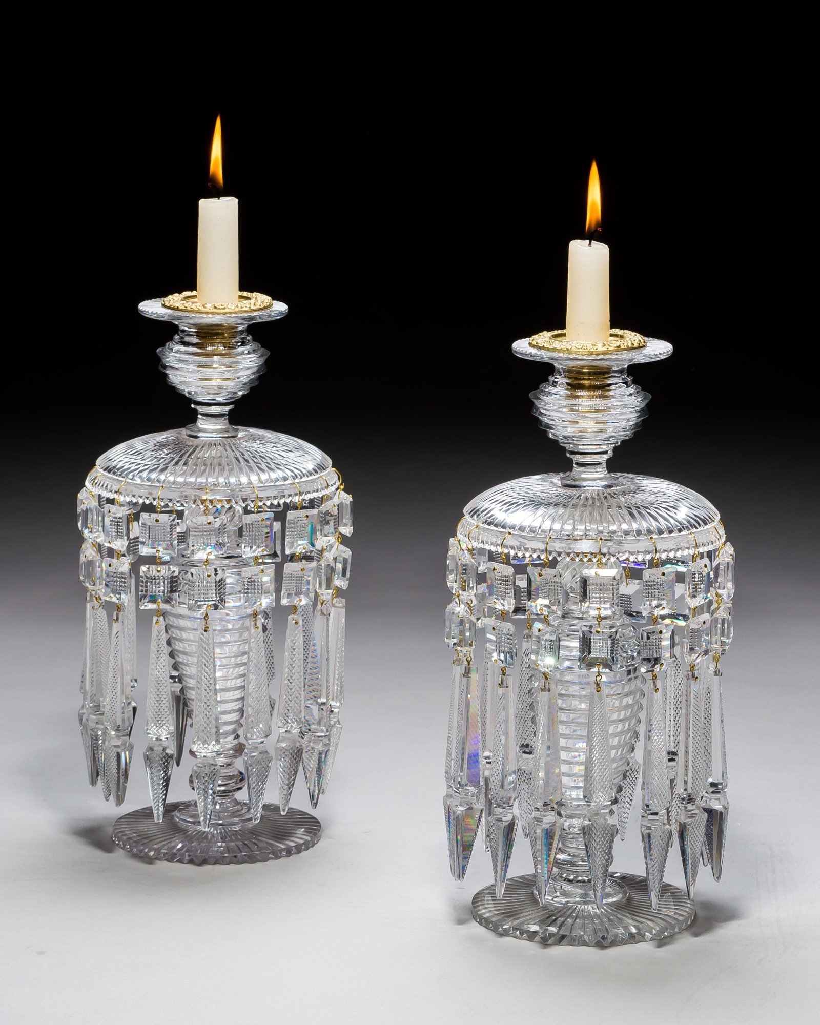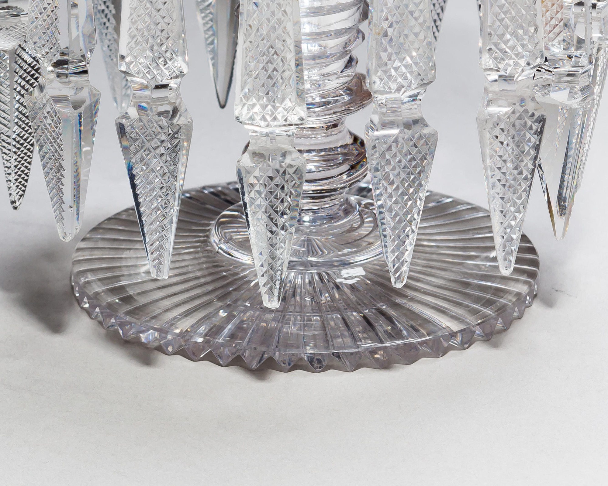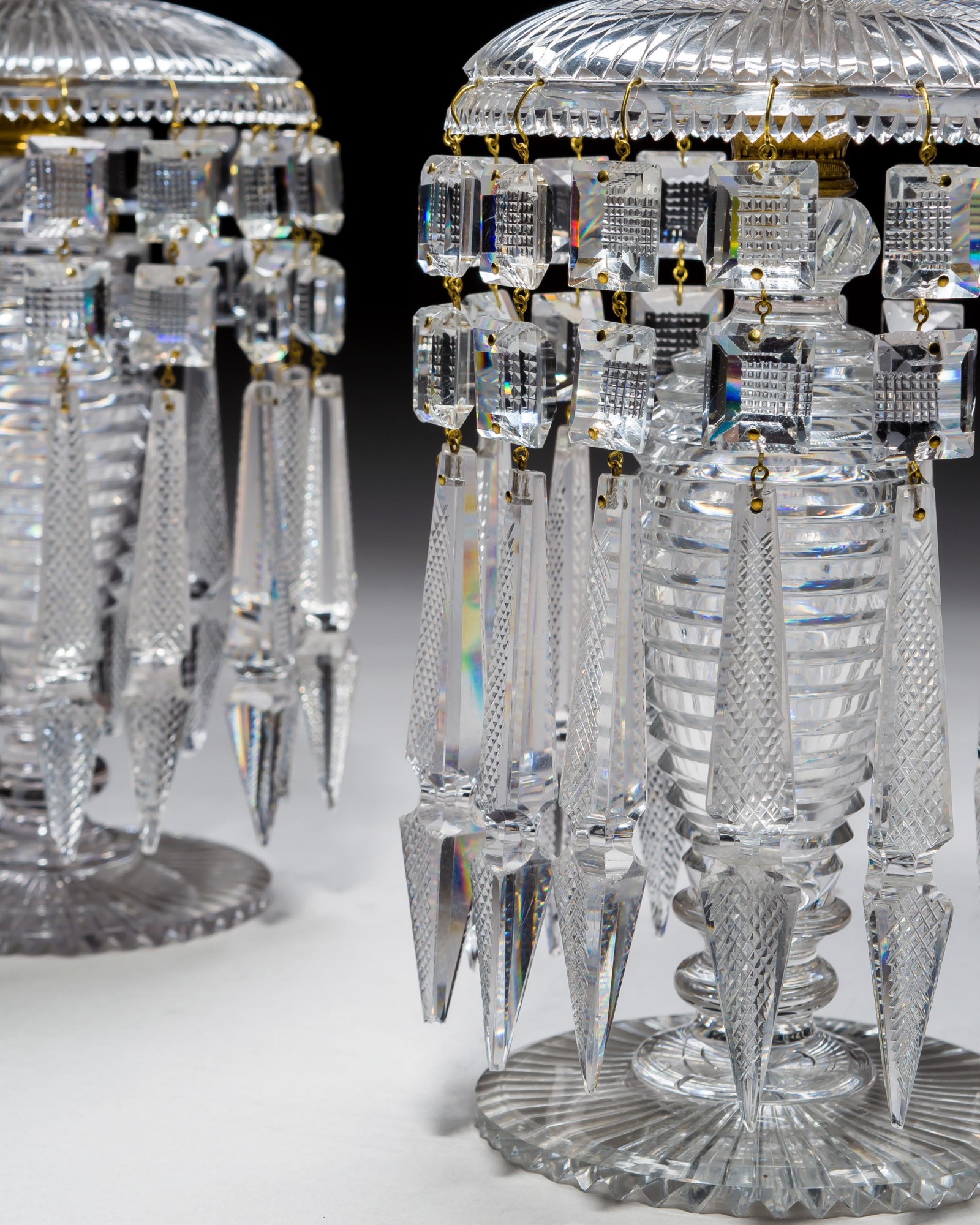 A pair of three piece glass lustres with radial cut foot and pan, step cut body and nozzle, and finely cut diamond square buttons and spear drops.