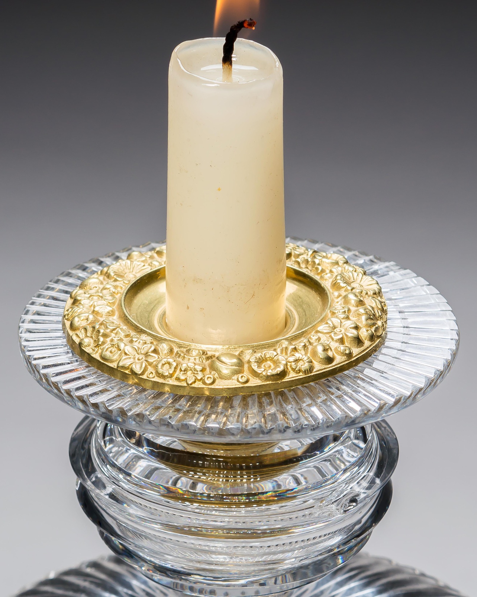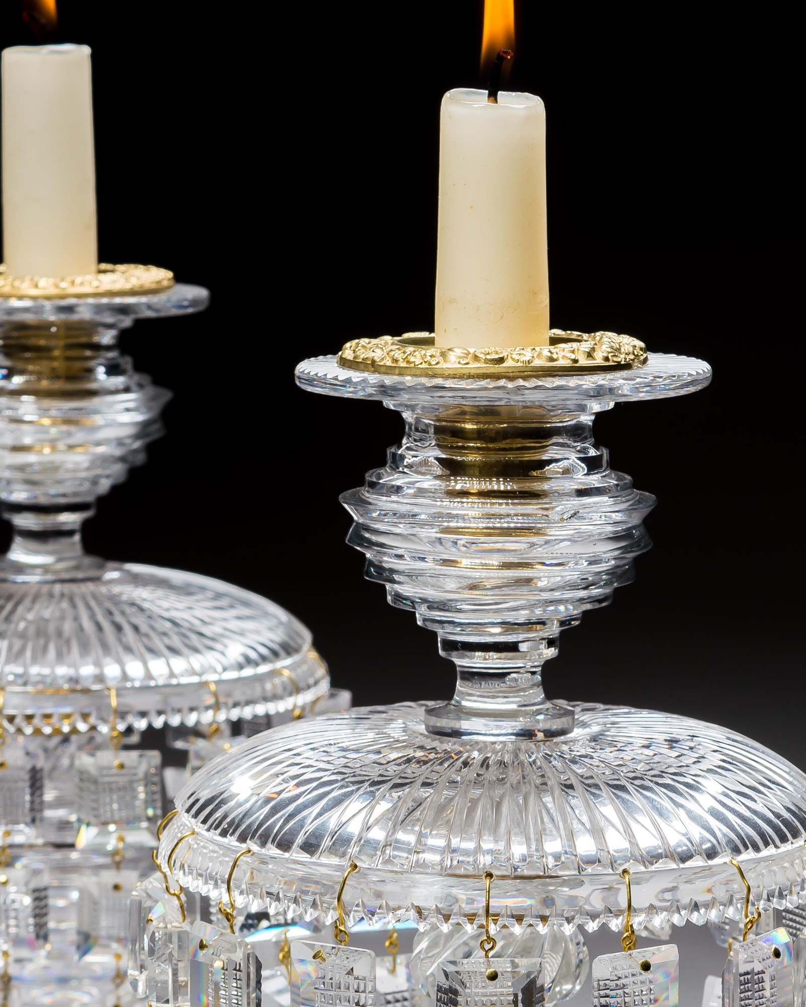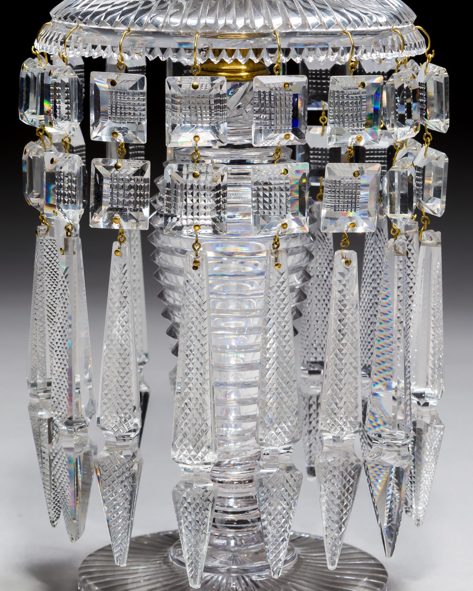 A pair of three piece glass lustres with radial cut foot and pan, step cut body and nozzle, and finely cut diamond square buttons and spear drops.