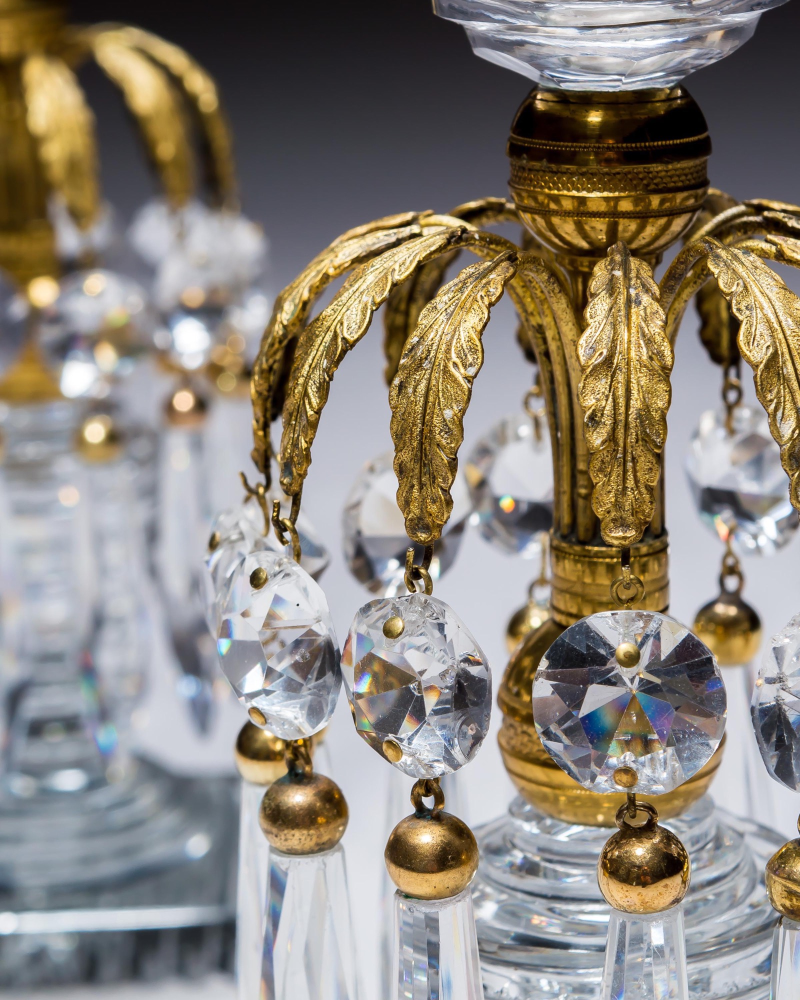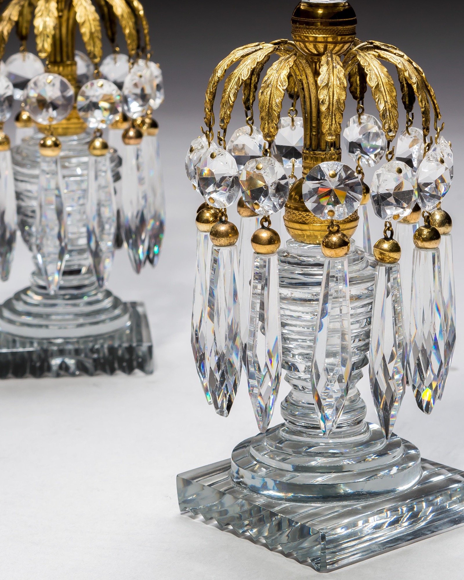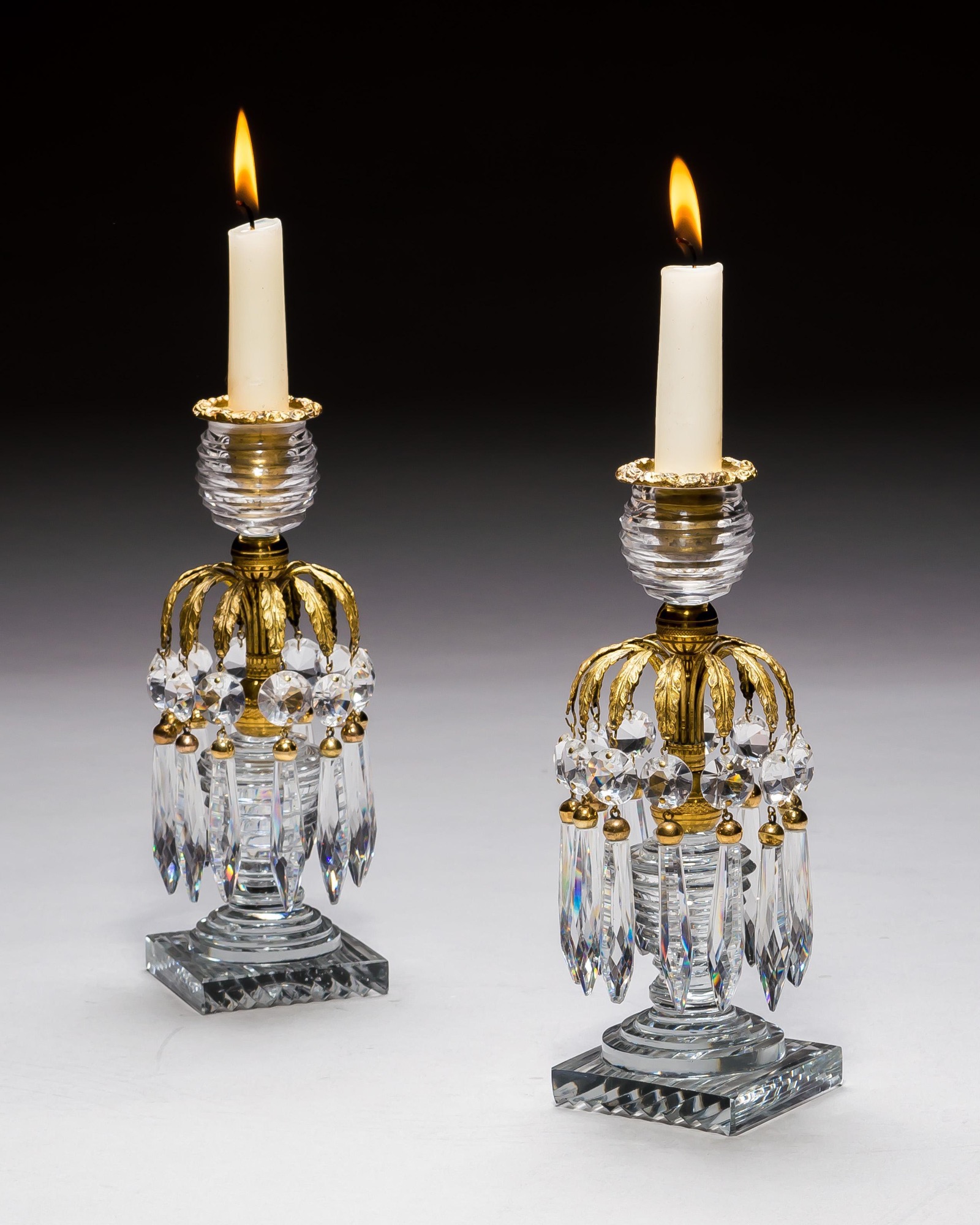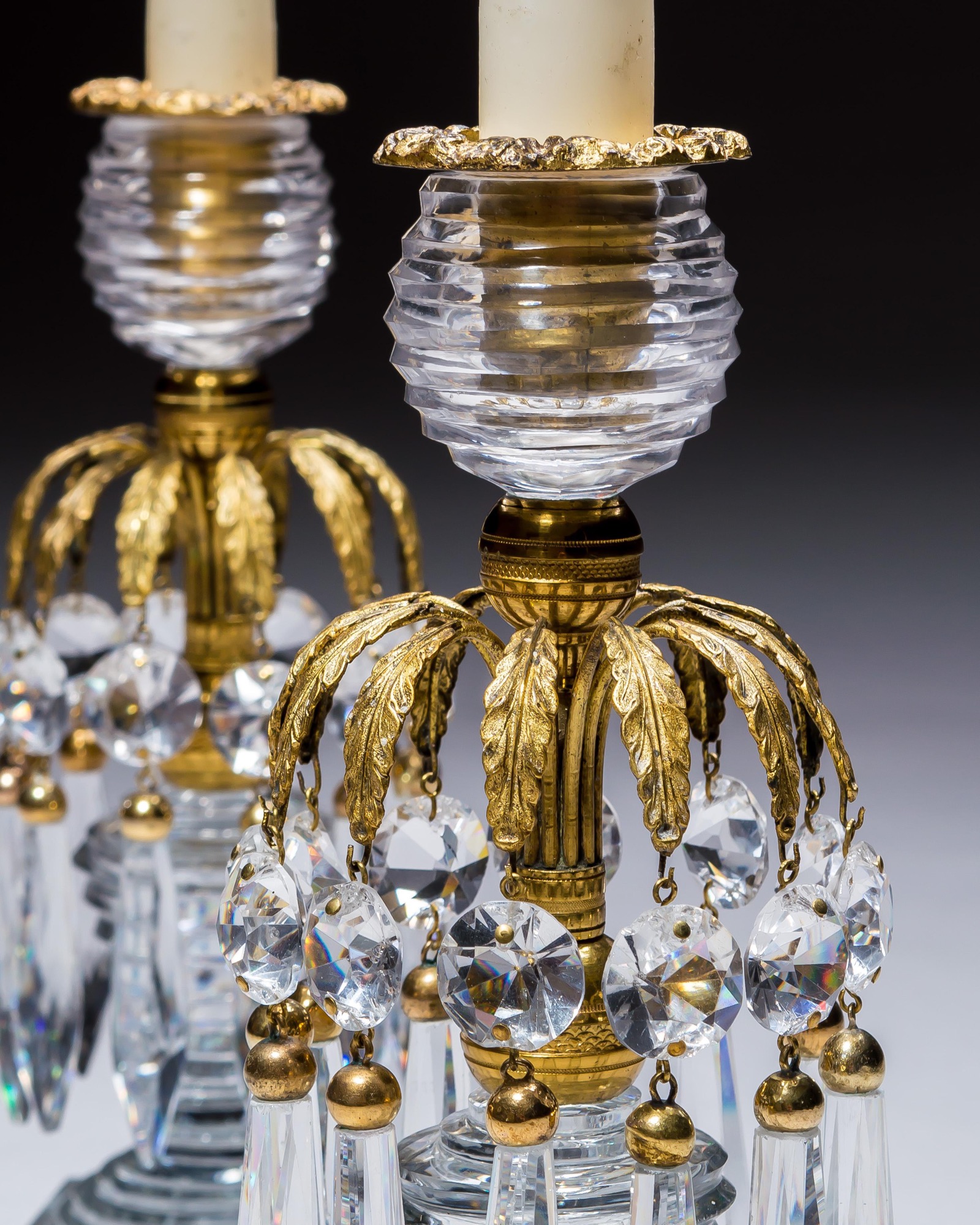 A PAIR OF REGENCY ORMOLU & GLASS CANDLESTICKS