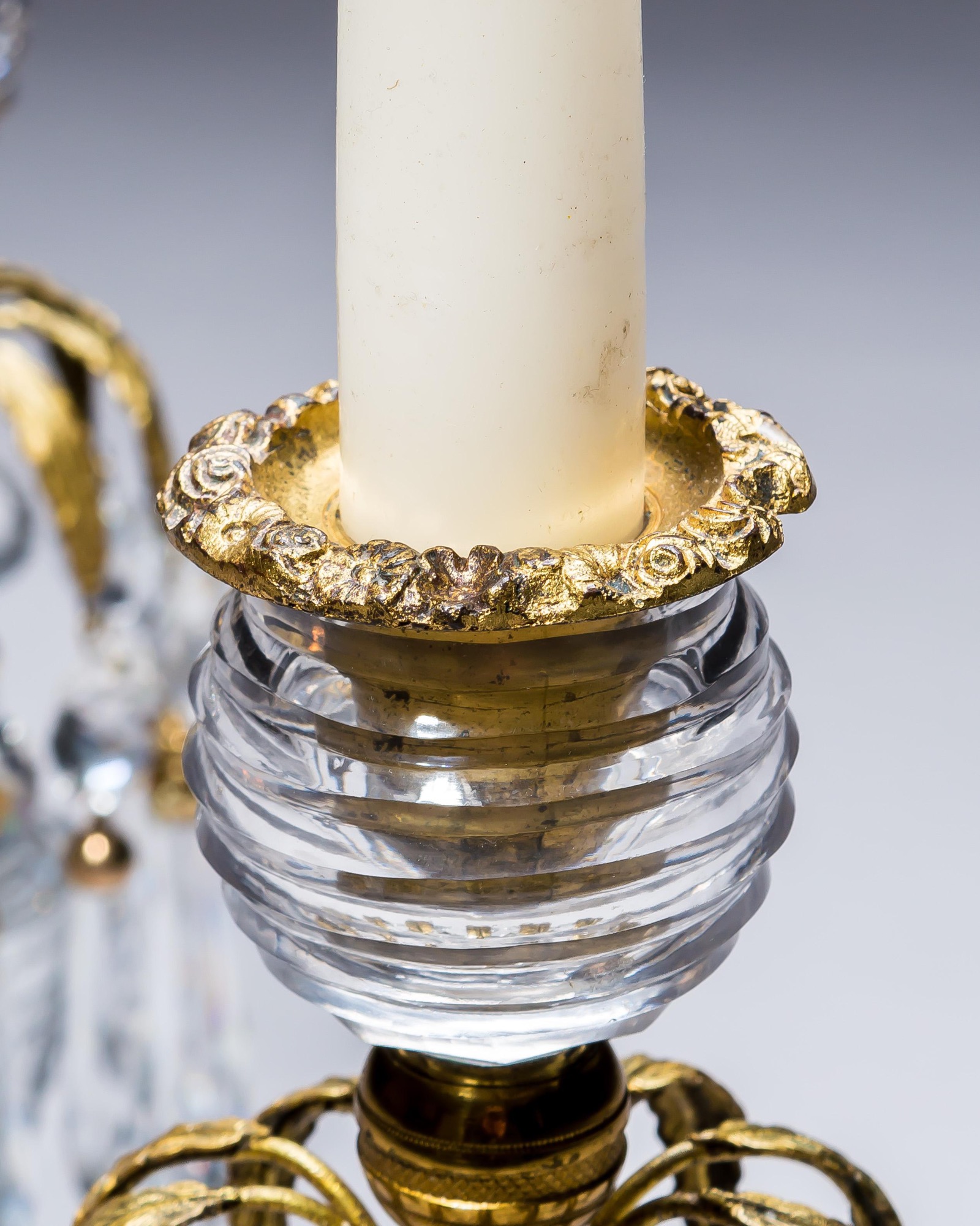 A pair of step cut glass candlesticks mounted with ormolu leaf sprays, hung with capped facet icicles.