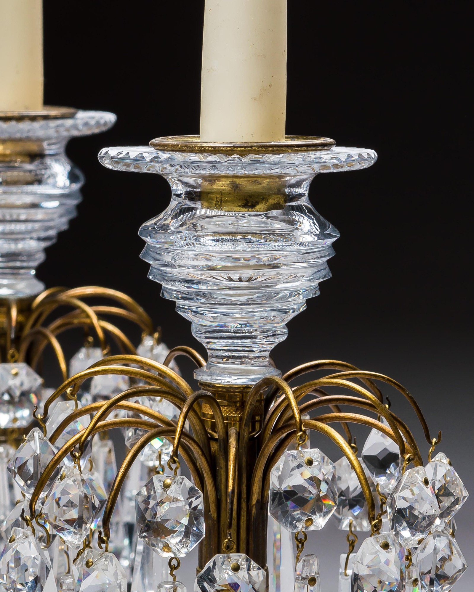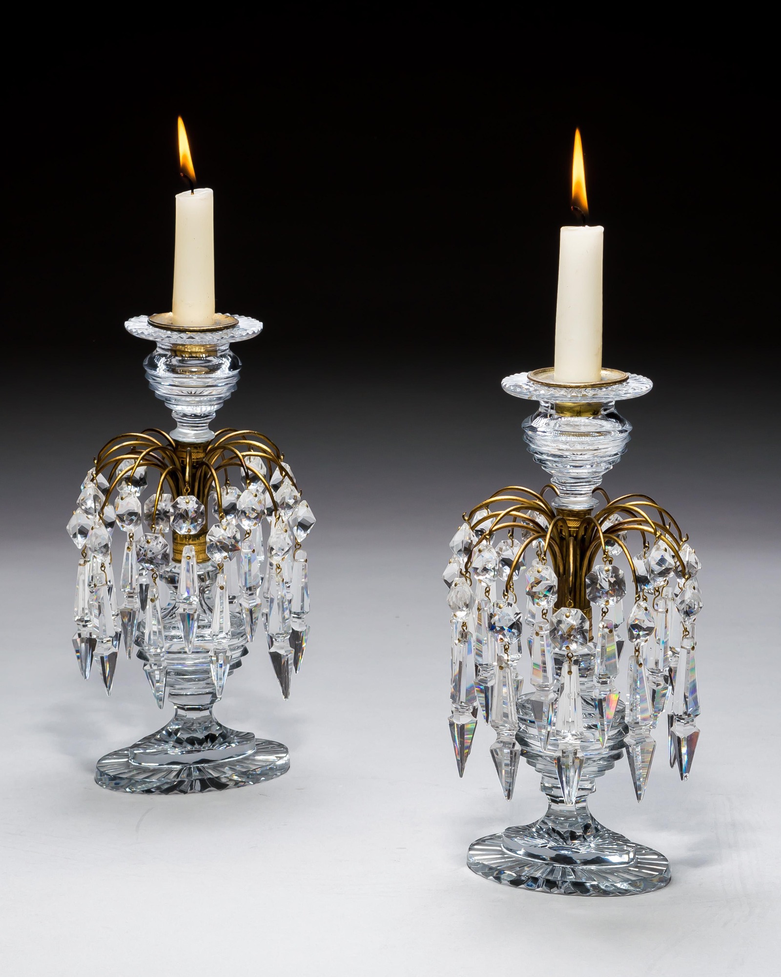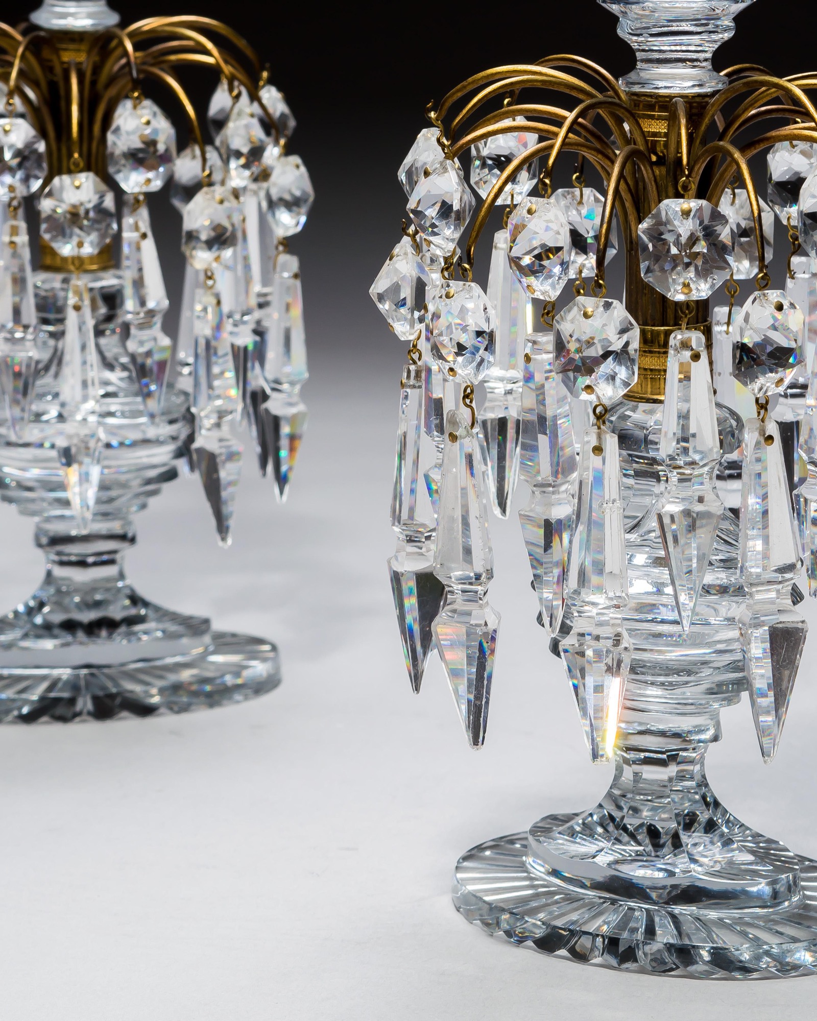 The lustres are crowned with a simple yet refined step cut candle nozzle, allowing the warm glow of the flame to play against the shimmering crystal. Perfectly balanced in form and detail, this pair exemplifies the opulence and sophistication of Regency lighting, adding an air of refined luxury to any interior.