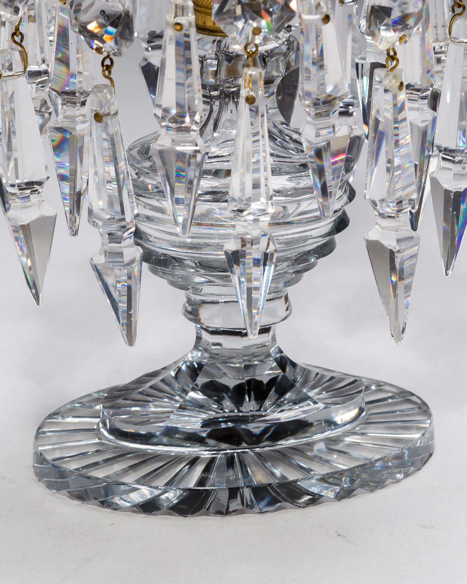 This elegant pair of Regency cut-glass lustres captures the timeless glamour of early 19th-century design. Each piece is raised on a finely faceted, star-cut oval base that supports a beautifully proportioned baluster stem, crafted from clear glass with precise, hand-cut detailing.