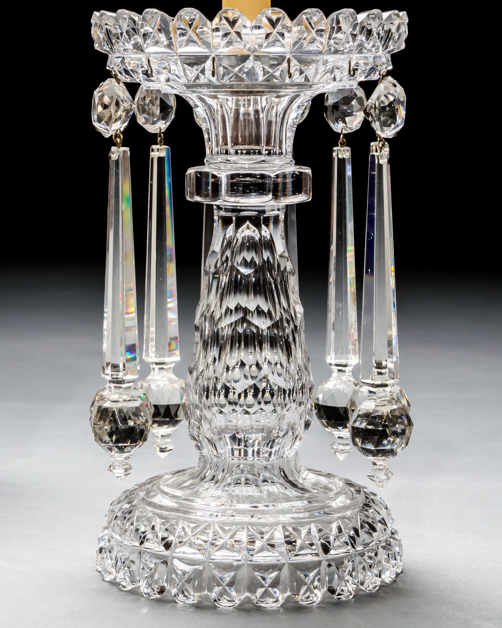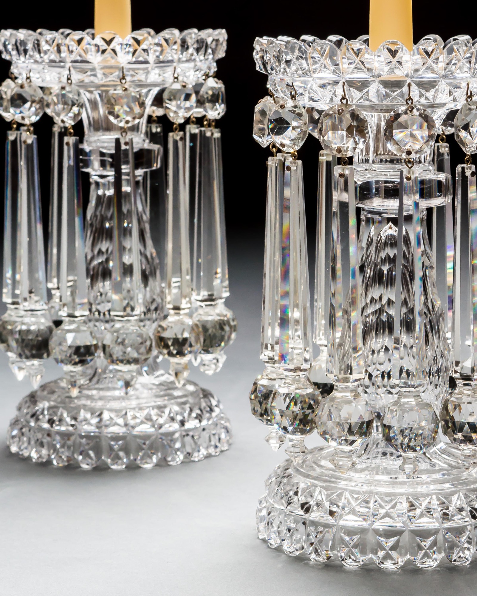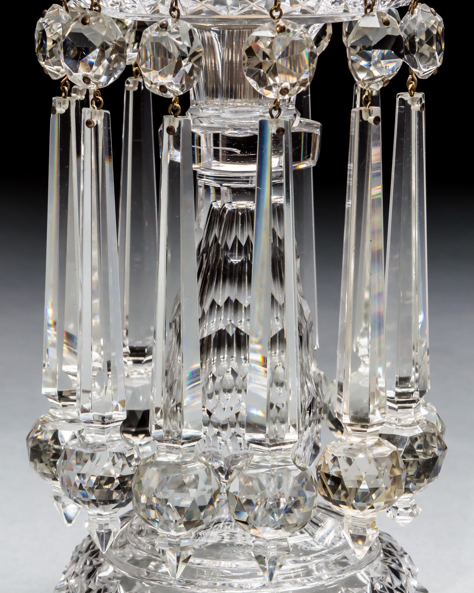 A fine pair of heavily cut Victorian glass lustres hung with ball drops
