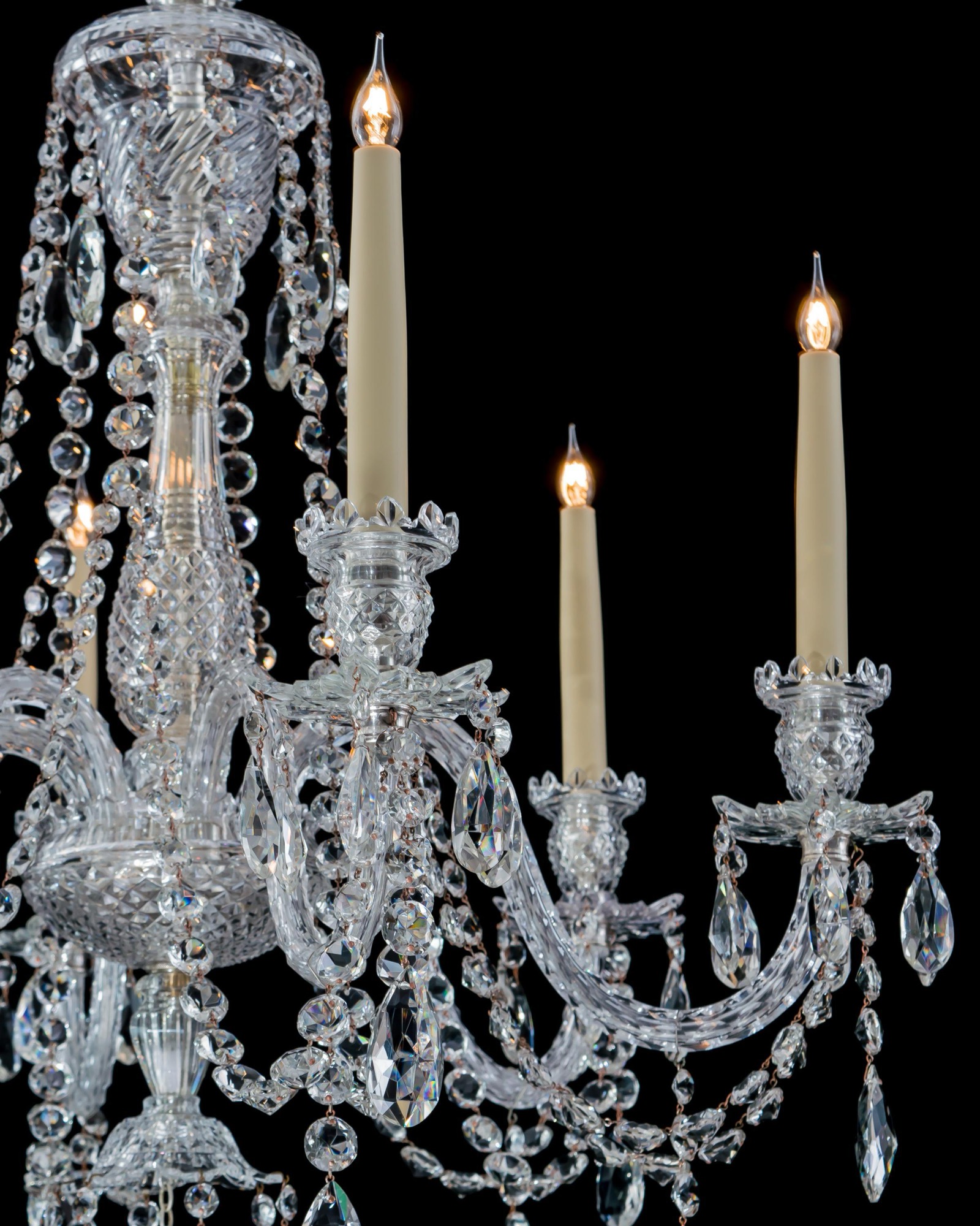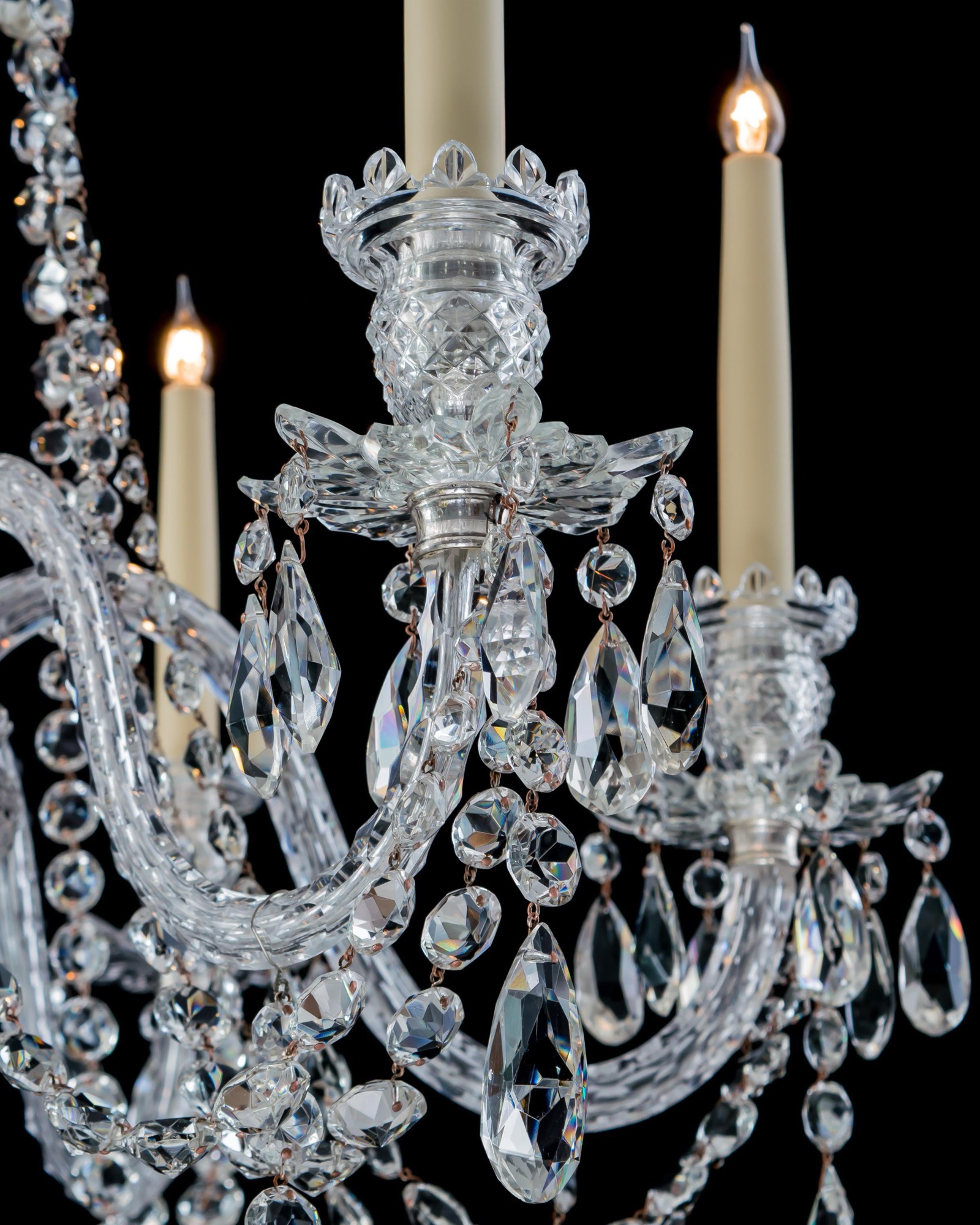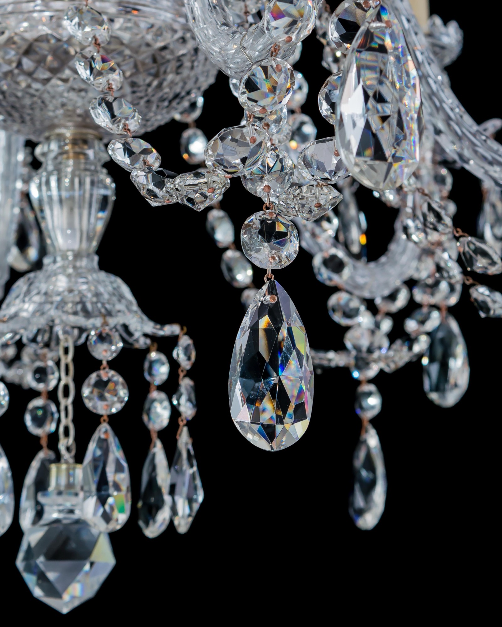 Garlands of graduated crystal drops cascade between the top of the shaft and the arms, culminating in a central finial adorned with a surround of faceted pendant drop. The chandelier's design reflects the height of Edwardian opulence, with every element intended to refract light and create a dazzling interplay of brilliance and shadow.
