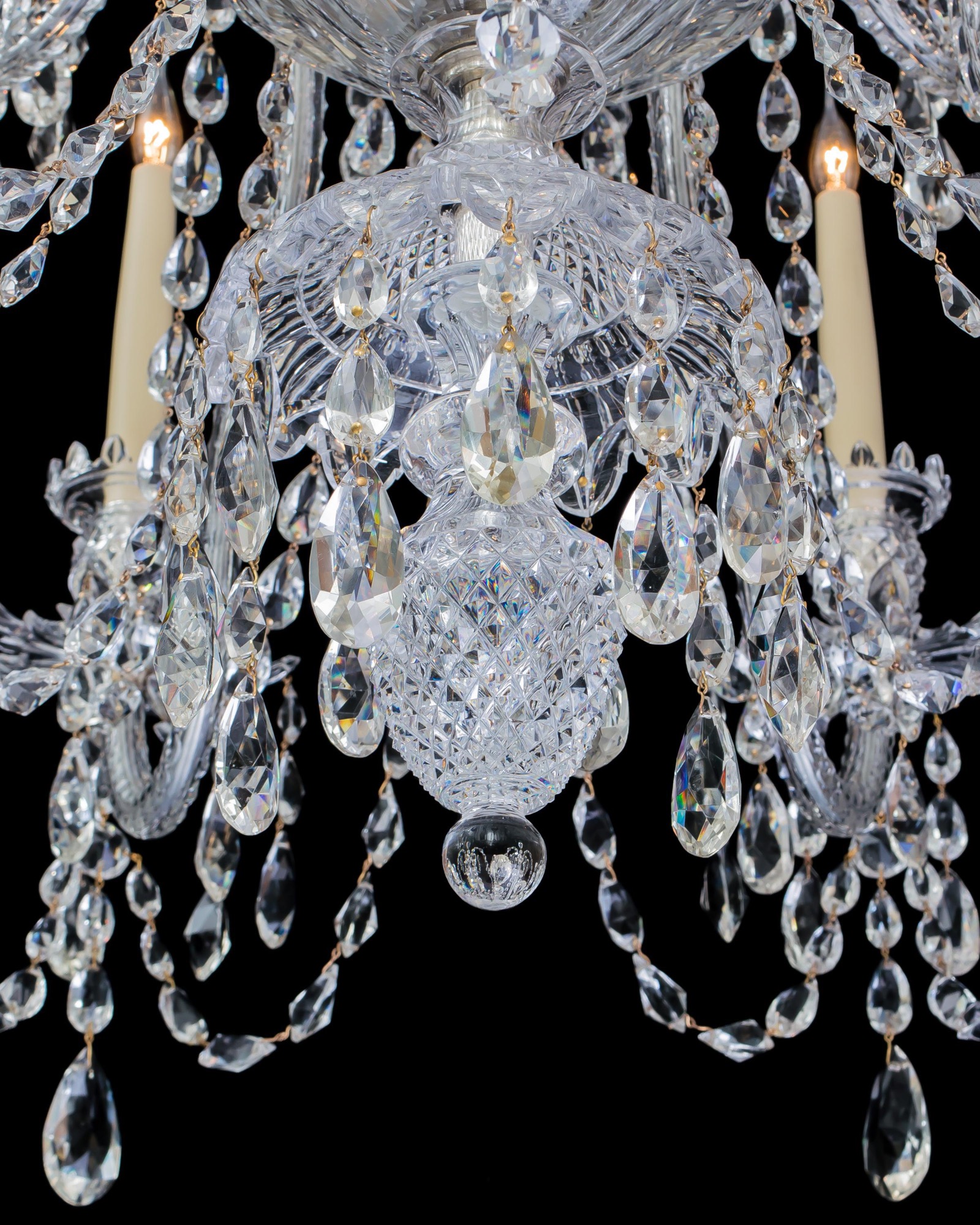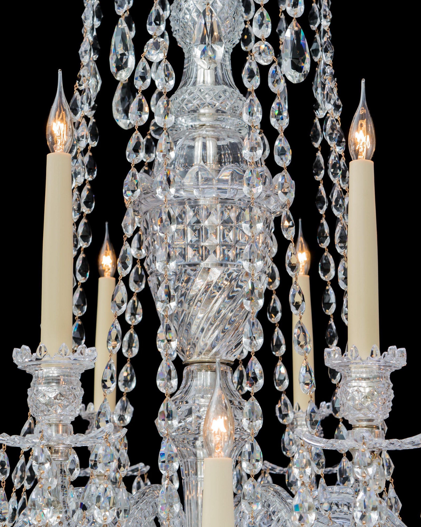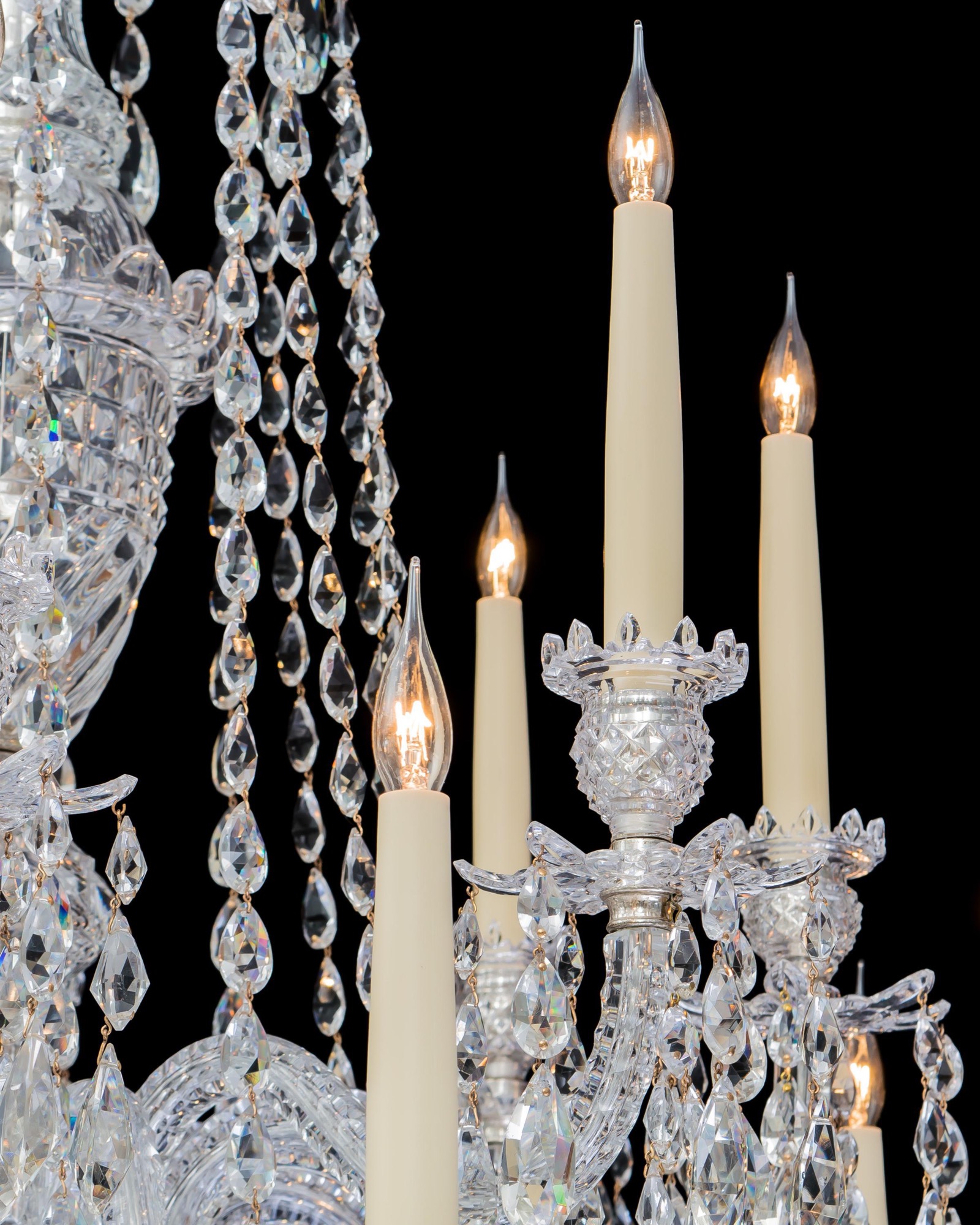 The diamond cut multi baluster stems with drop hung canopies, cascading to sixteen notch cut branches each supporting van-dyke drip pans and candle nozzles, the chandeliers elaborately draped with pear drops and finals.