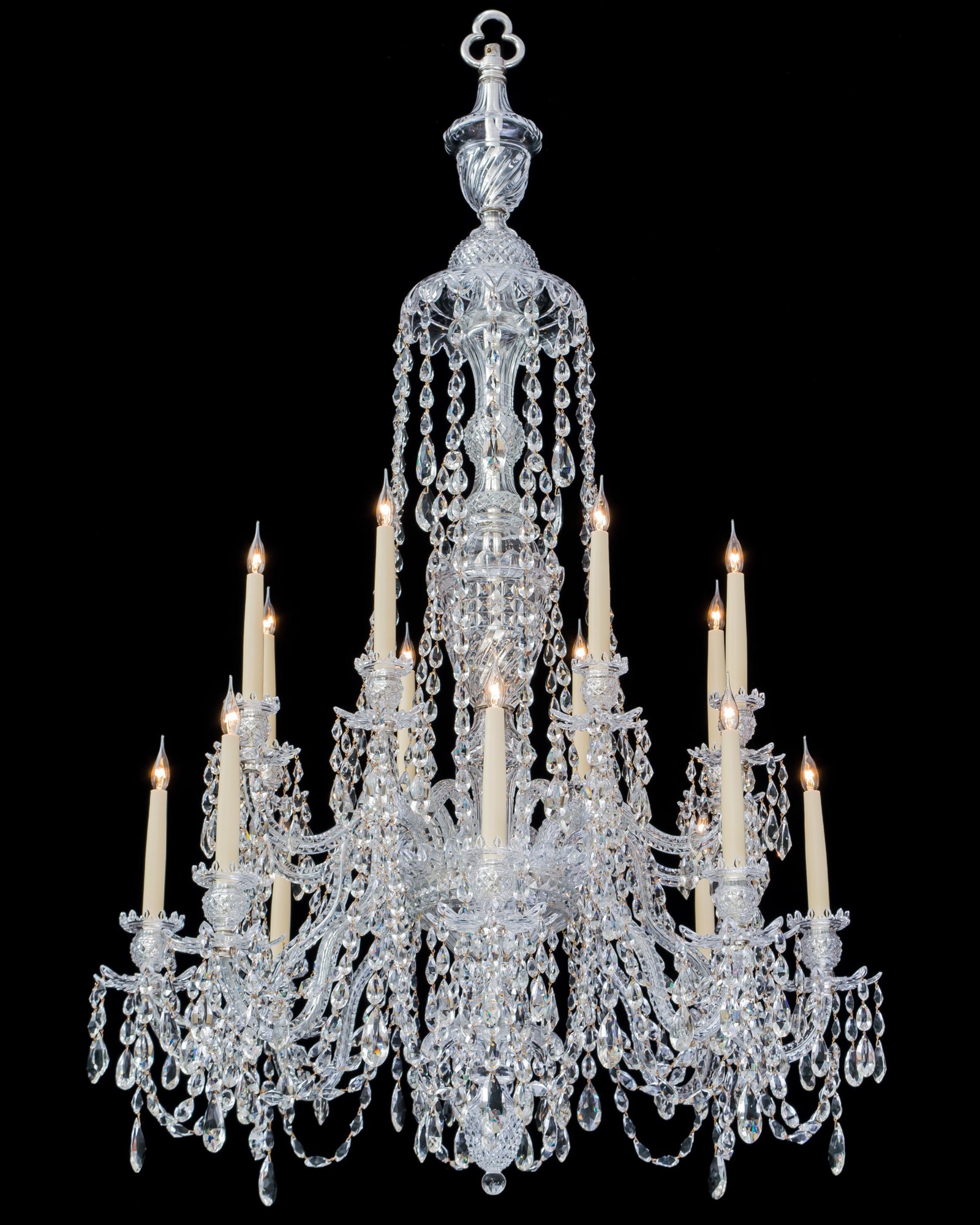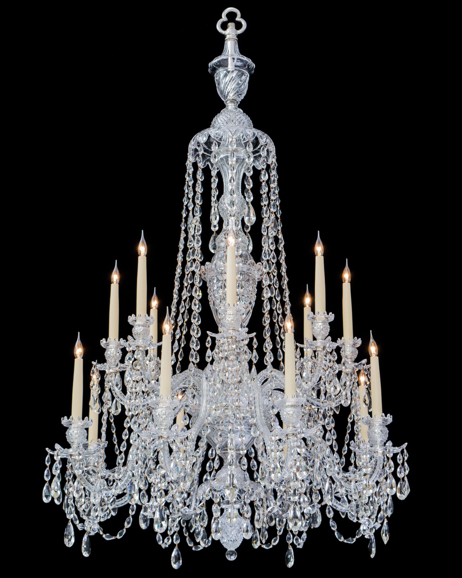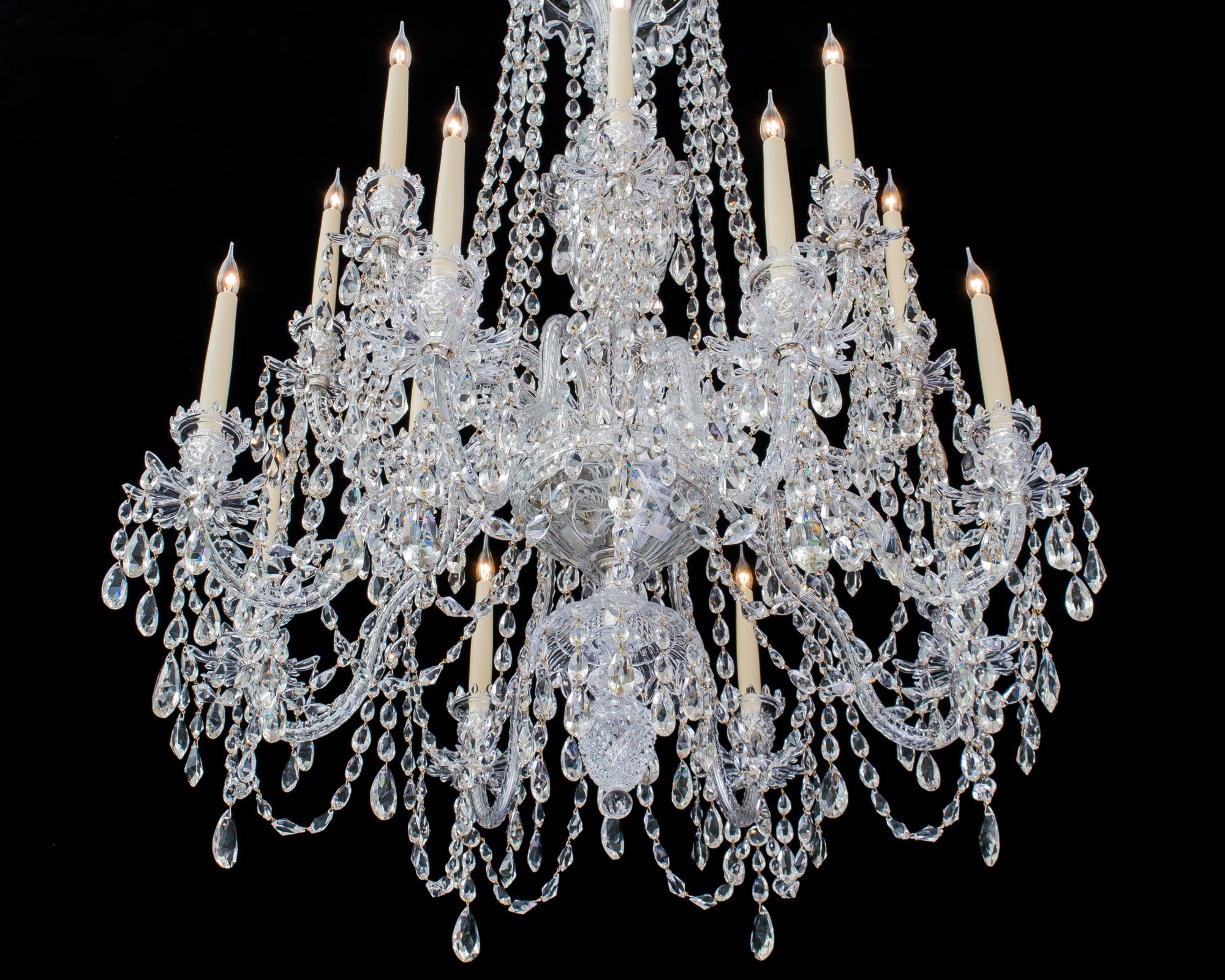 The diamond cut multi baluster stems with drop hung canopies, cascading to sixteen notch cut branches each supporting van-dyke drip pans and candle nozzles, the chandeliers elaborately draped with pear drops and finals.