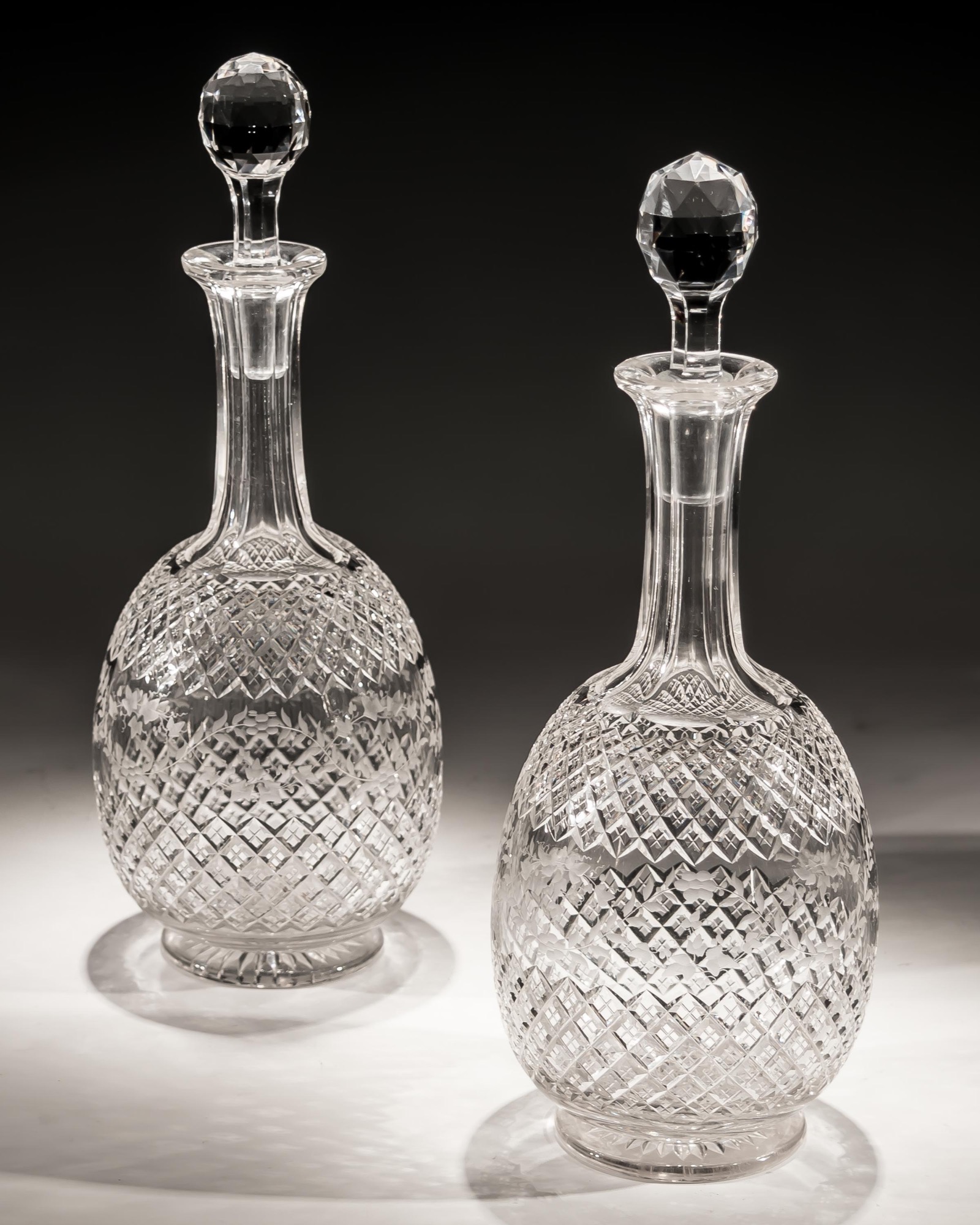 A fine pair of double cut diamond decanters engraved with floral swages.