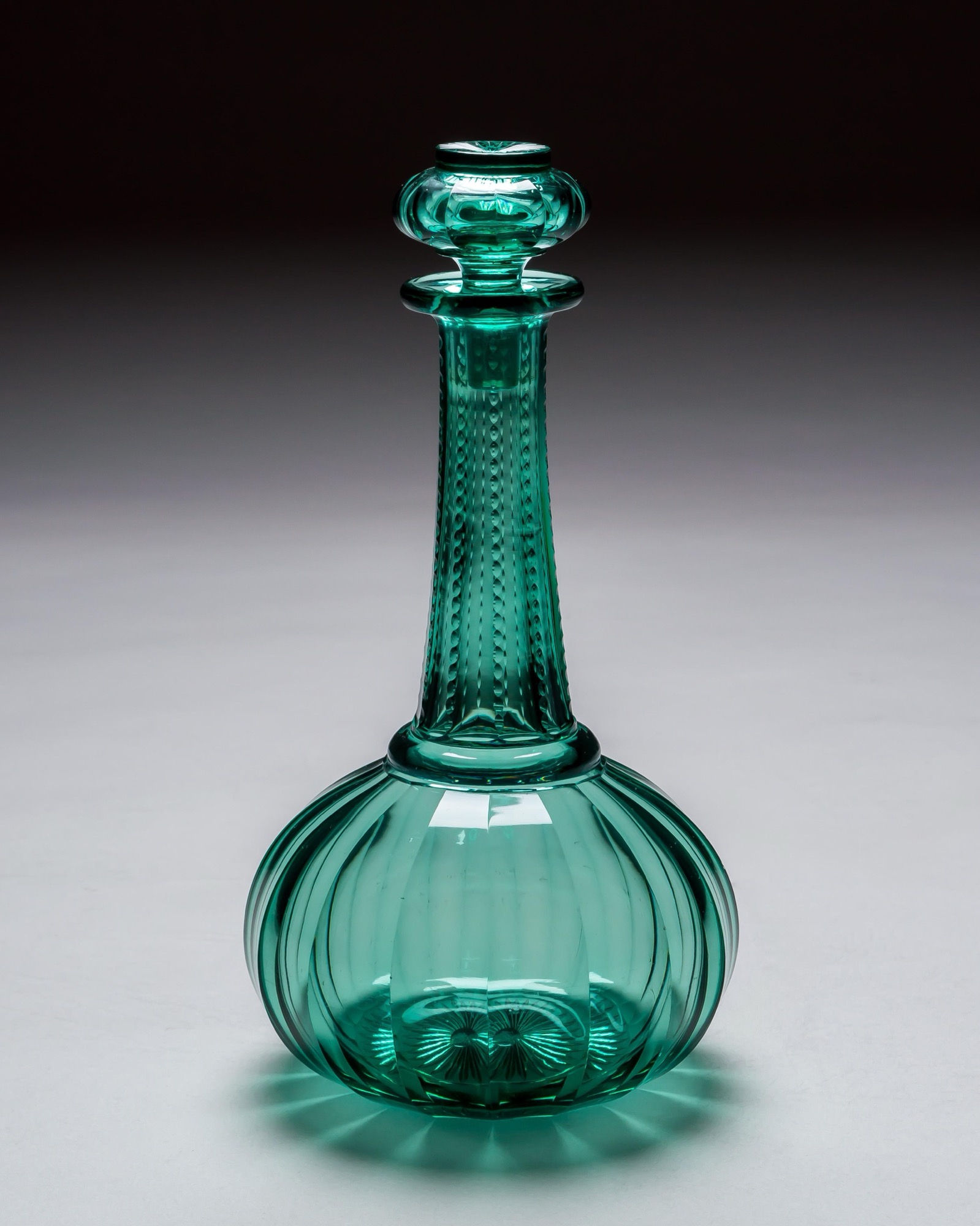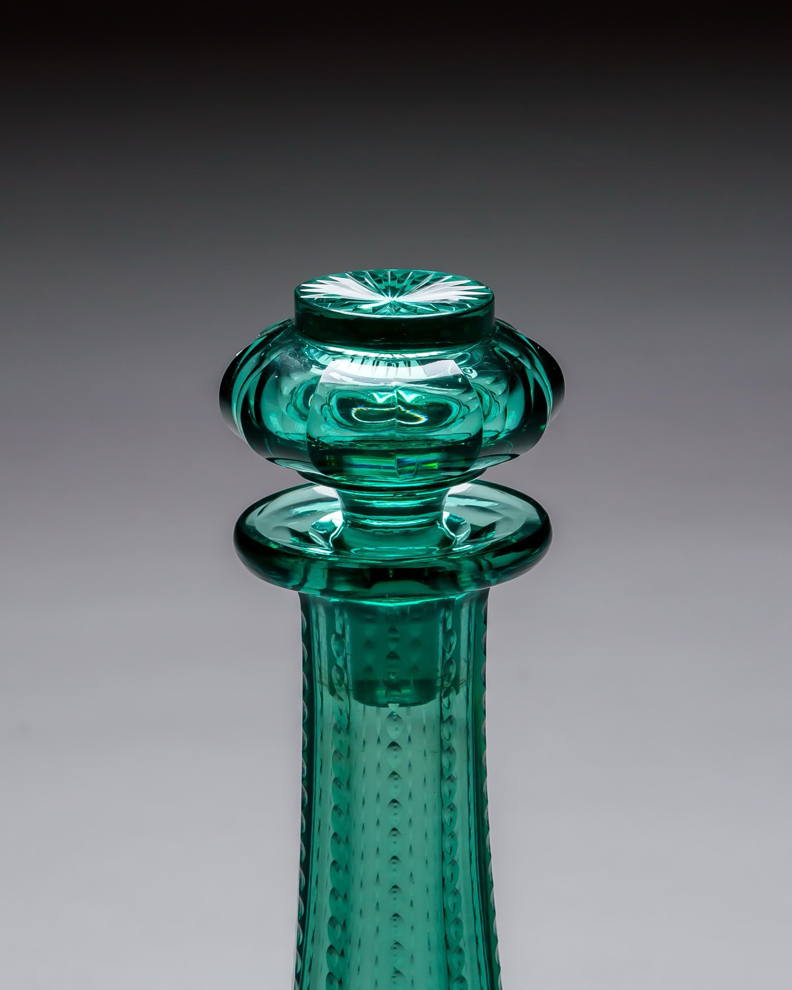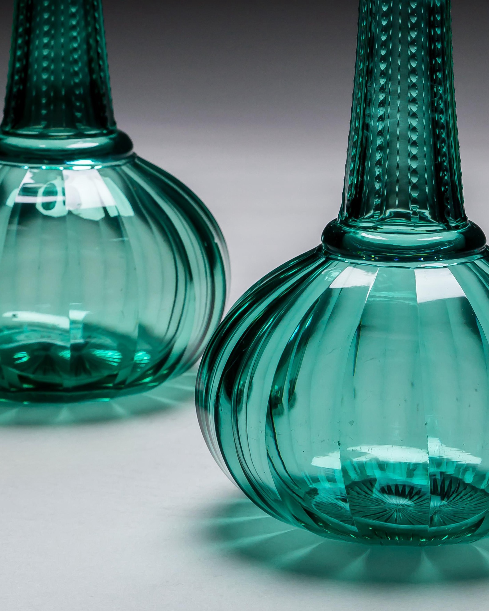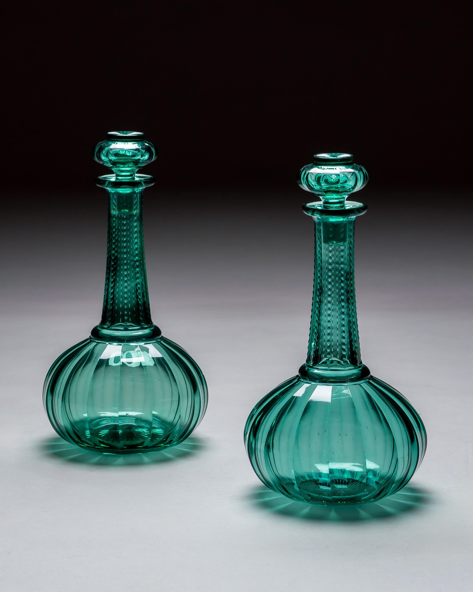 The green decanters of shaft and globe form, with slice cut bodies and notch cut necks, fitted with star cut top hat stoppers.