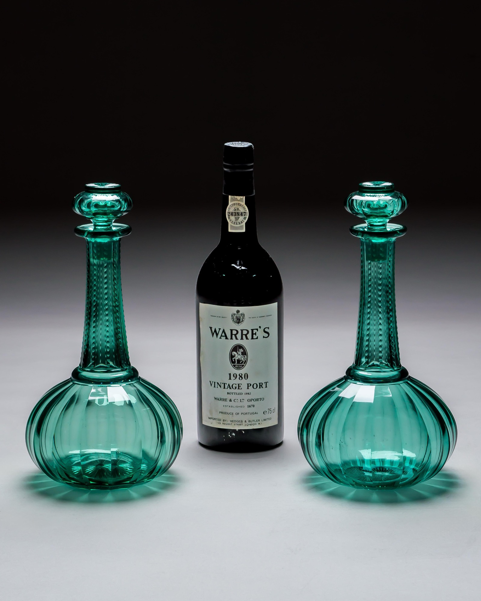 A PAIR OF GREEN SHAFT & GLOBE DECANTERS