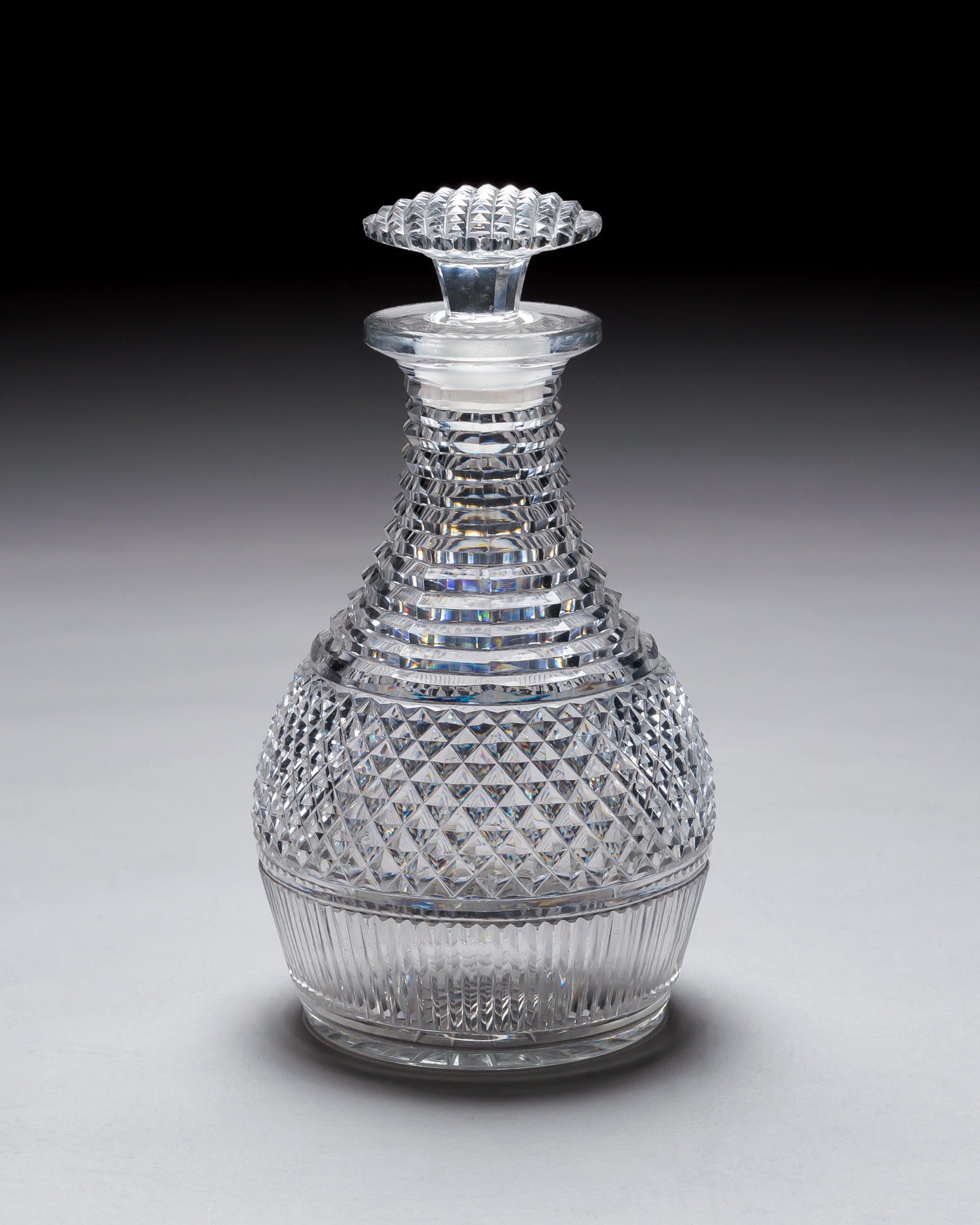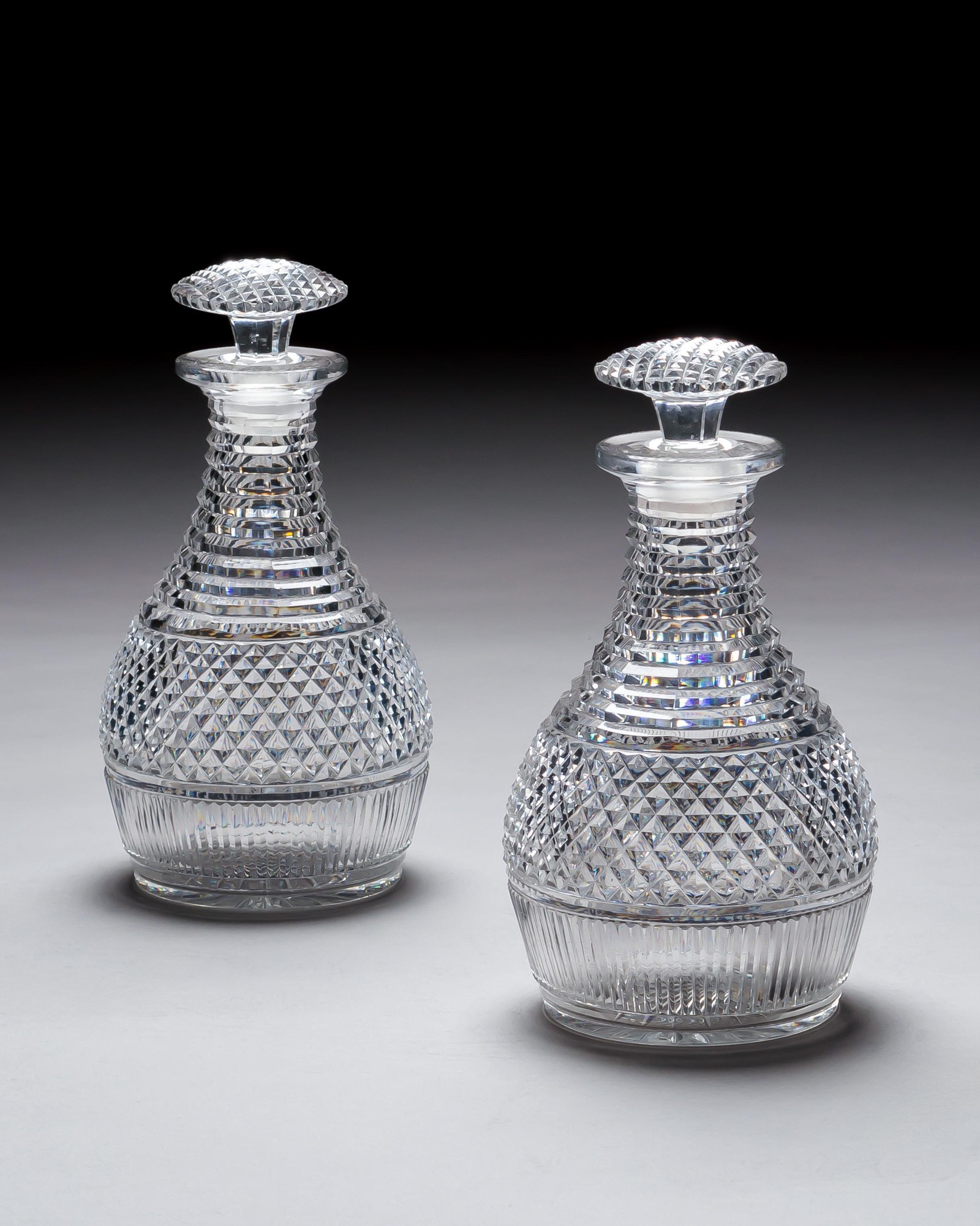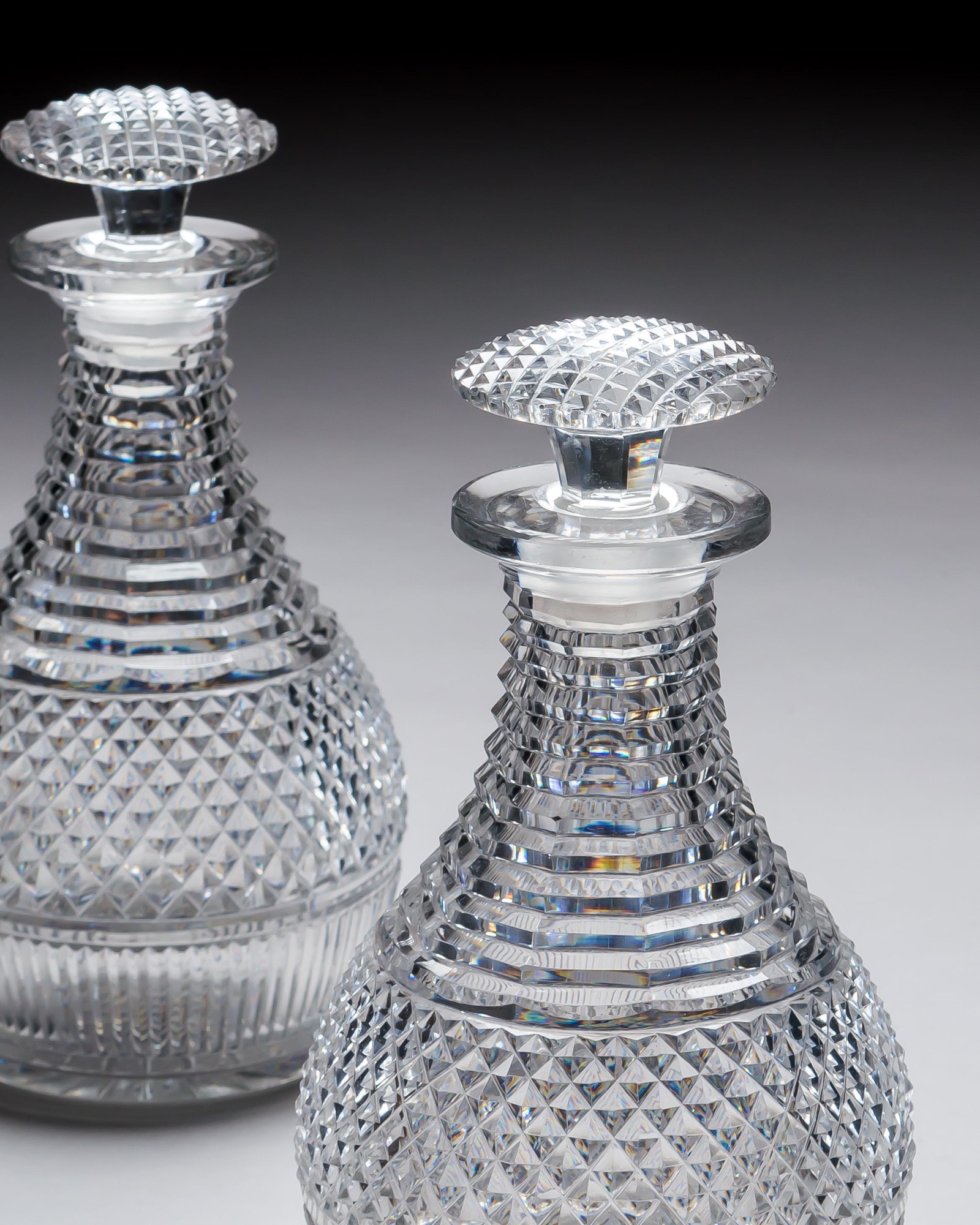 A pair of diamond and step cut Regency decanters with corresponding mushroom stoppers.