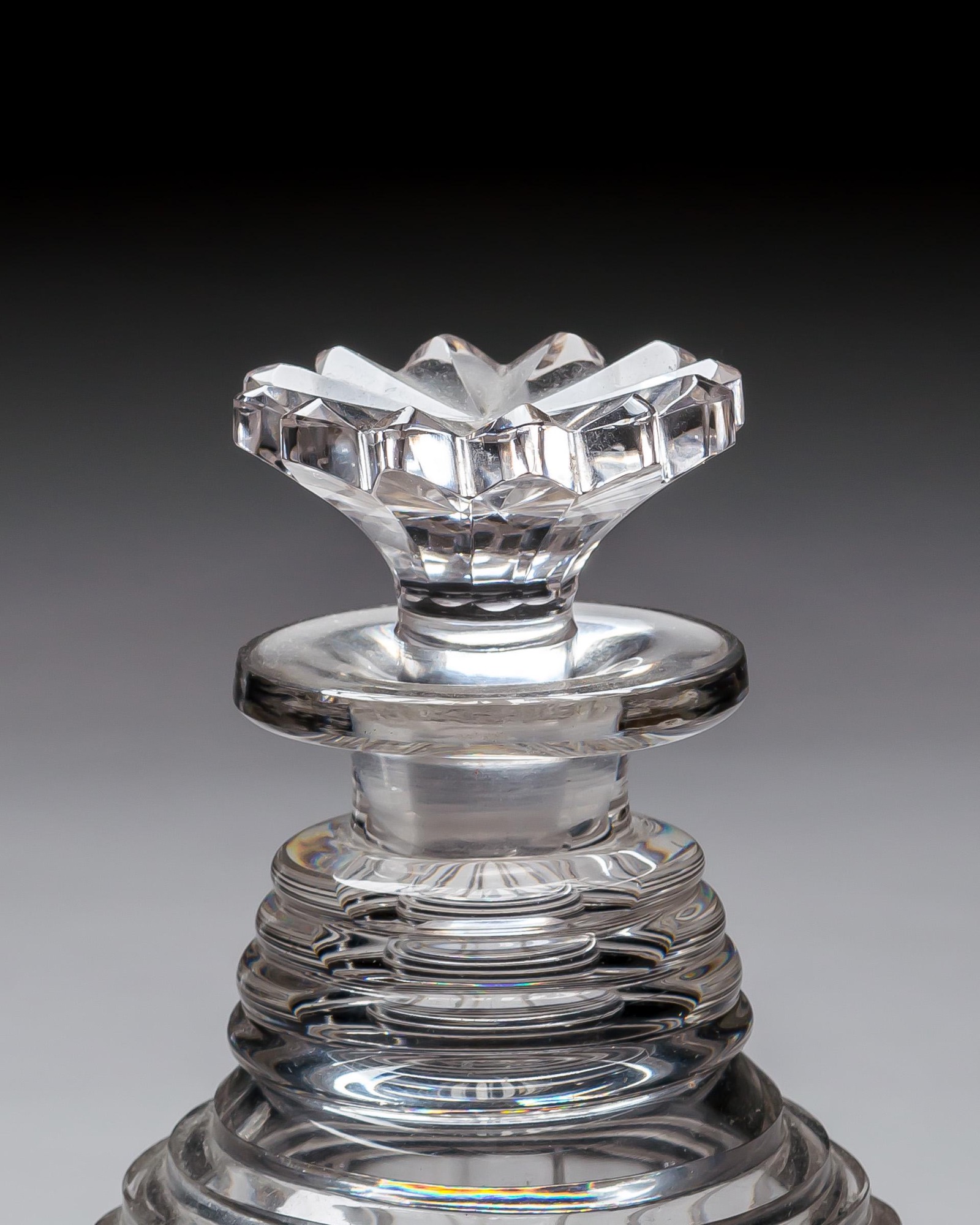 This elegant pair of cut-glass spirit decanters reflects the refined craftsmanship of the William IV period. Cylindrical in form, each features a stepped neck with concentric rings and a striking pillar edge, star cut mushroom stopper. The bodies are decorated with deep pillar cutting that enhances the clarity of the glass, ending in a scalloped base.