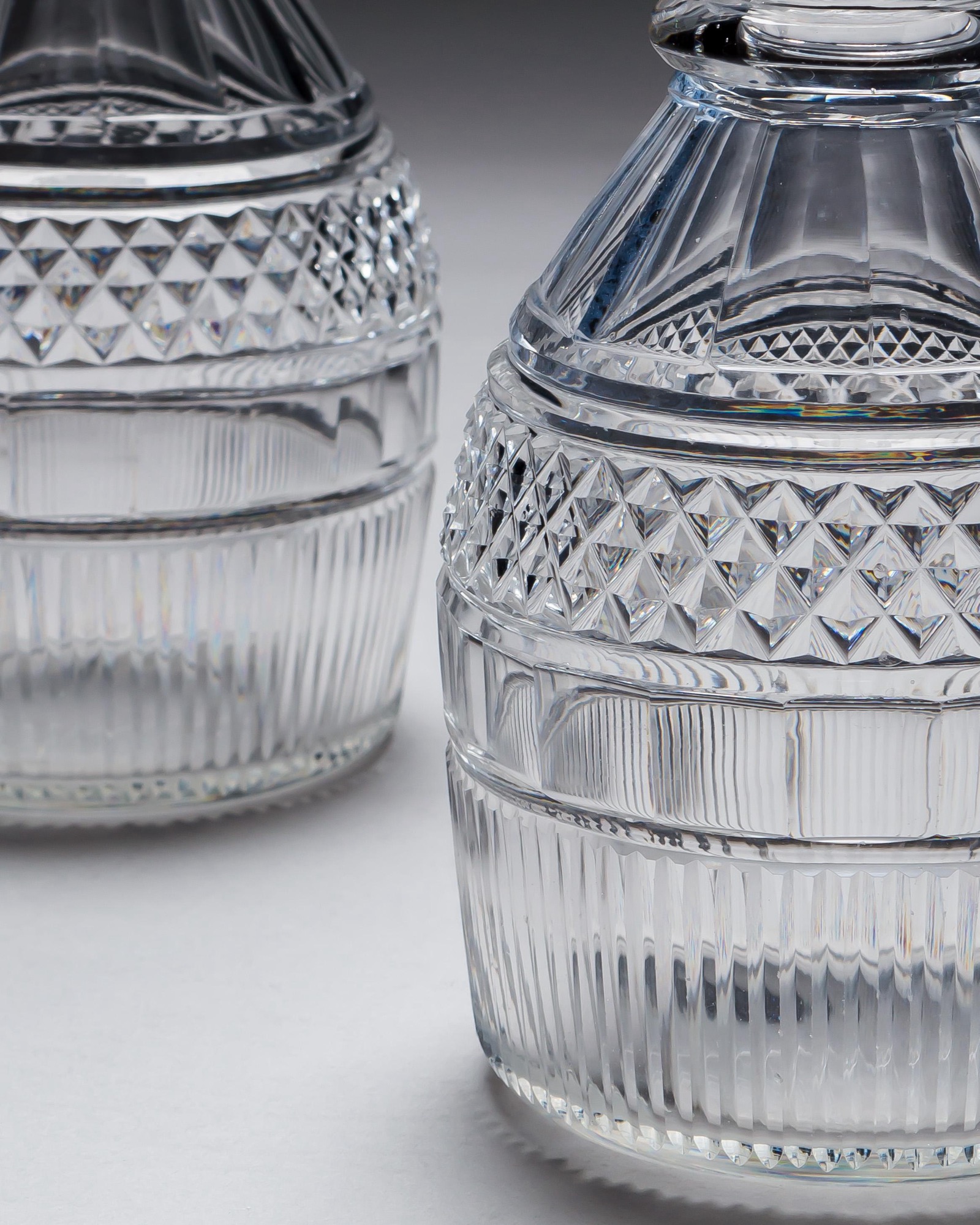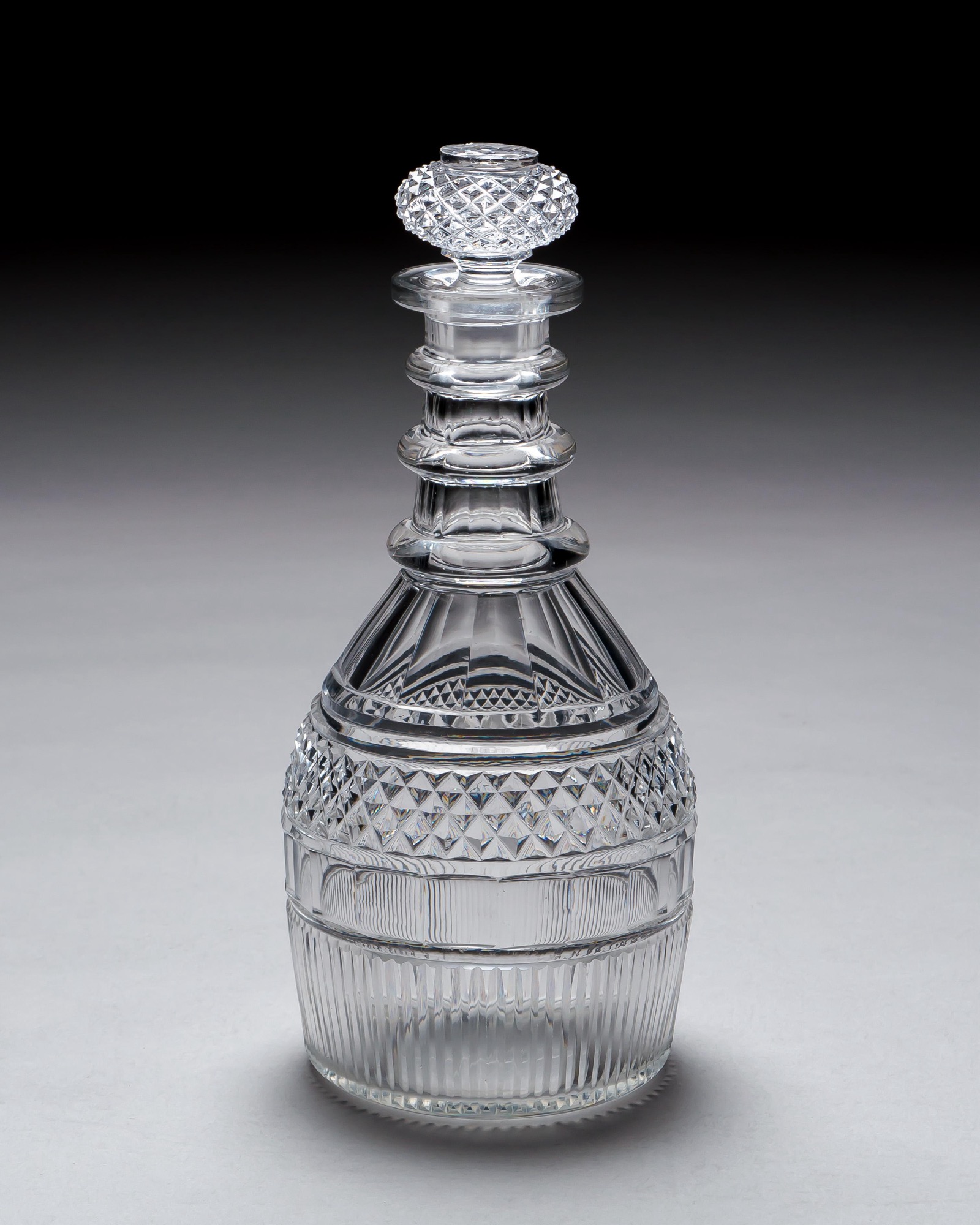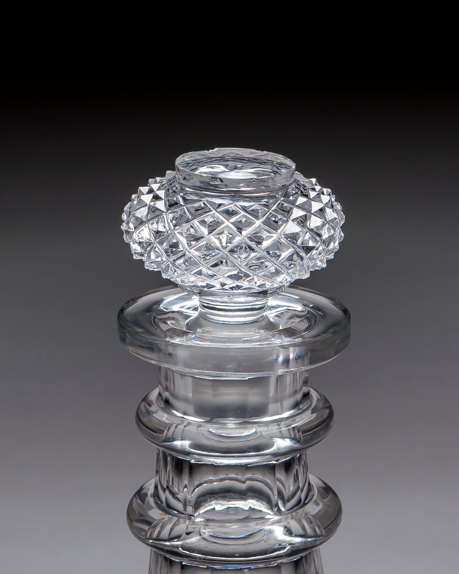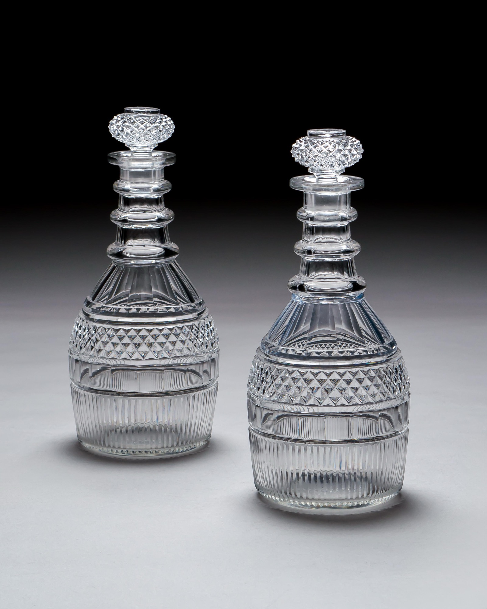 A superb pair of Regency period cut glass decanters, finely executed with a detailed combination of diamond, slice, and prism cutting. Each decanter features a triple ring neck, rising elegantly to a bold, diamond cut, top hat style stopper of striking brilliance.