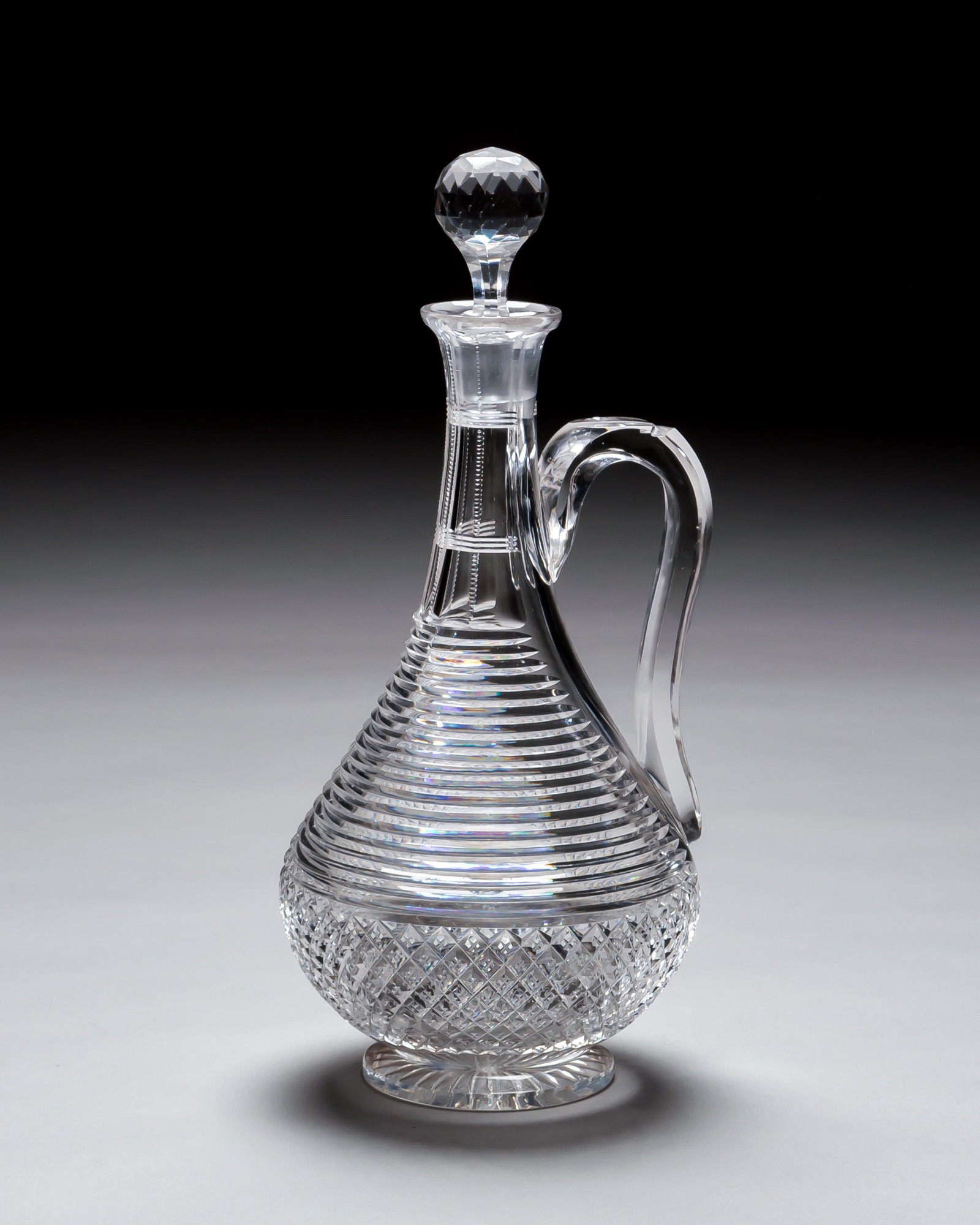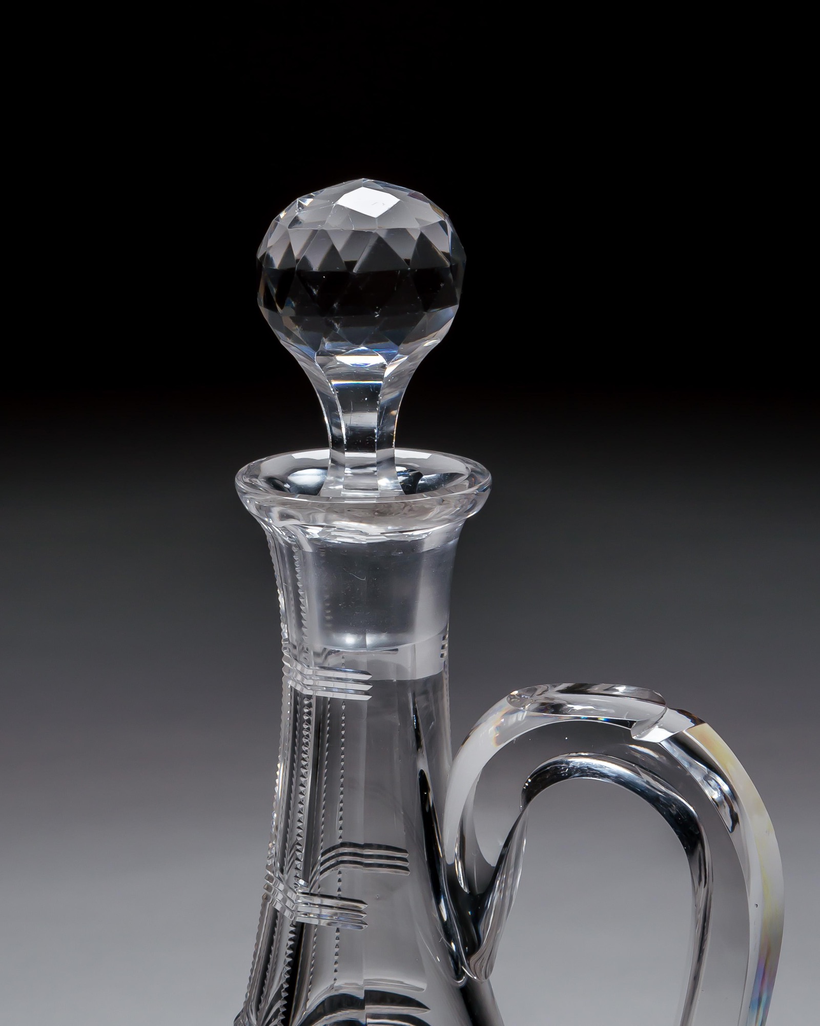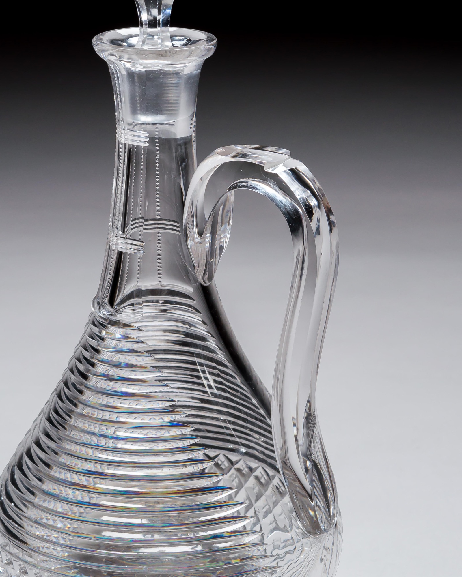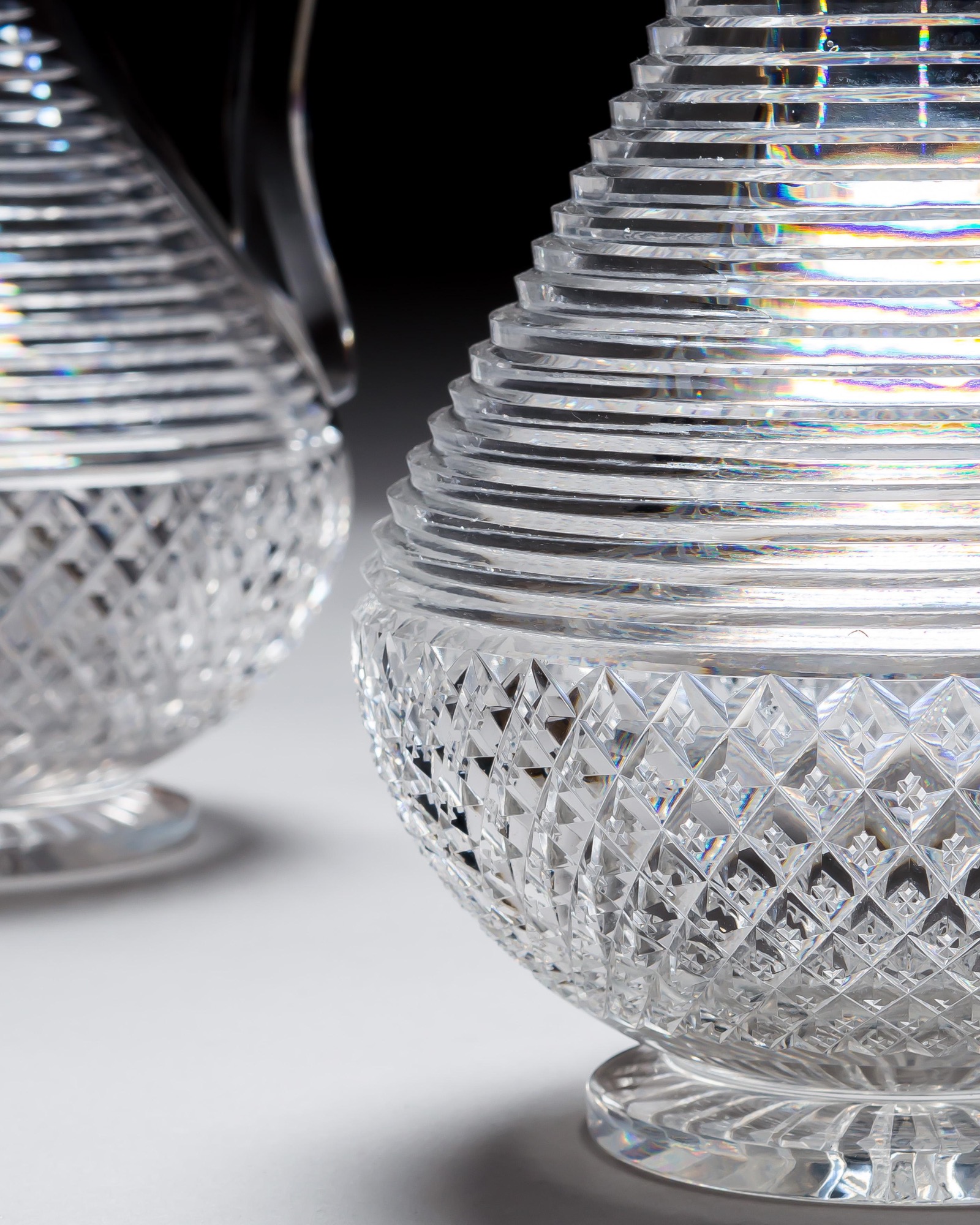 A distinguished pair of Victorian period cut glass vessels, comprising a decanter and a claret jug, each beautifully formed and masterfully cut to capture the elegance and precision of mid 19th century craftsmanship. The bodies are of graceful teardrop form, finely decorated with bands of horizontal step cutting above richly executed cross over diamond-cut panels, creating a play of texture that speaks to the glassmaker's skill. The necks are surmounted by faceted ball stoppers that echo the rhythm of the design below. The jug, with its sweeping applied handle, completes the pair with sculptural balance and utility.