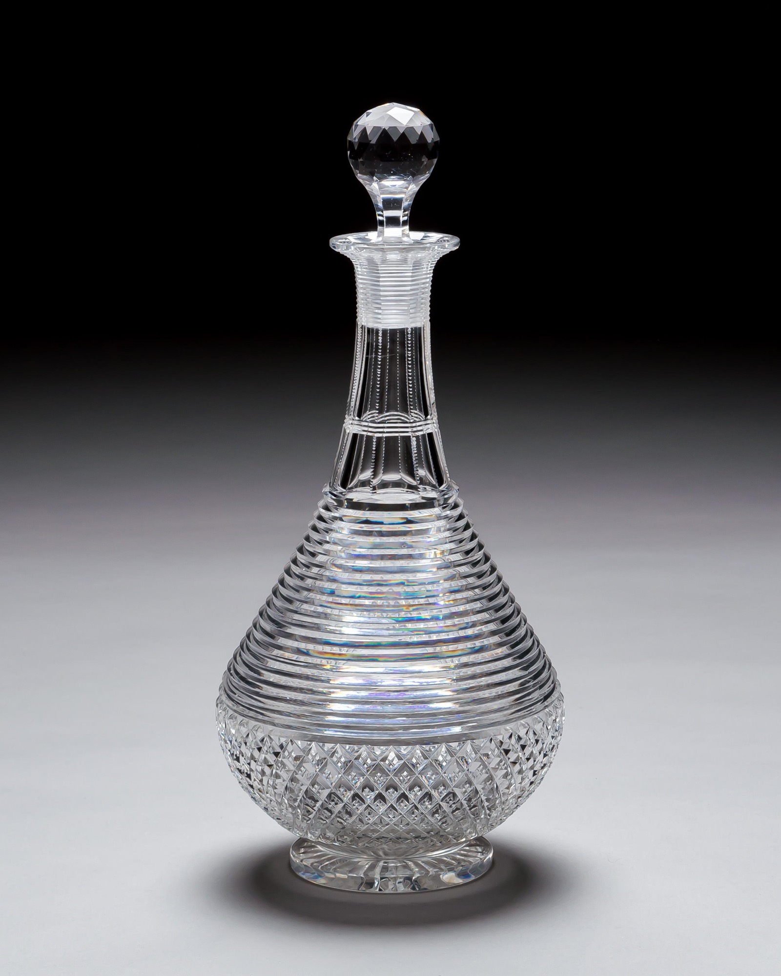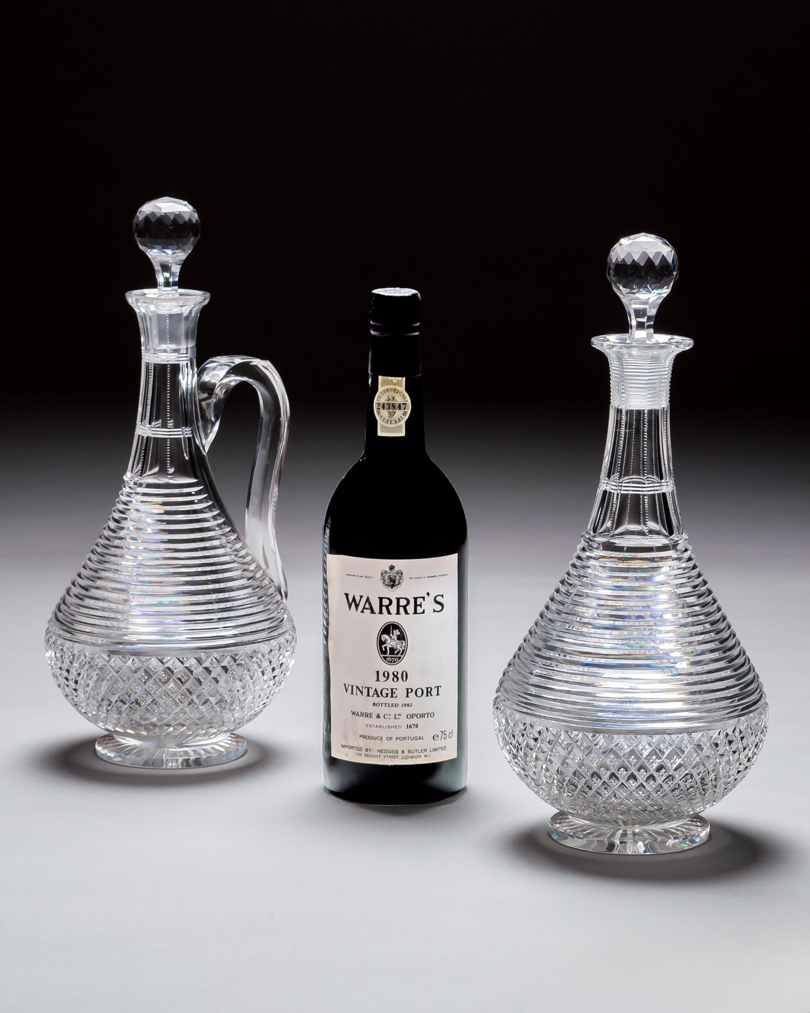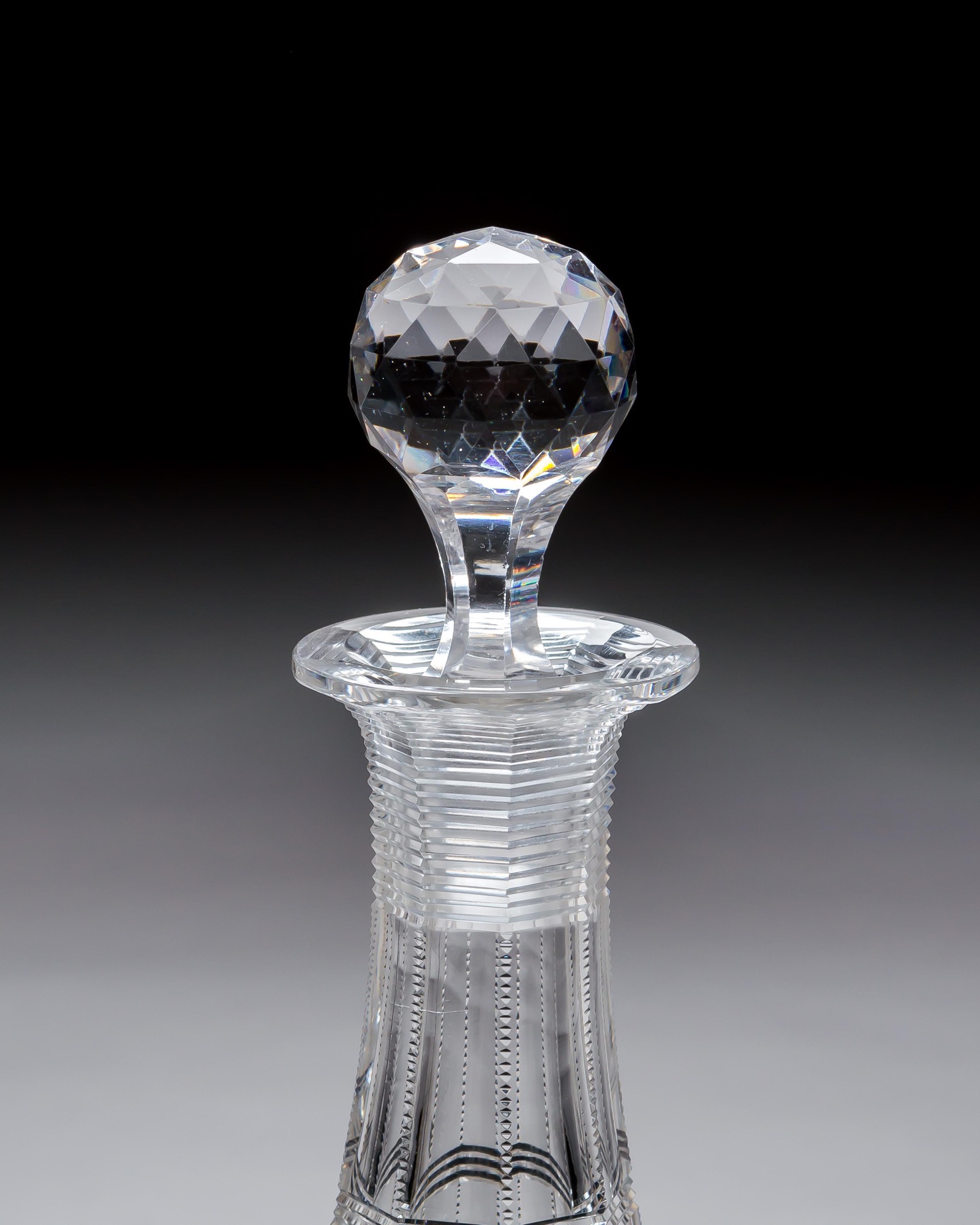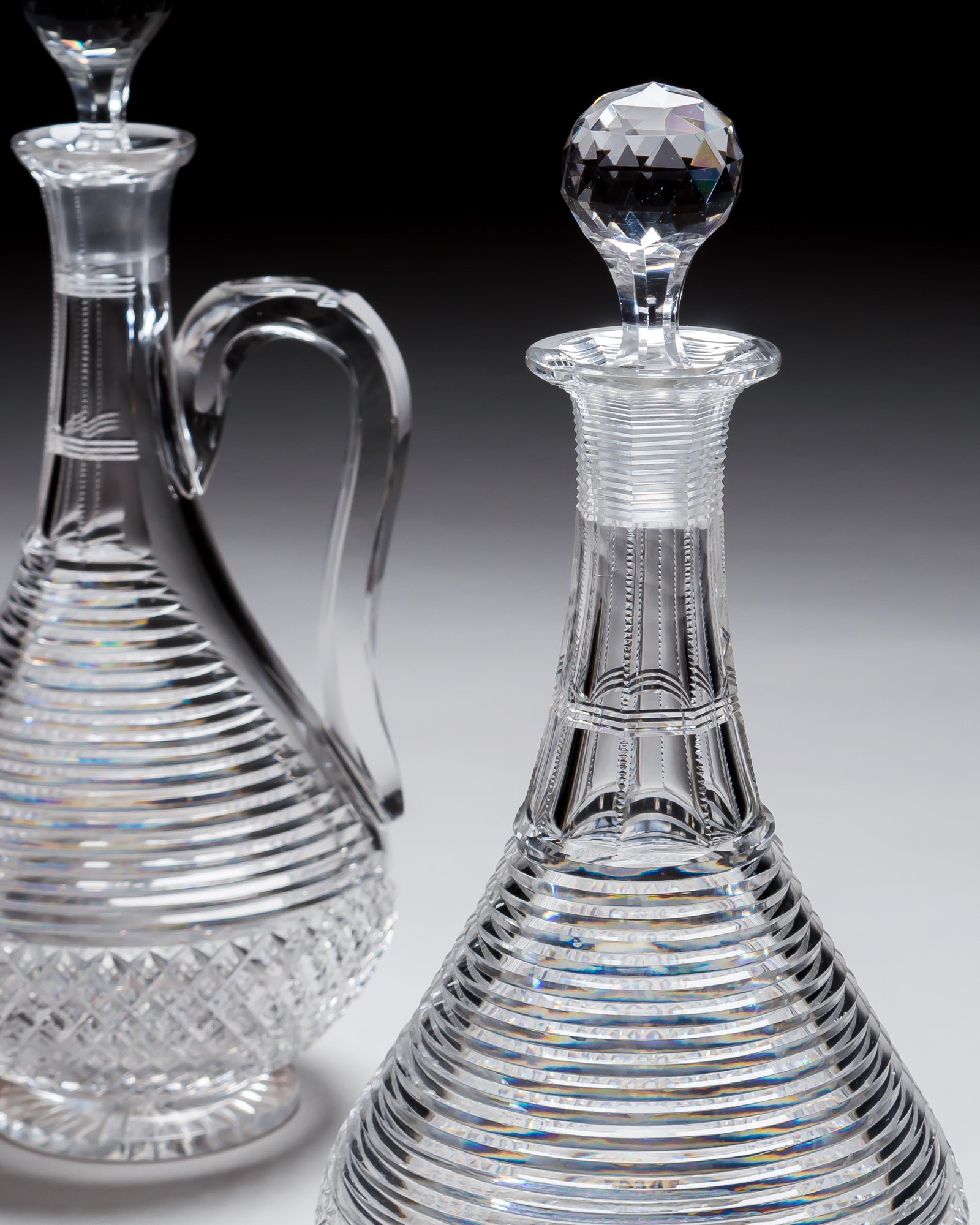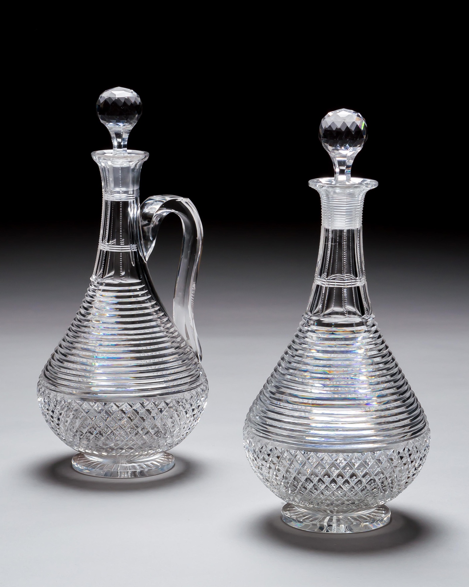 A distinguished pair of Victorian period cut glass vessels, comprising a decanter and a claret jug, each beautifully formed and masterfully cut to capture the elegance and precision of mid 19th century craftsmanship. The bodies are of graceful teardrop form, finely decorated with bands of horizontal step cutting above richly executed cross over diamond-cut panels, creating a play of texture that speaks to the glassmaker's skill. The necks are surmounted by faceted ball stoppers that echo the rhythm of the design below. The jug, with its sweeping applied handle, completes the pair with sculptural balance and utility.