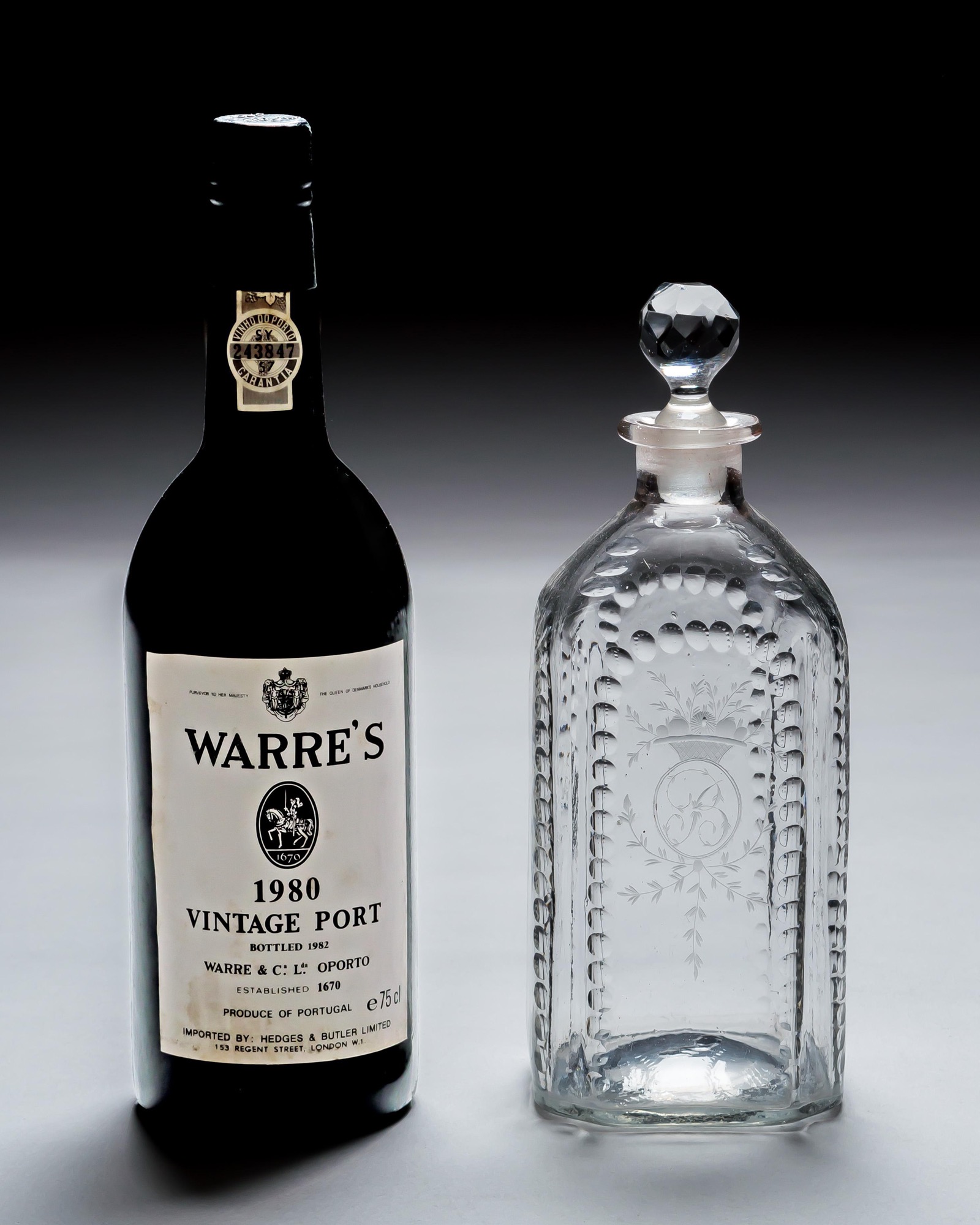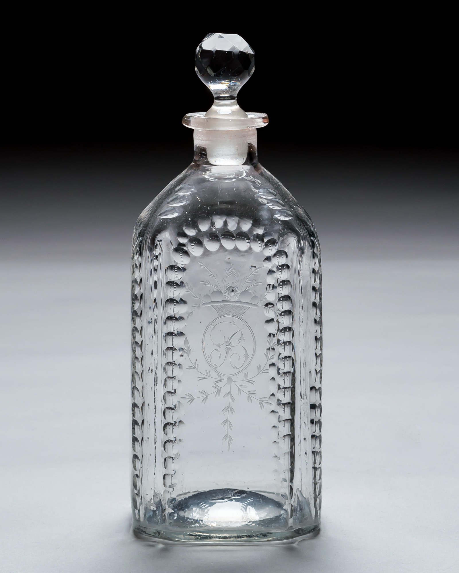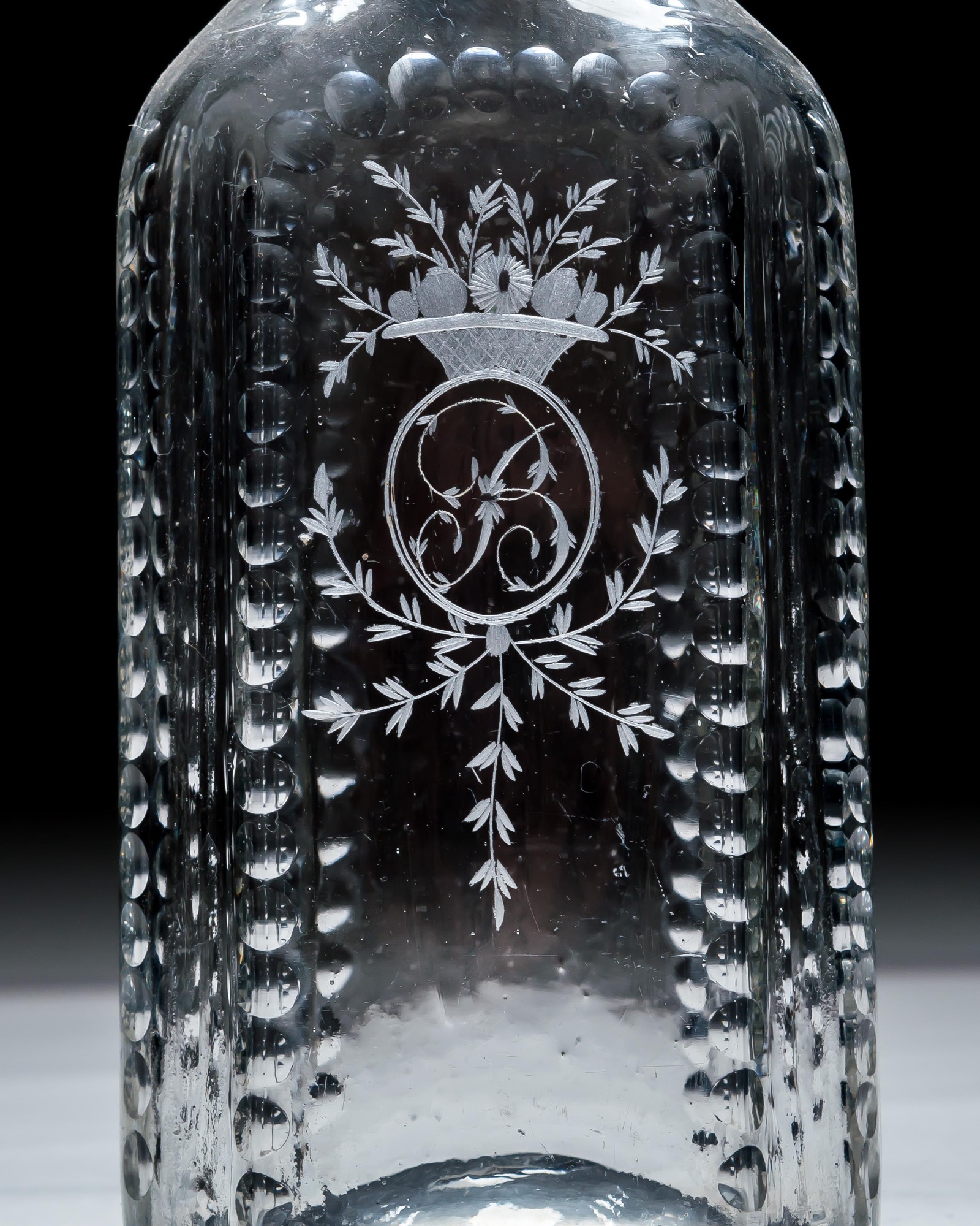 The square body, softened at the shoulders, is adorned with four panels of notch cut moulding. The front panel features a finely engraved motif of a floral-filled basket, beneath which a central medallion bears an elegant monogram, delicately framed by cascading foliage. The faceted stopper, cut with precision, complements the geometric form of the decanter. Elegant yet unpretentious, this decanter captures the refinement of Georgian glass design.