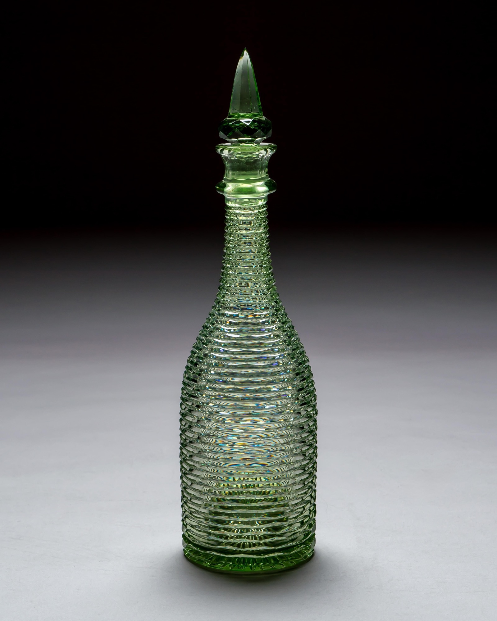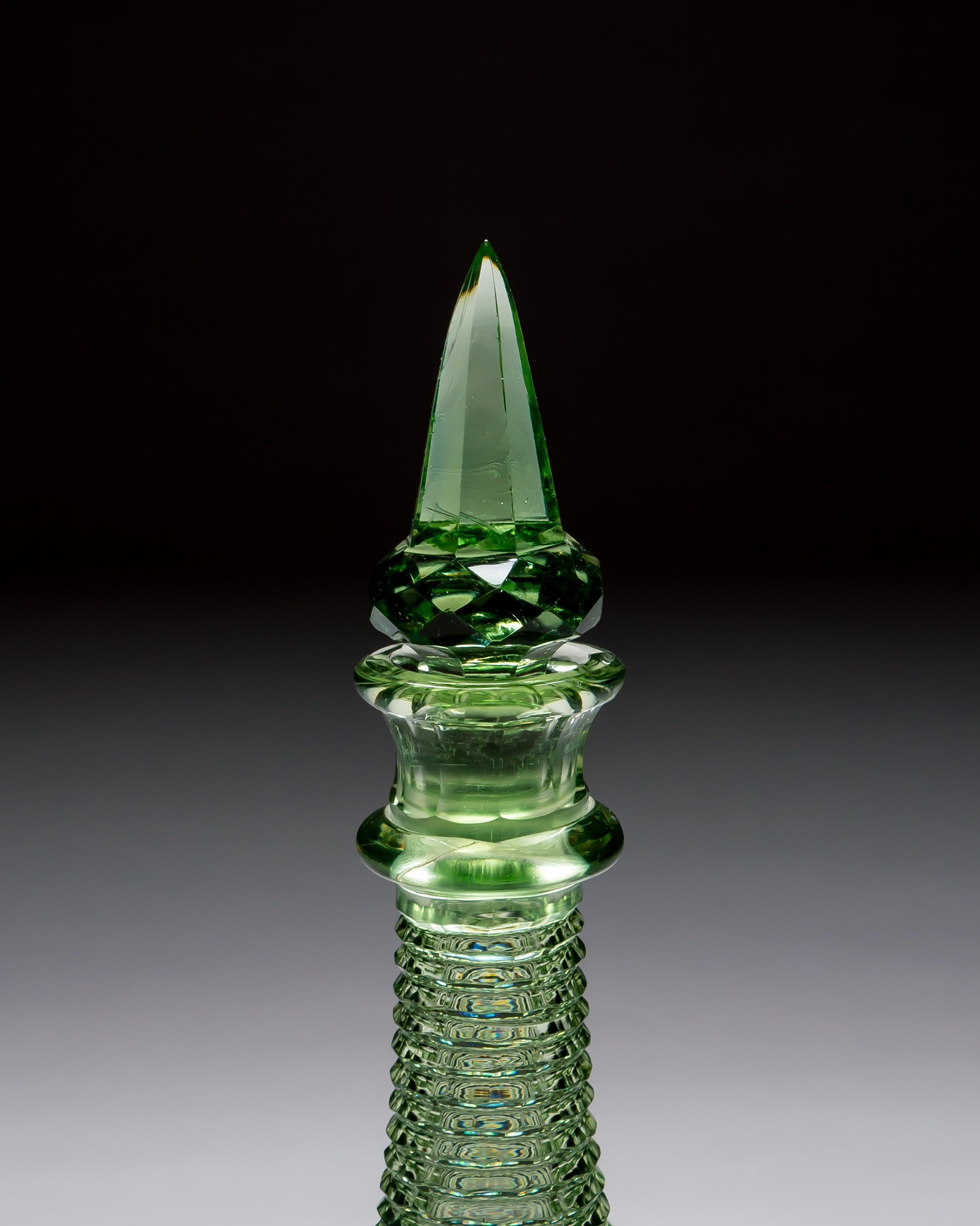 A tall green glass decanter with prism cut body and neck, star cut base and fitted with facet cut spire stopper.