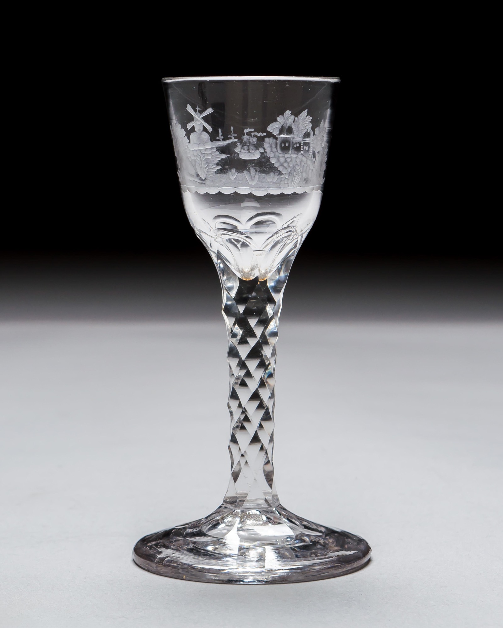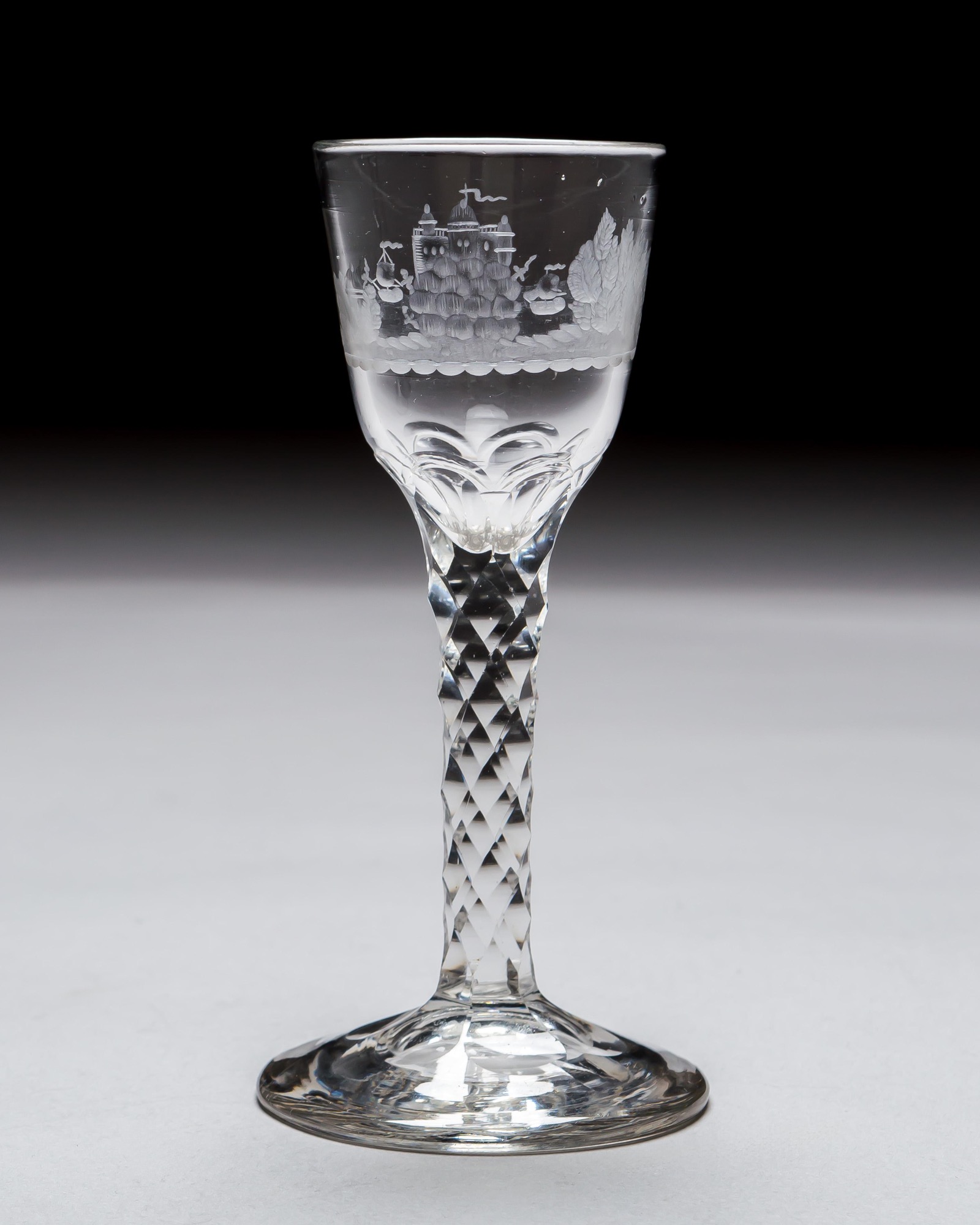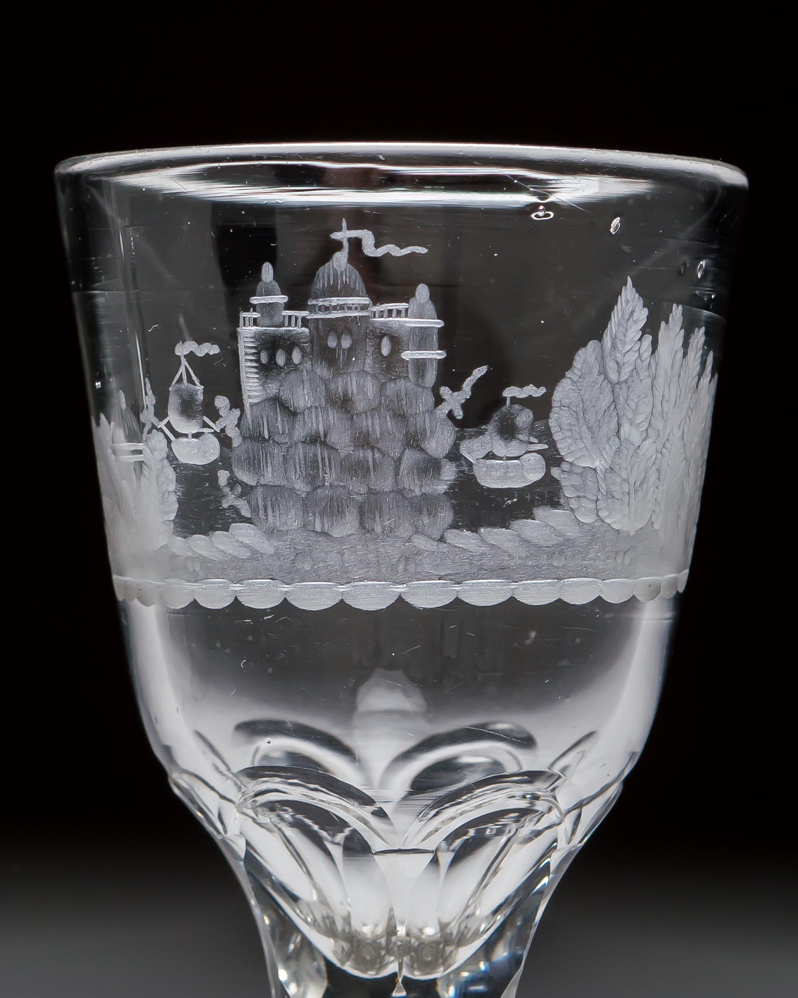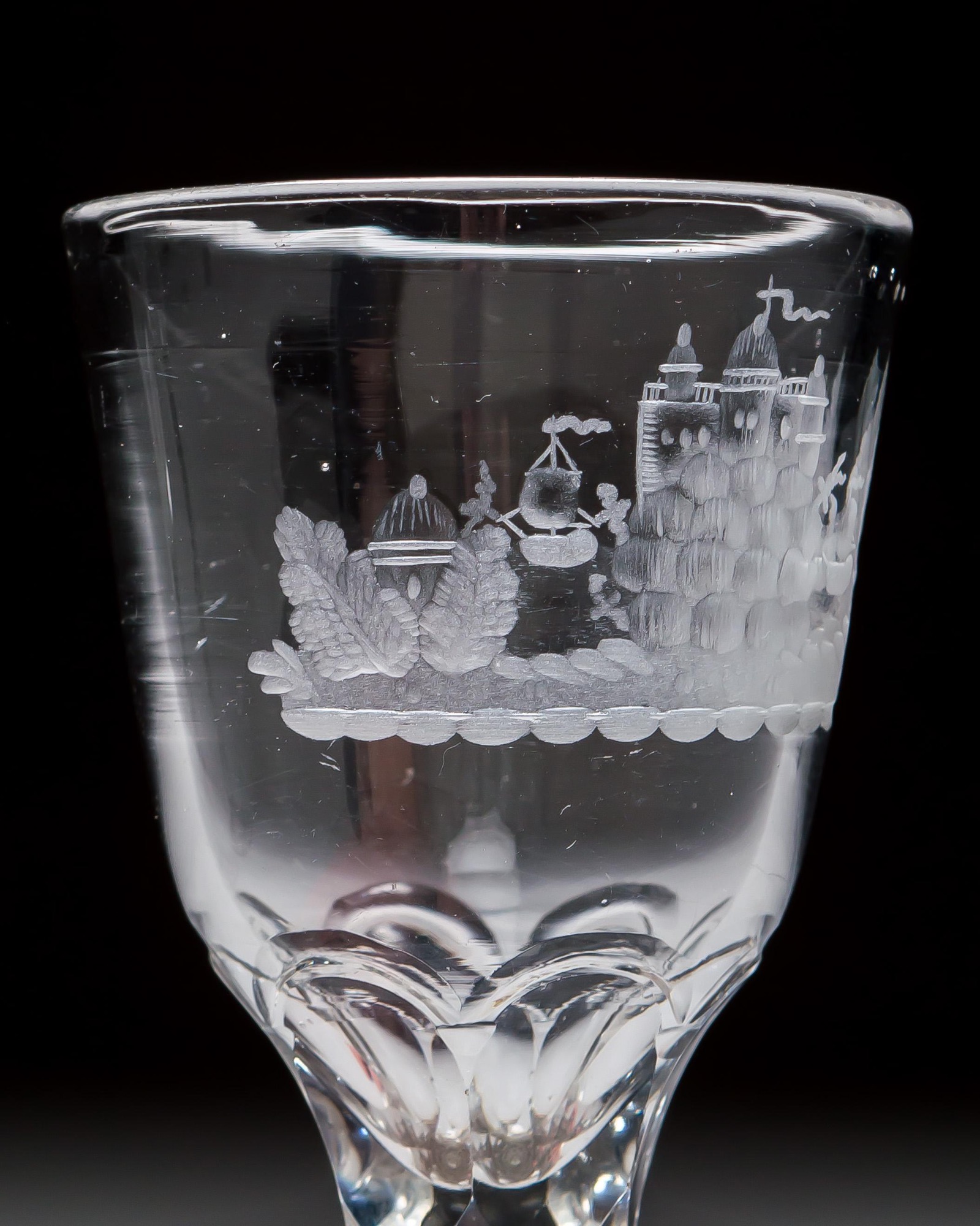 A fine pair of facet stem wines with cut and engraved decoration depicting scenes of castles and ships.