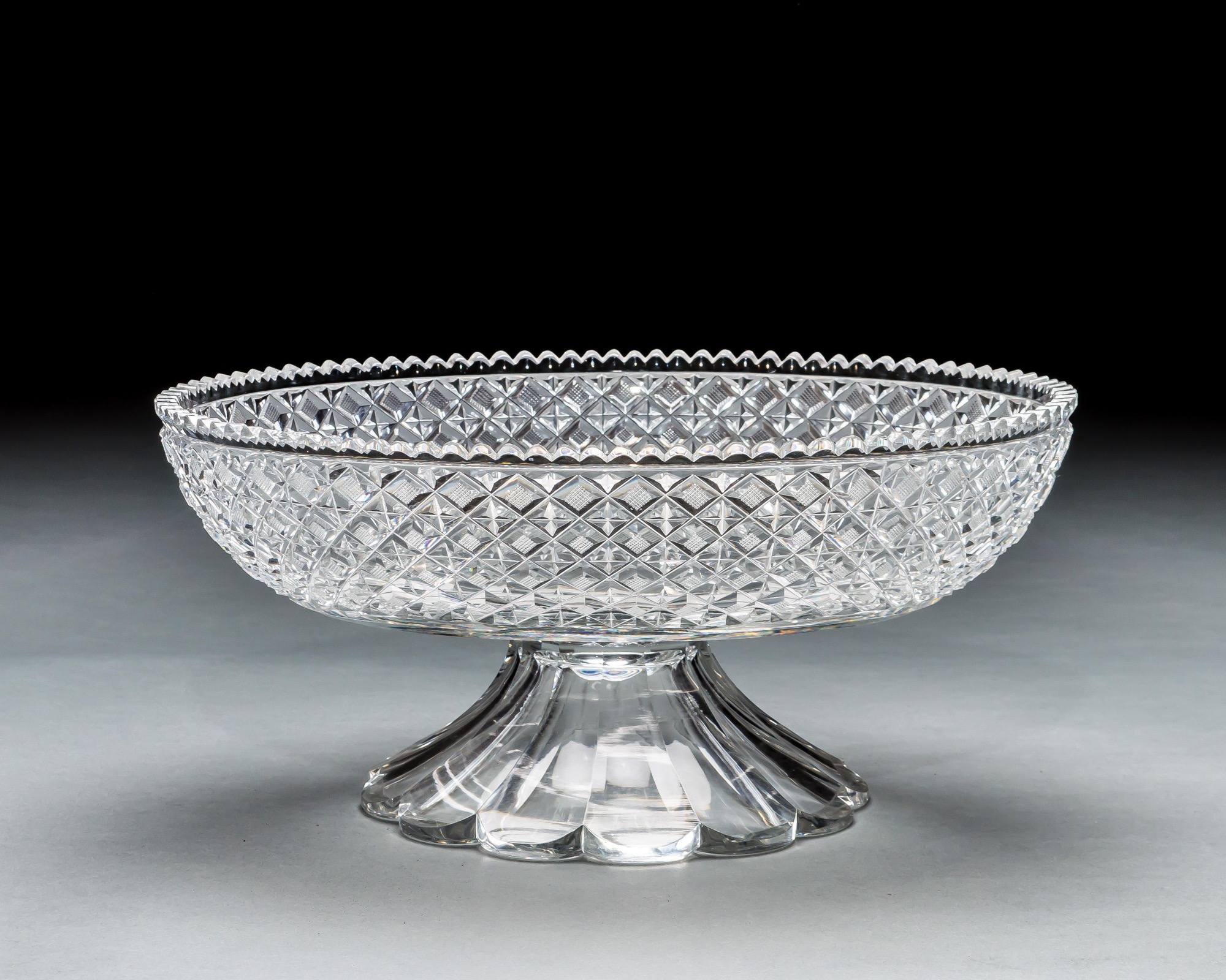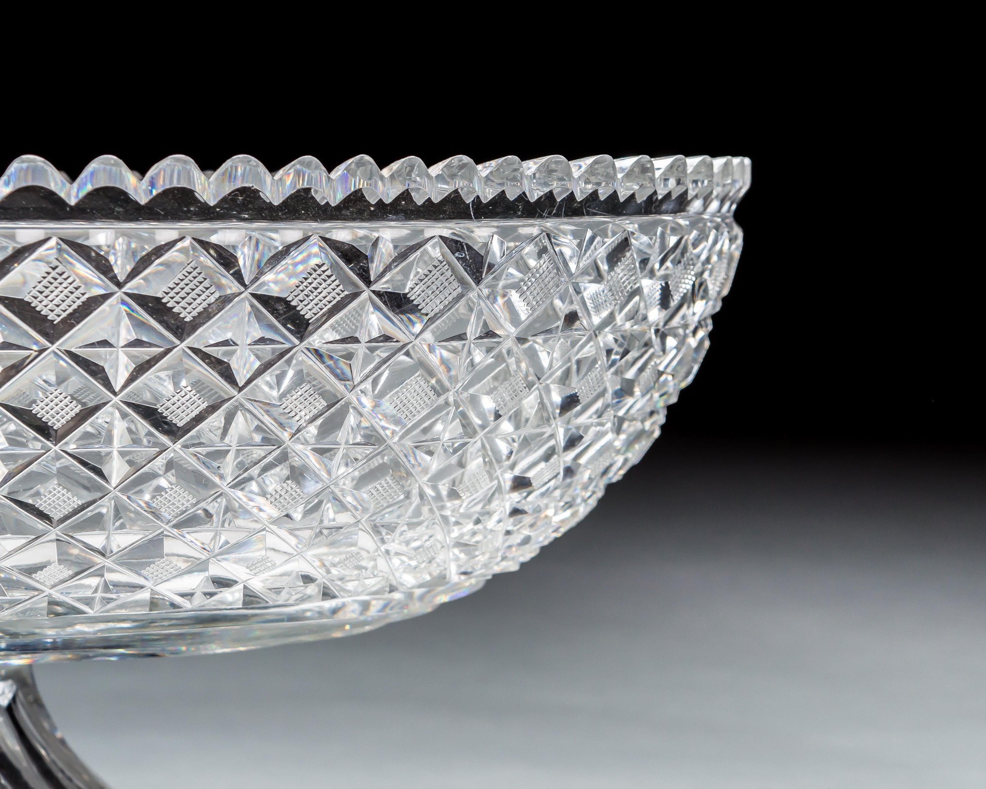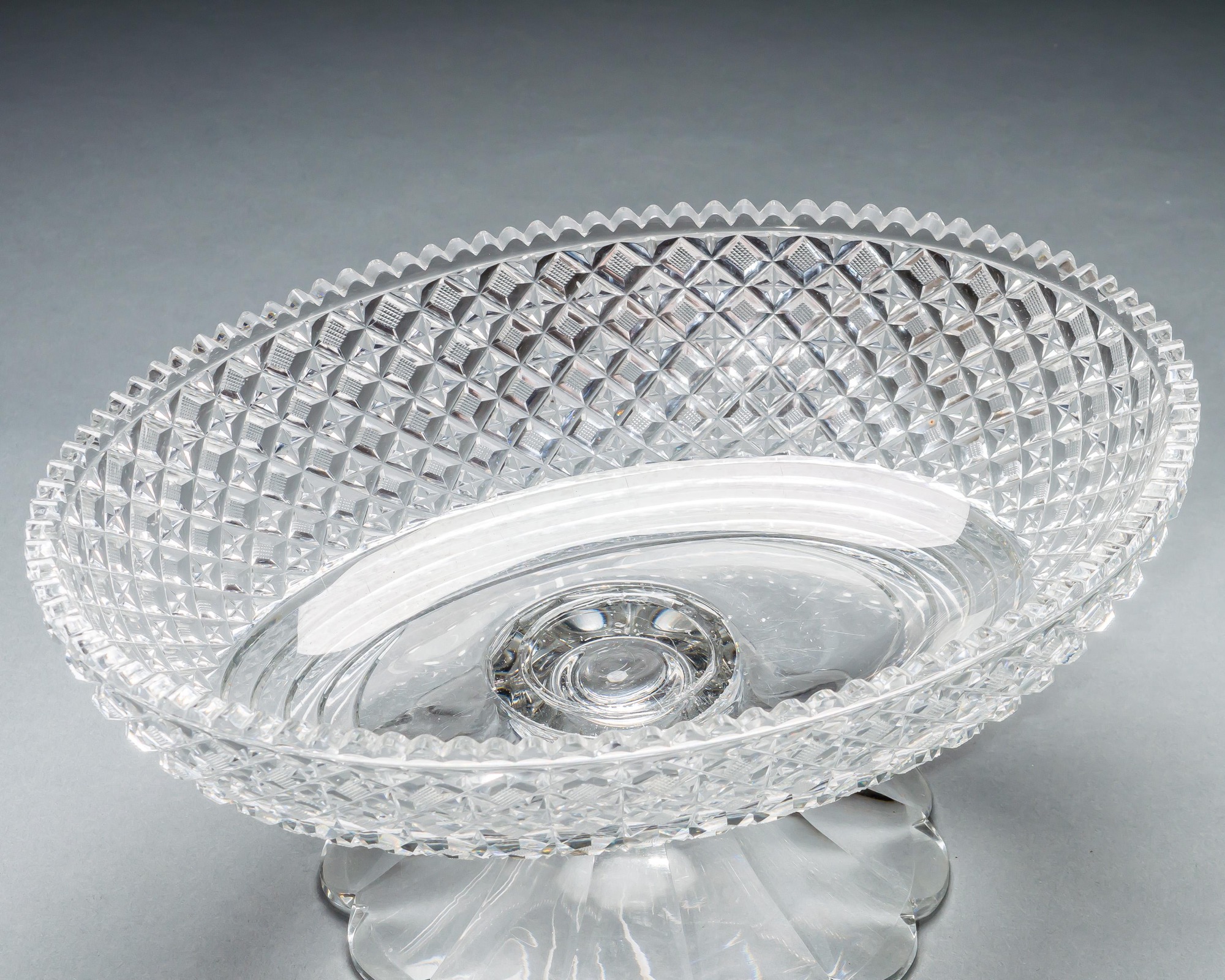 A large oval strawberry diamond cut pedestal bowl.