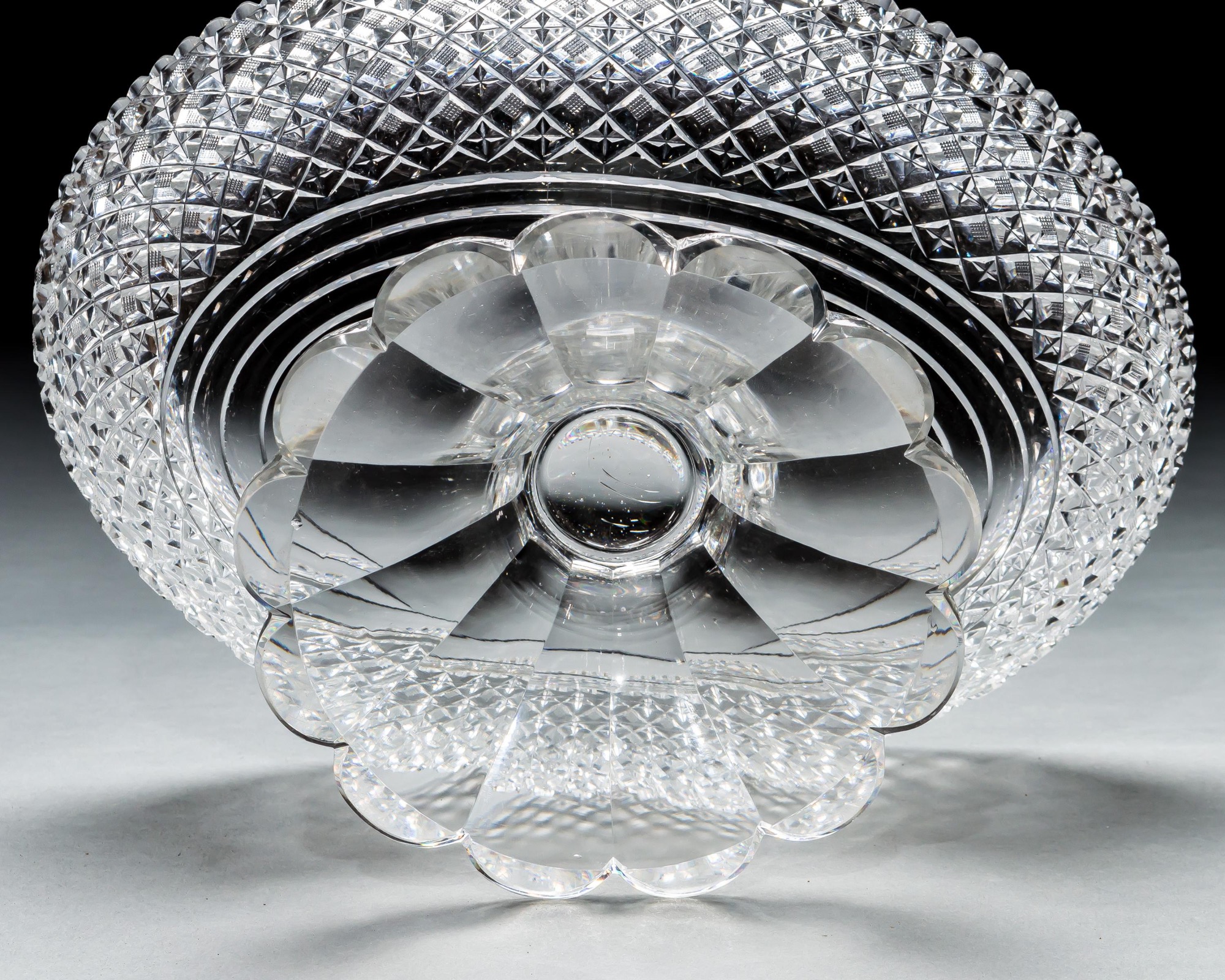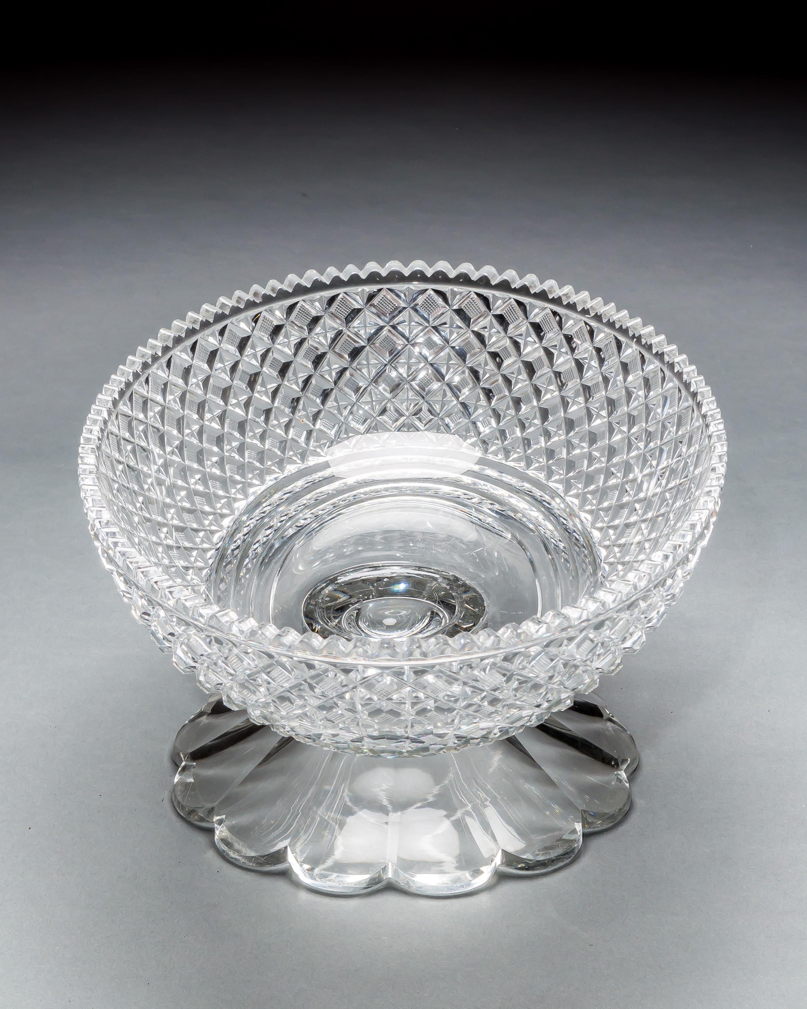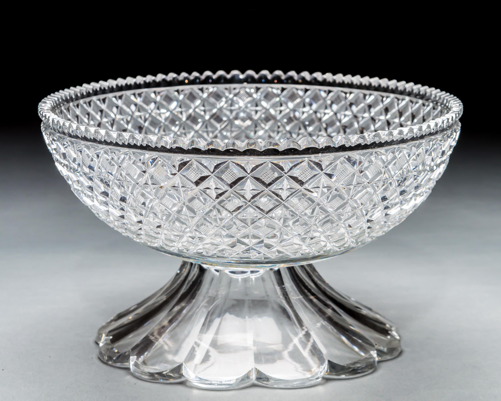 A large oval strawberry diamond cut pedestal bowl.