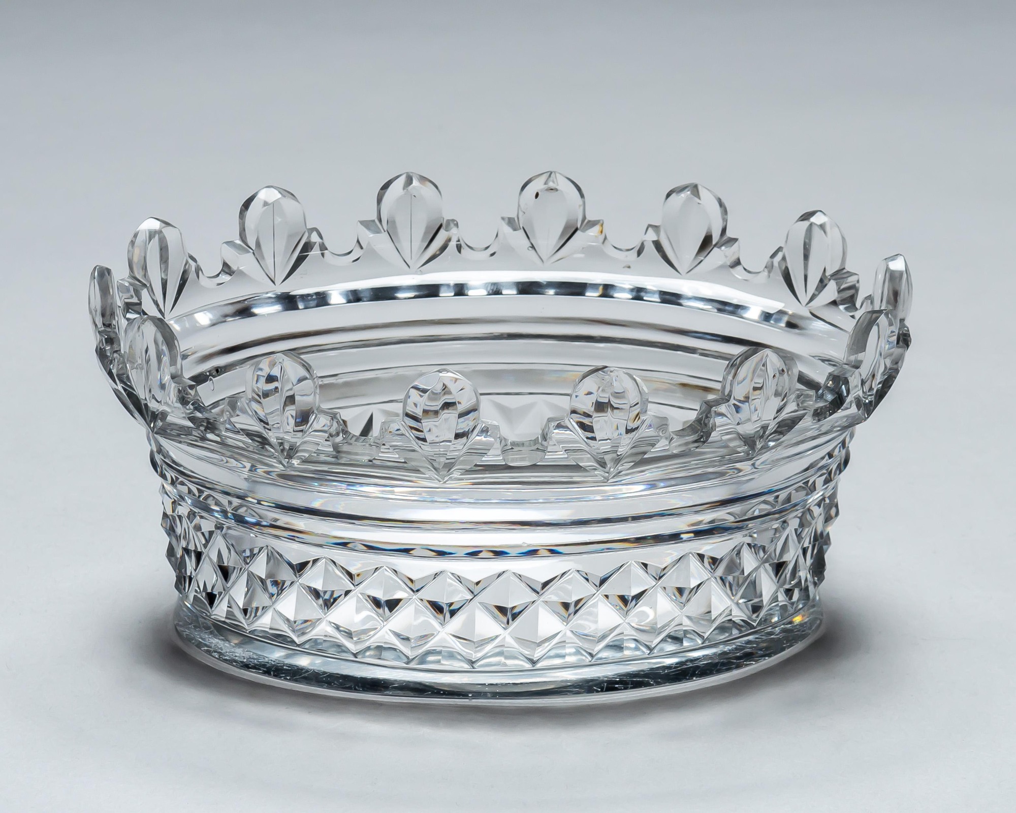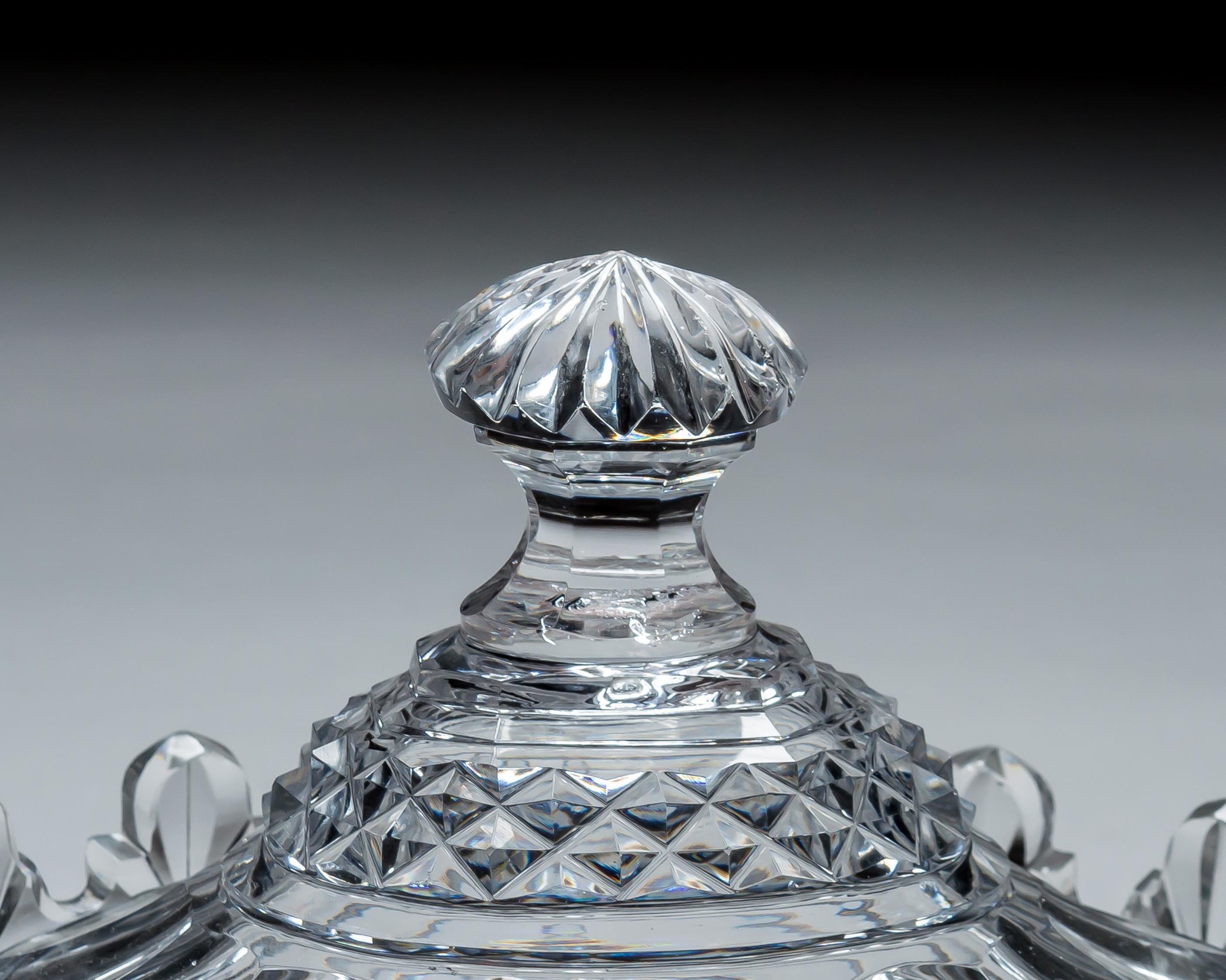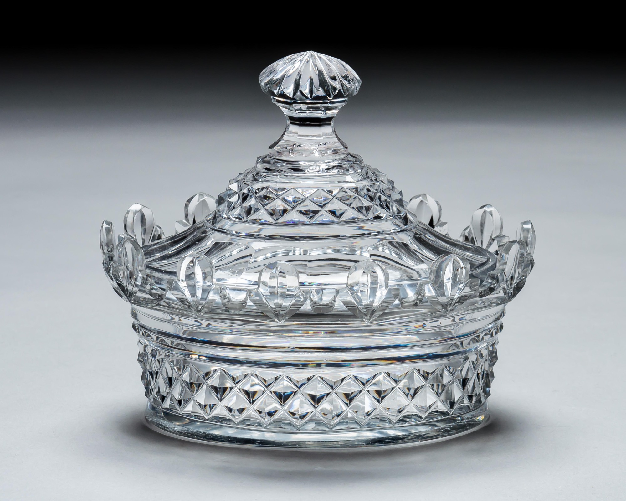 This finely crafted piece dazzles with its intricate diamond cutting and alternating horizontal bands of mitre cutting. The lid is crowned with a faceted knop finial, while both the dish and base are encircled by a crown-like border of van-dyke rims, lending a regal air to its form.
