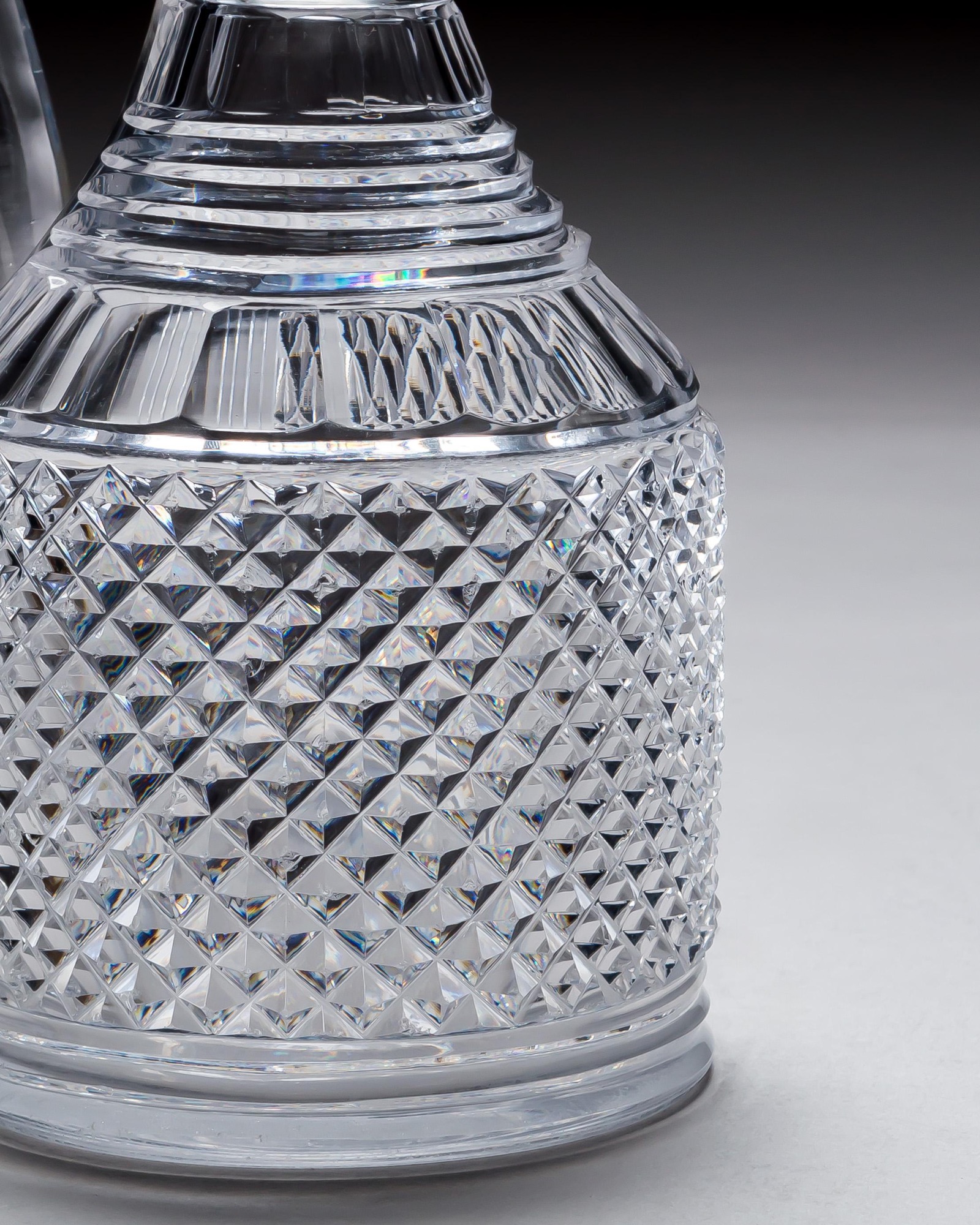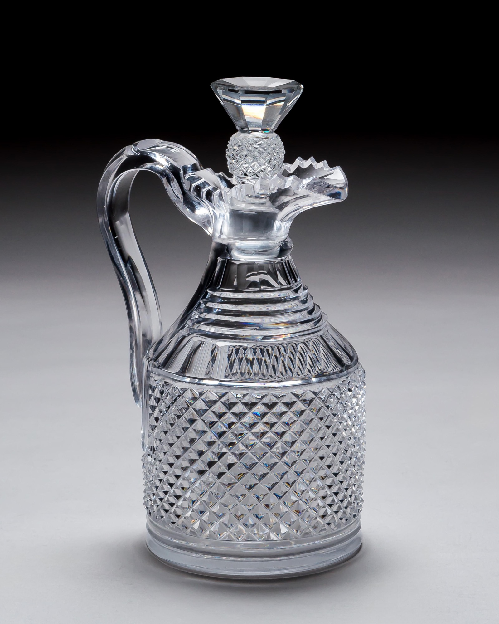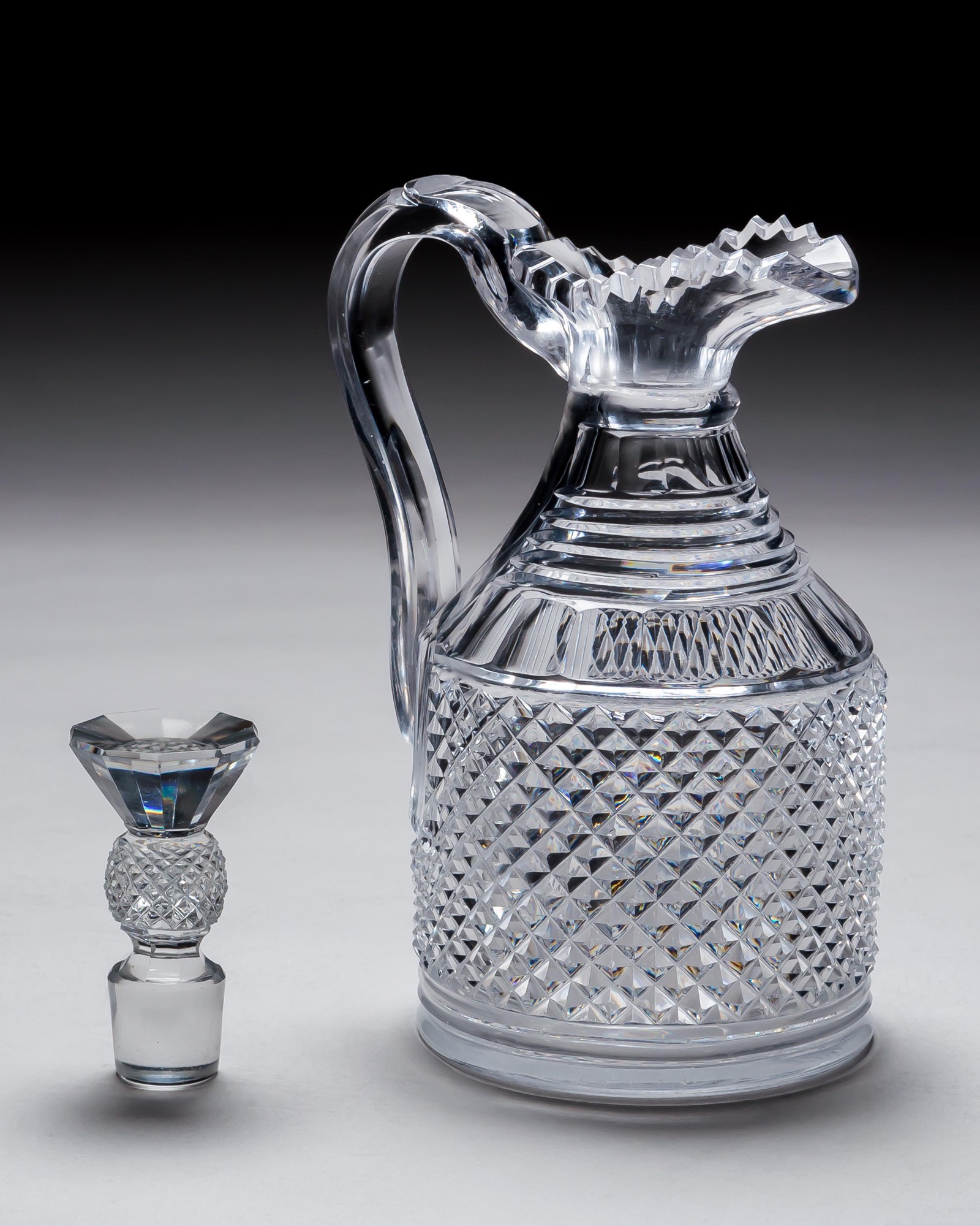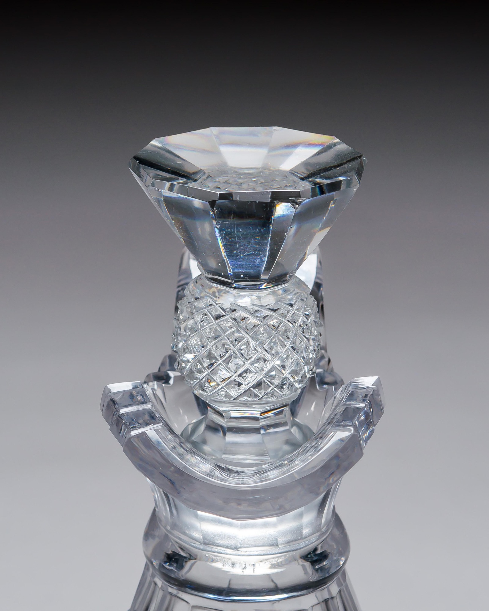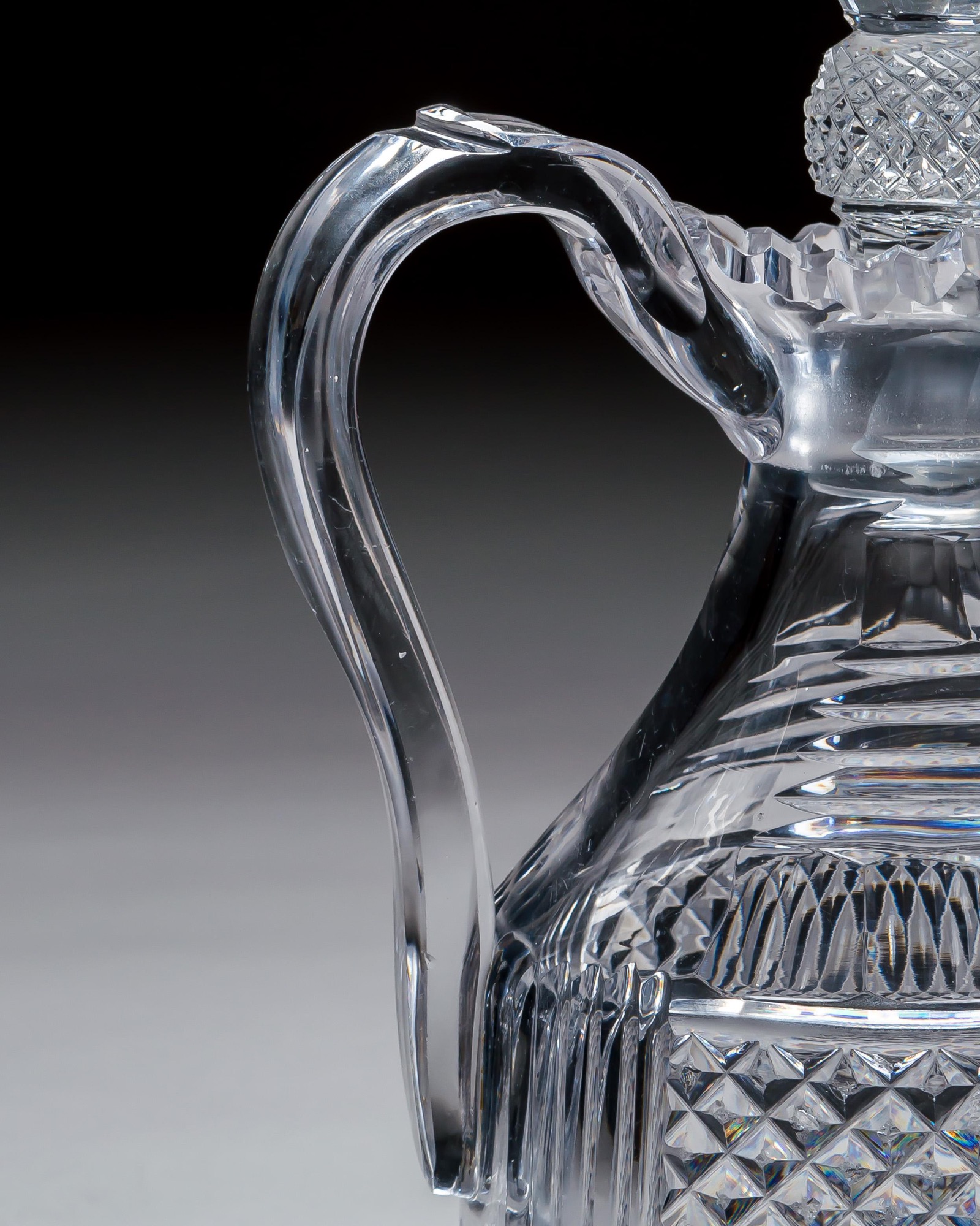 A Regency claret jug with diamond cut body, slice and step cut neck, fitted with diamond cut, thistle shaped stopper.