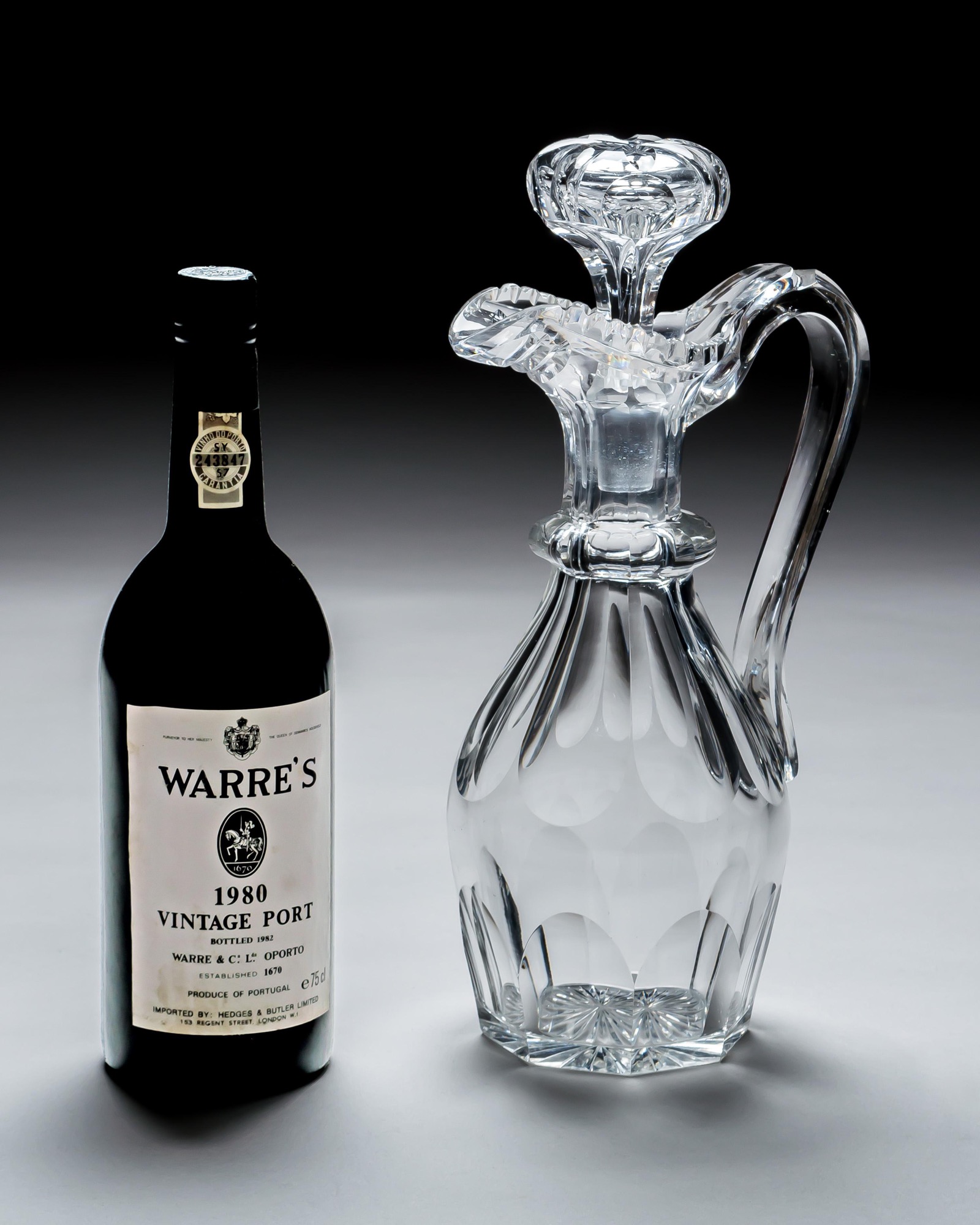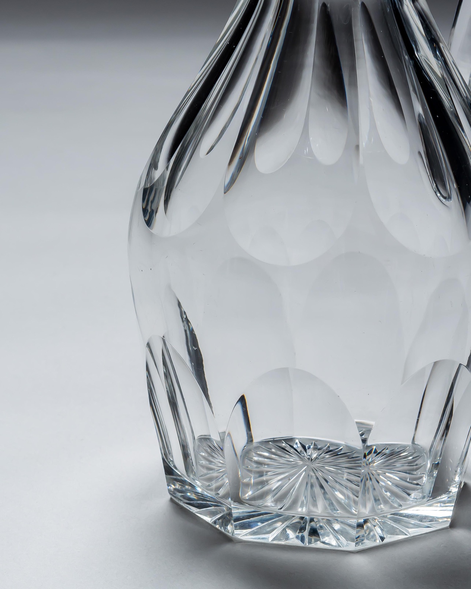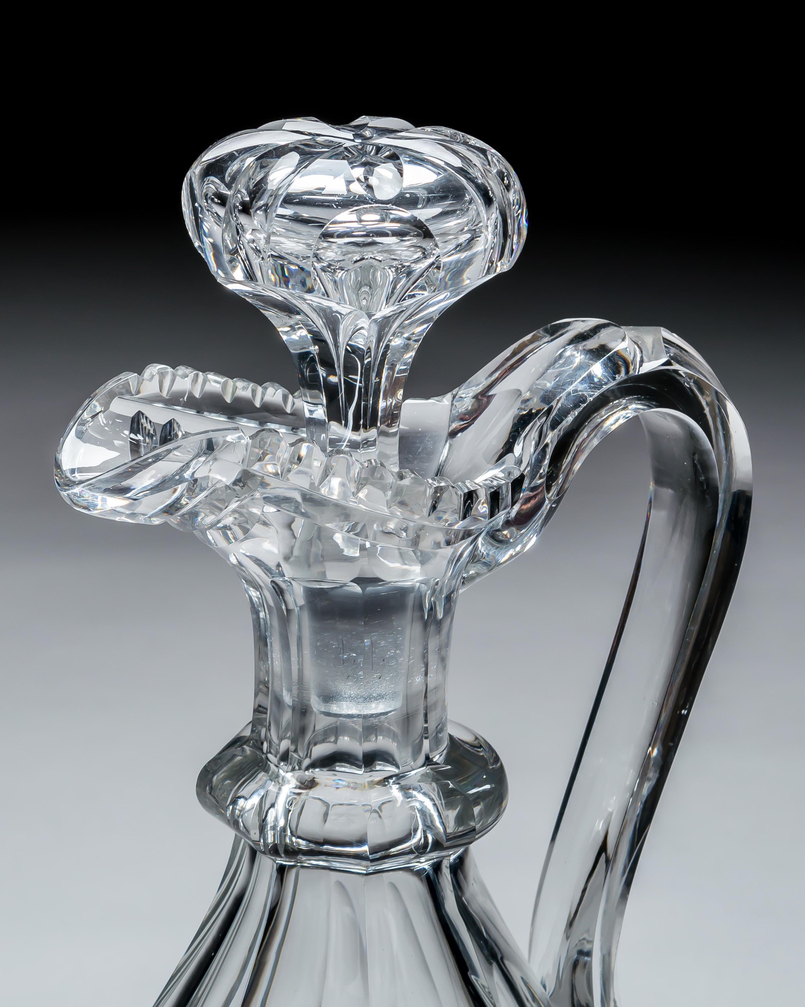 The elegantly waisted body is panel-cut with broad flutes that rise gracefully from a star-cut base, capturing and refracting the light in subtle harmony. The neck leads to scolloped rim and a finely applied loop handle of sweeping proportion. The jug is crowned with an intricate mushroom stopper, deeply cut to echo the jug's geometric precision and adding a note of sculptural brilliance.