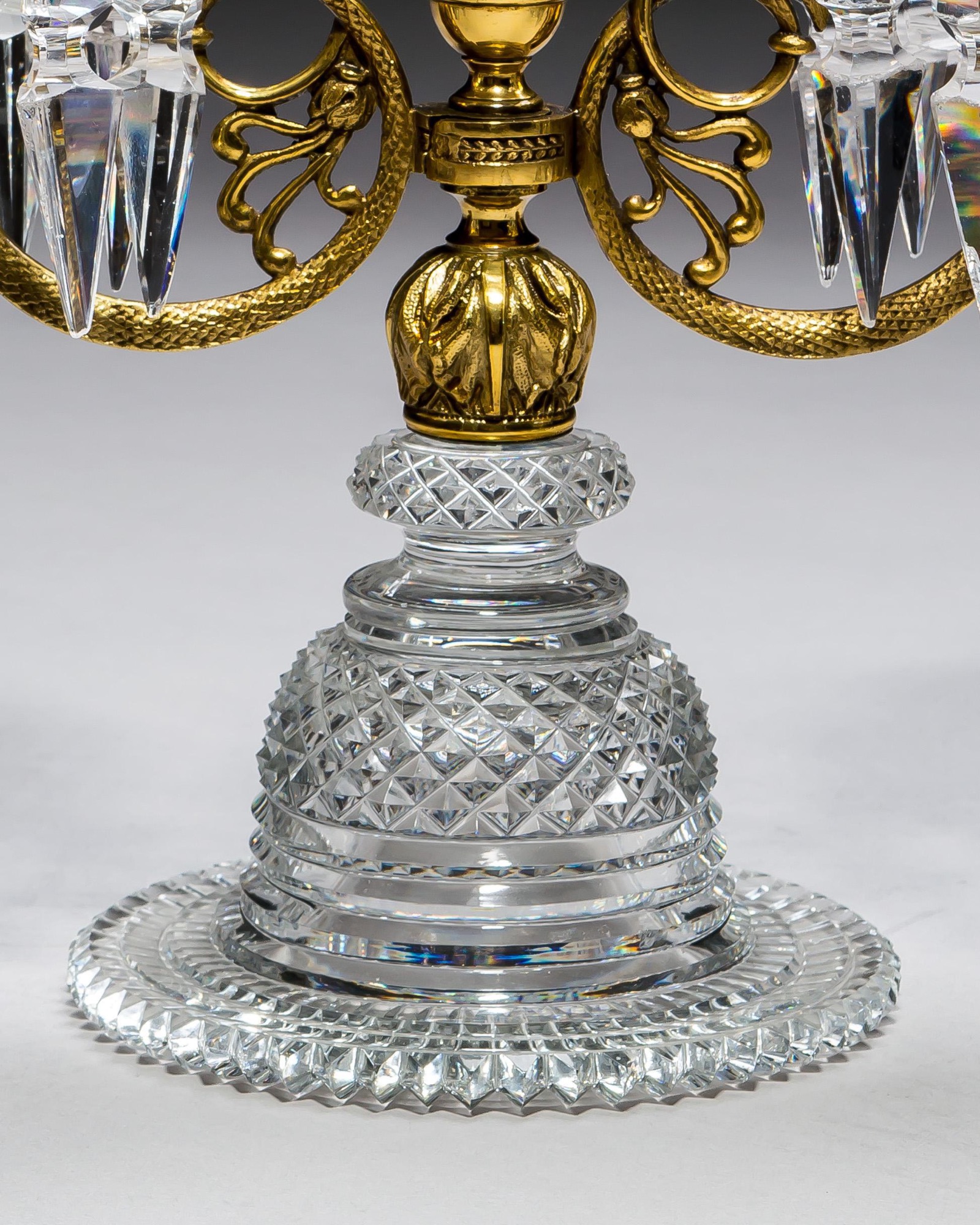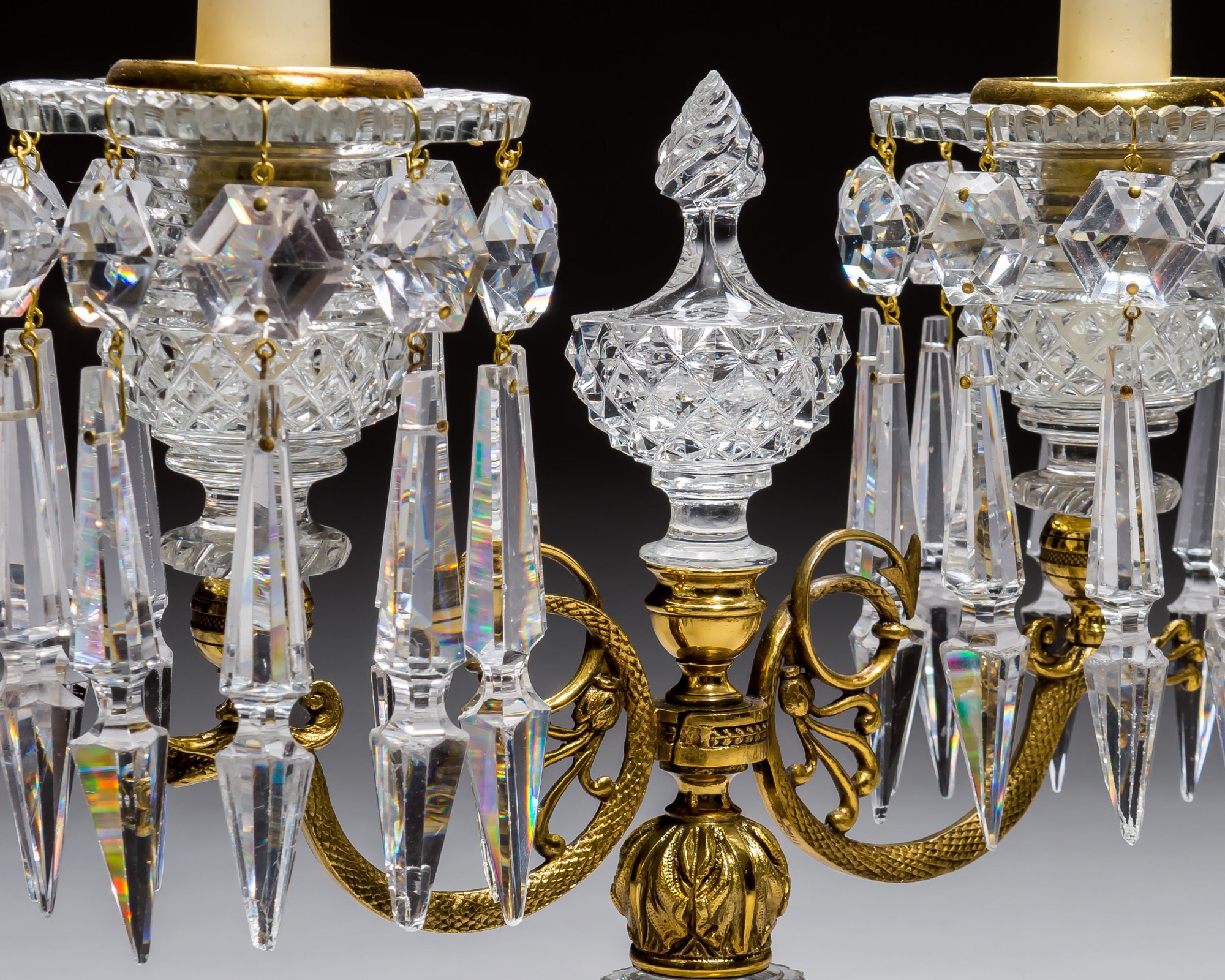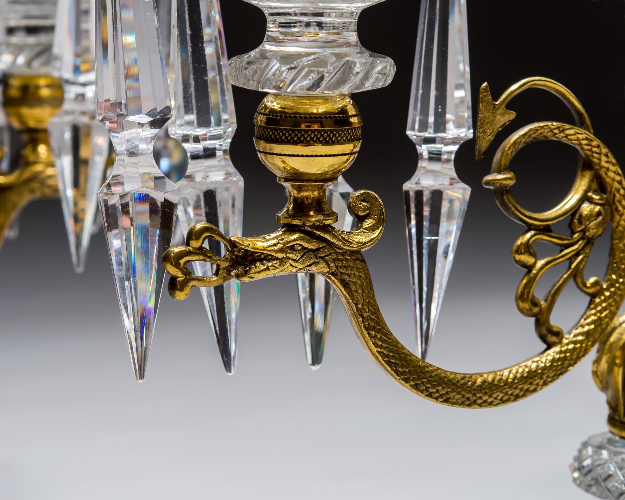 A pair of regency diamond cut candelabra mounted with ormolu scroll candle arms depicting dragons breathing fire.