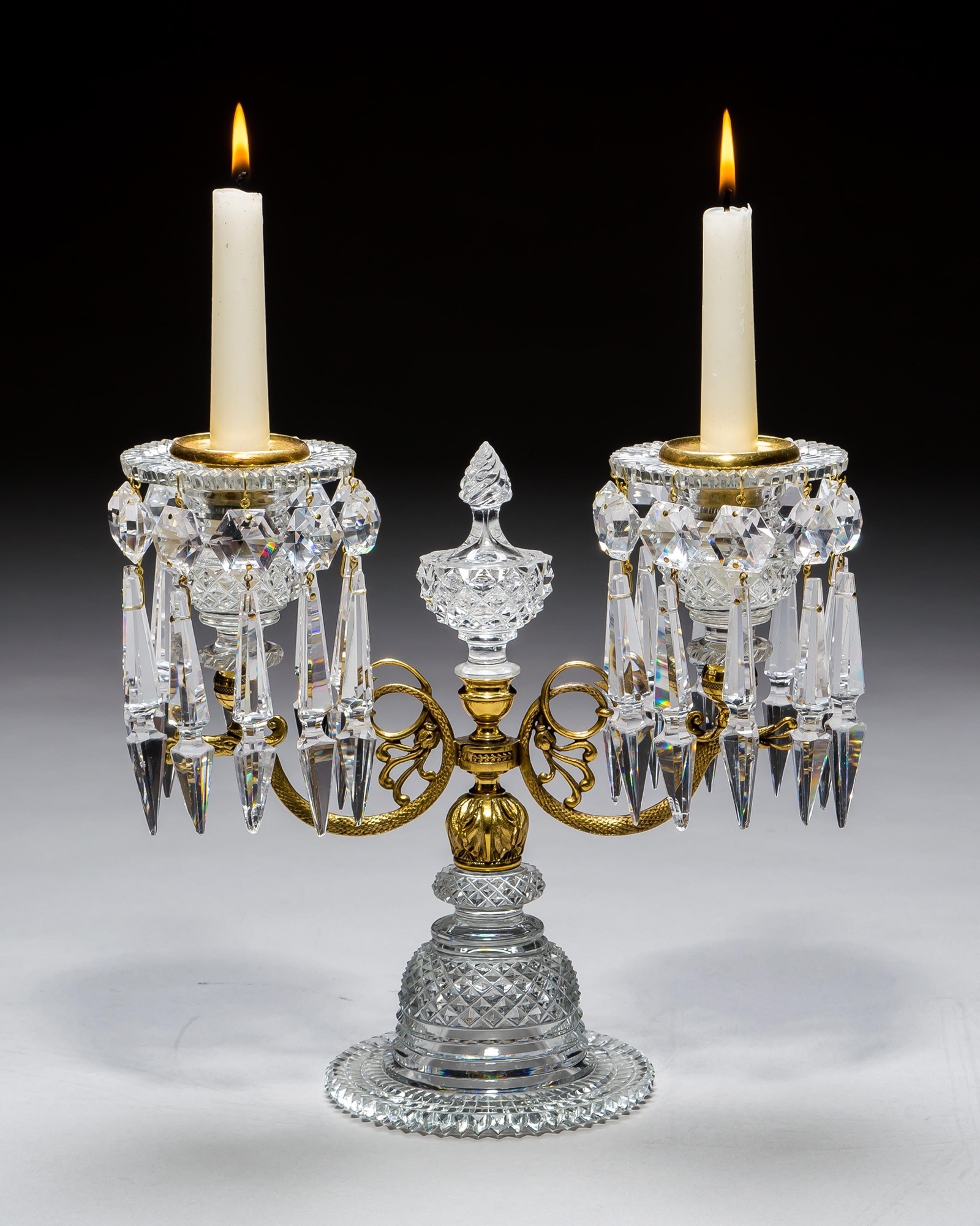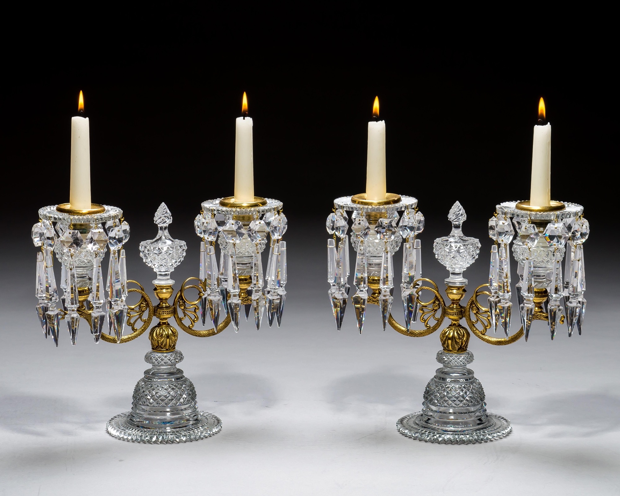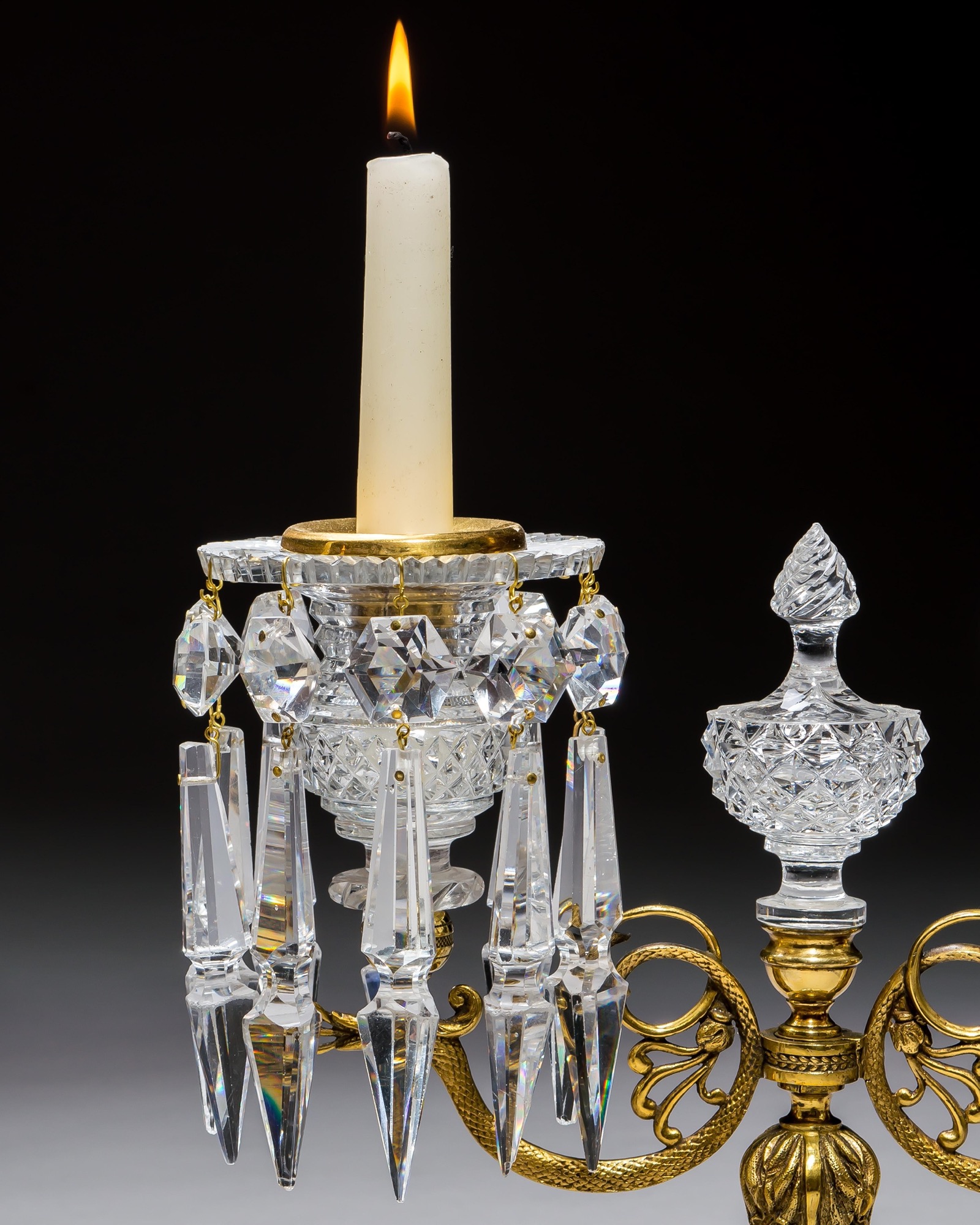 A pair of regency diamond cut candelabra mounted with ormolu scroll candle arms depicting dragons breathing fire.