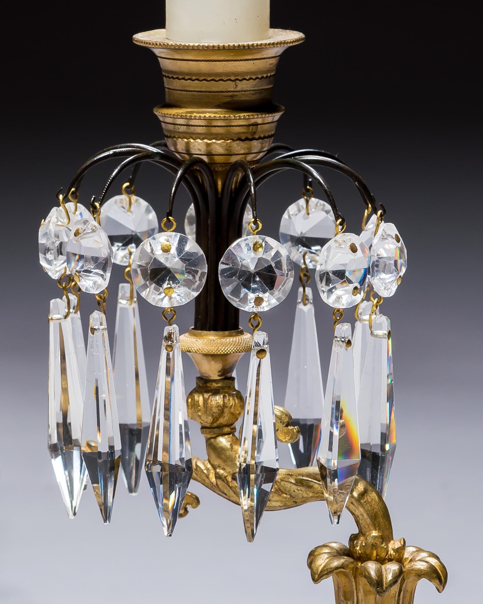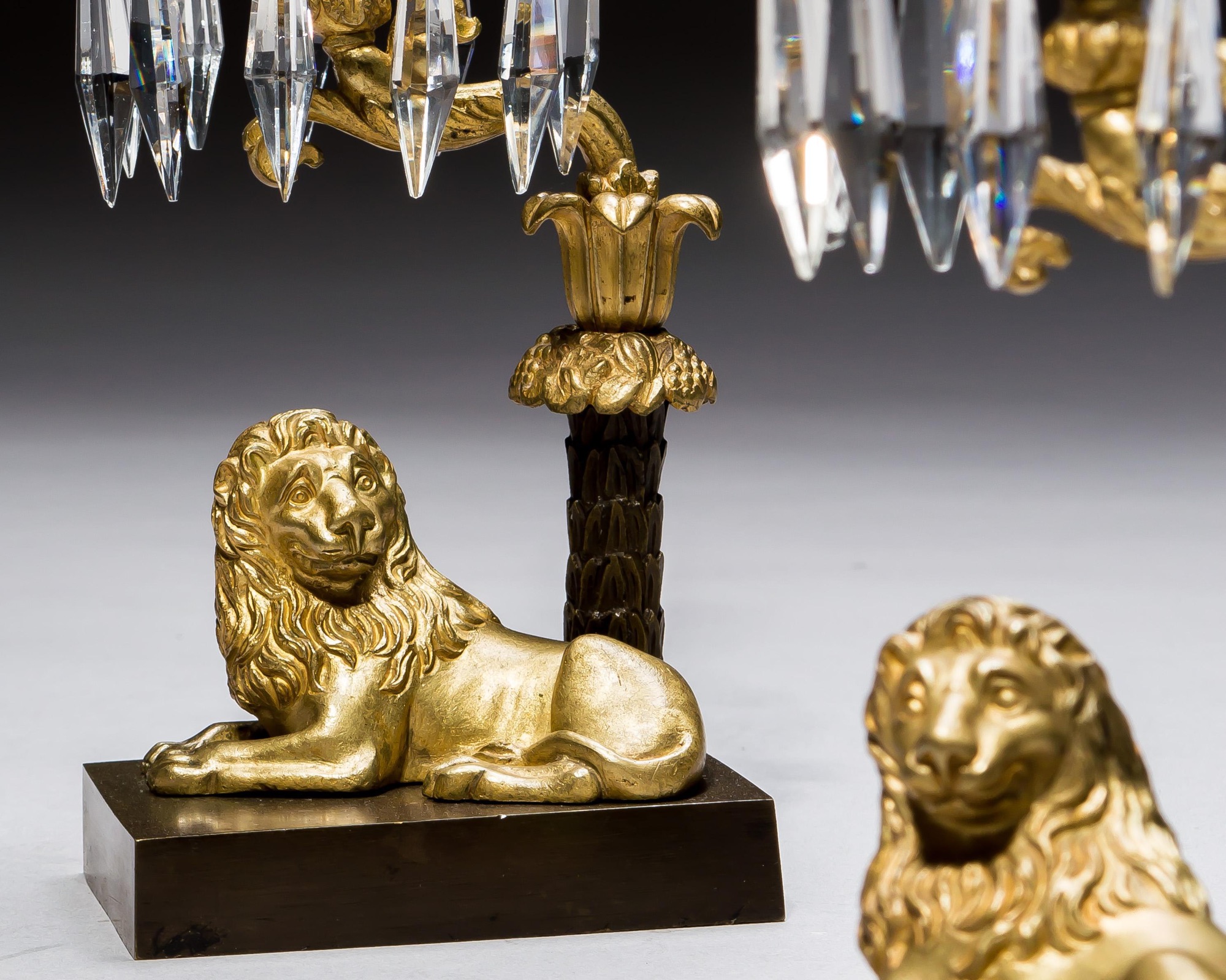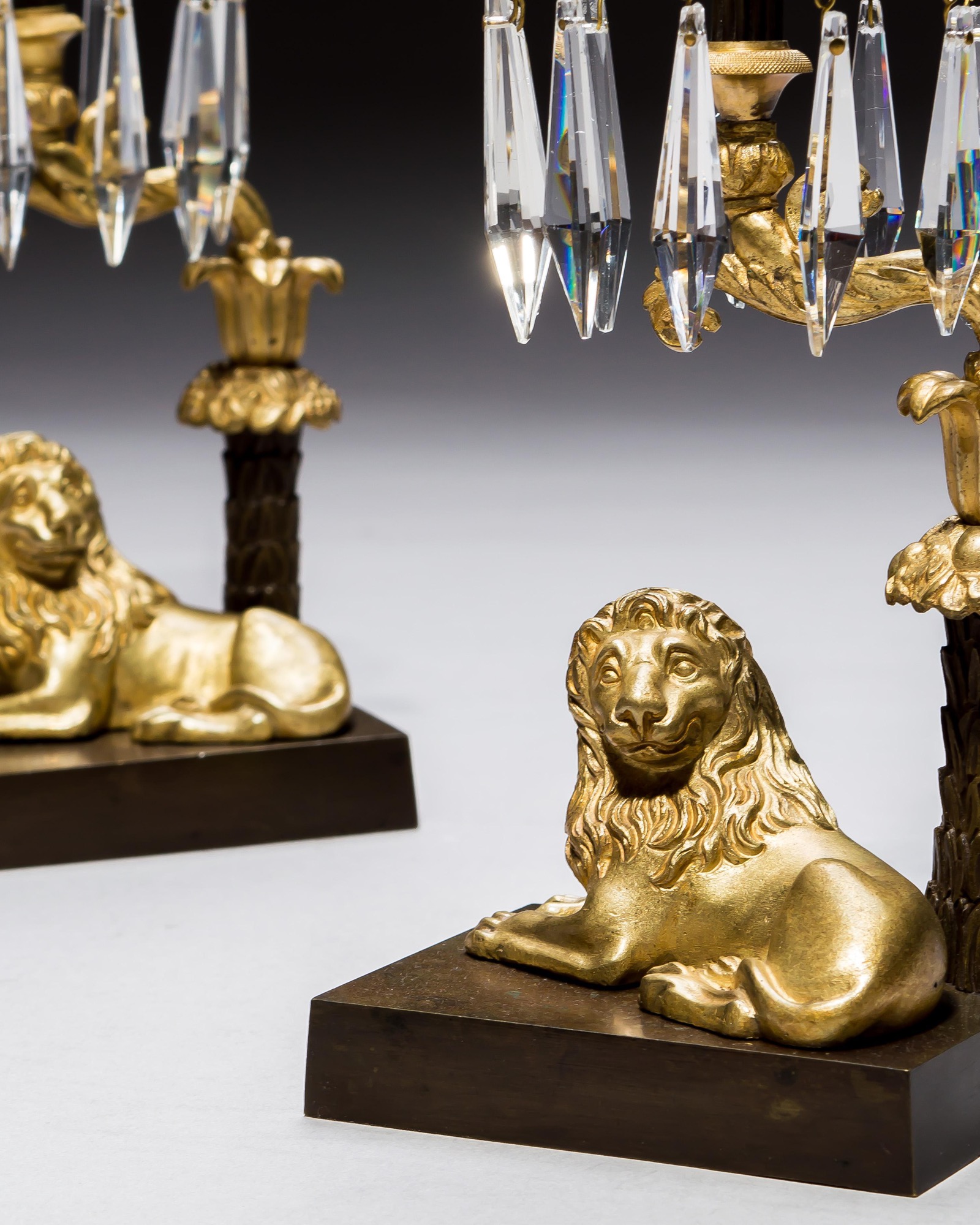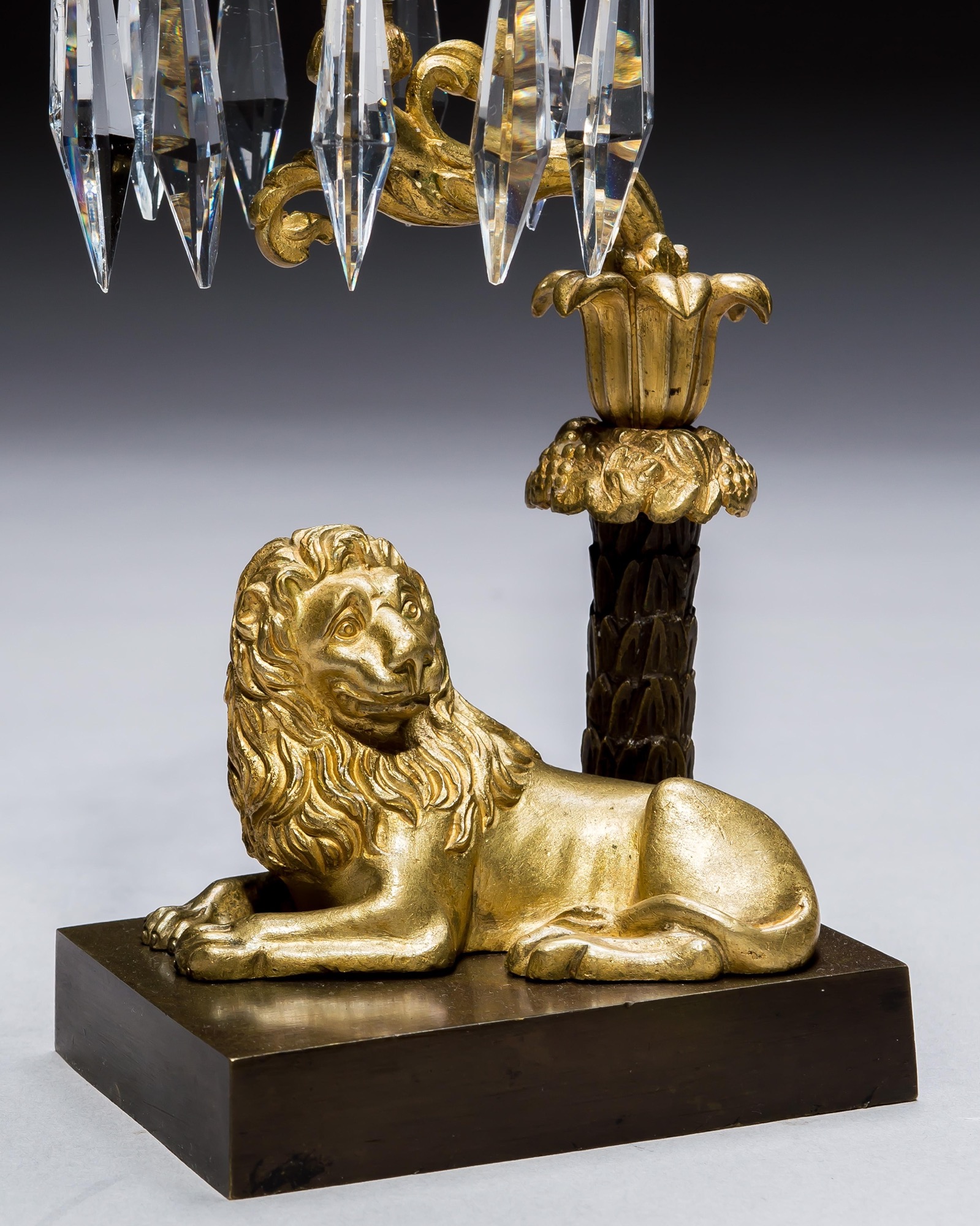 A pair of bronze plinth candlesticks, each gracefully poised upon by a finely cast, gilt-bronze recumbent lion figure, exuding a sense of power and classical emblems of strength and guardianship. From the sculptural plinth rises a fluted bronze stem, adorned with a gilt acanthus leaf capital supporting elegant scrolling branches. Suspended from the branches are tiers of finely cut faceted roundels and prism drops, catching and refracting light with dazzling brilliance, centred with a candle nozzle. The lustrous crystal complements the warmth of the gilt mounts, creating a striking interplay of texture and light.