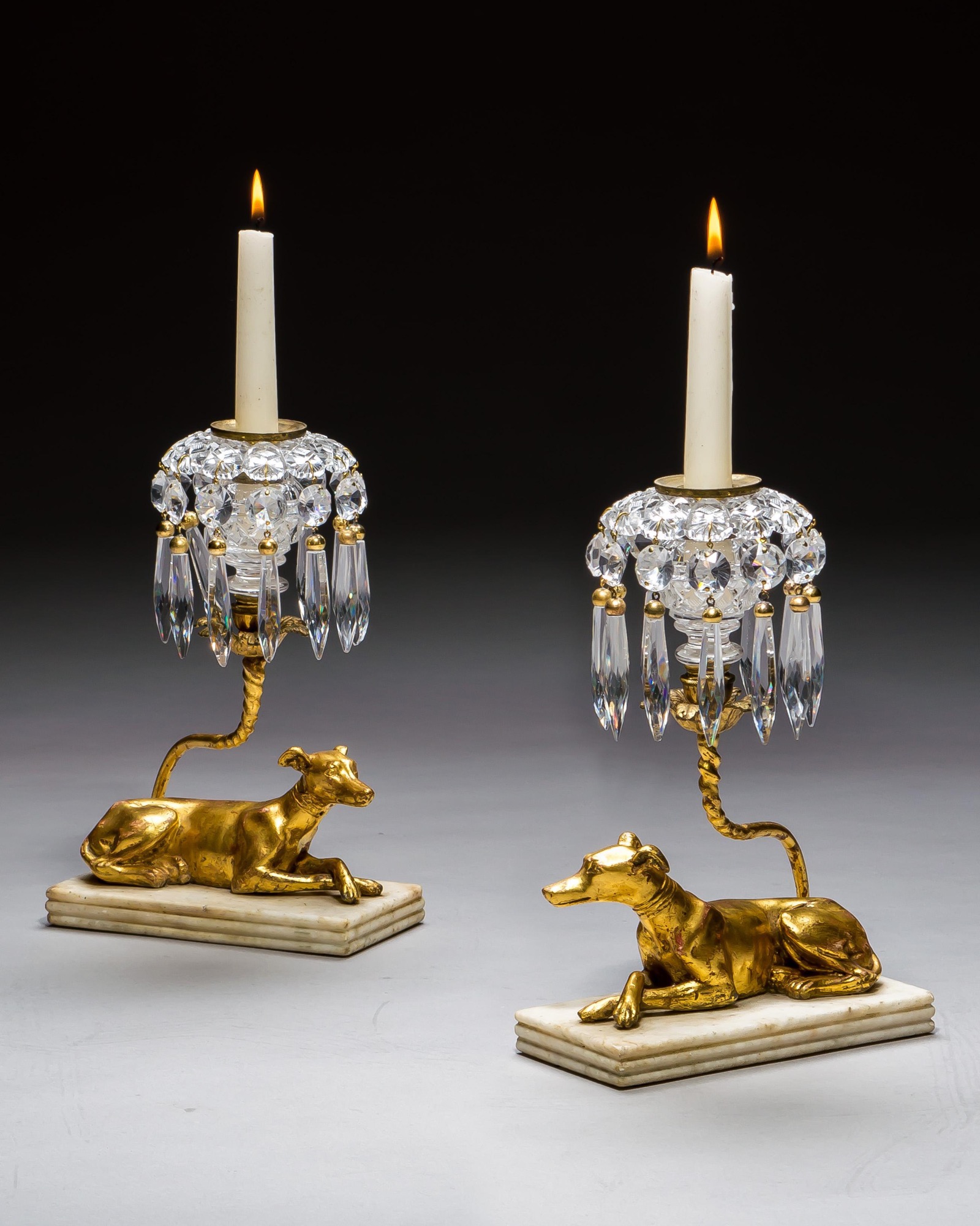 This refined pair of Regency candlesticks beautifully unites the elegance of carved giltwood with the brilliance of cut glass. Each candlestick features a finely carved reclining greyhound, gilded to a warm, lustrous finish and resting gracefully on a stepped marble plinth. The sculptural form of the animals embodies the Neoclassical taste of the early 19th century, when stylised animal motifs were a mark of sophistication and fashionable design.