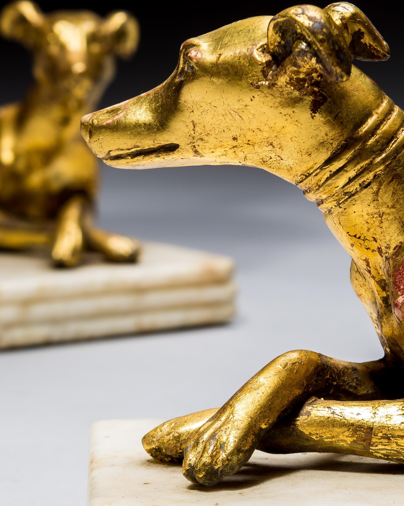A PAIR OF GILT-WOOD GREYHOUND CANDLESTICKS