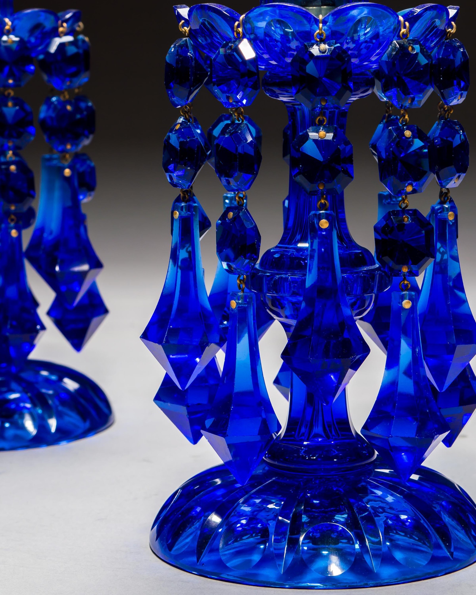The lustres vivid cobalt hue lends them a regal, almost jewel-like quality, making them a striking statement in both traditional and contemporary interiors. Exemplifying 19th-century decorative glasswork at its most dramatic, this pair is a superb fusion of craftsmanship, elegance, and luminous colour.