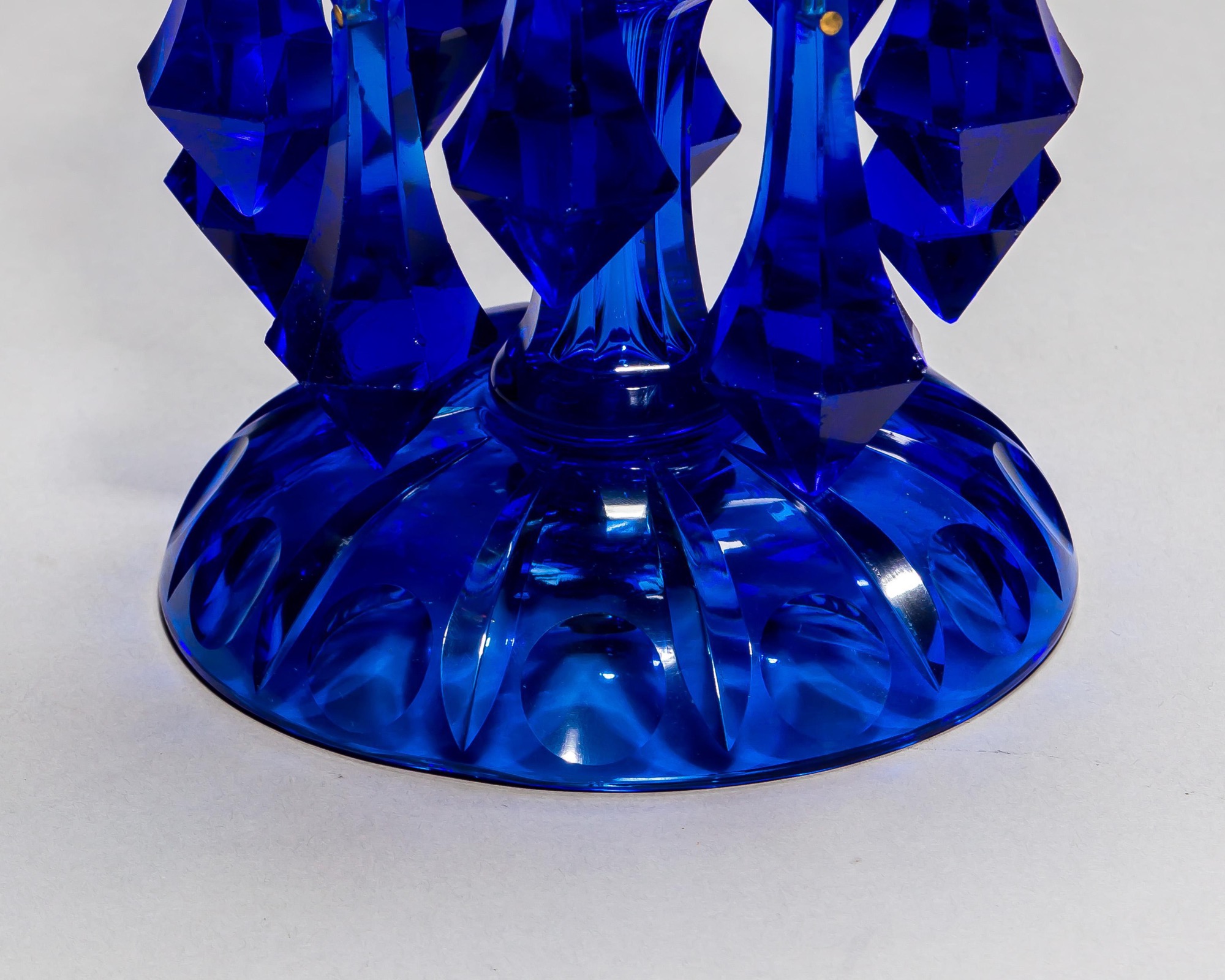 This magnificent pair of cobalt blue cut-glass lustres exudes a bold, opulent presence, blending sculptural elegance with luminous colour. Each piece stands on a deeply faceted, domed base that catches and reflects light through richly hued glass, creating a mesmerising play of brilliance.