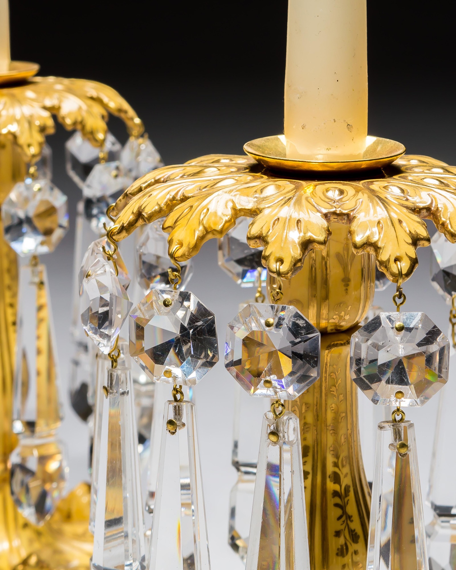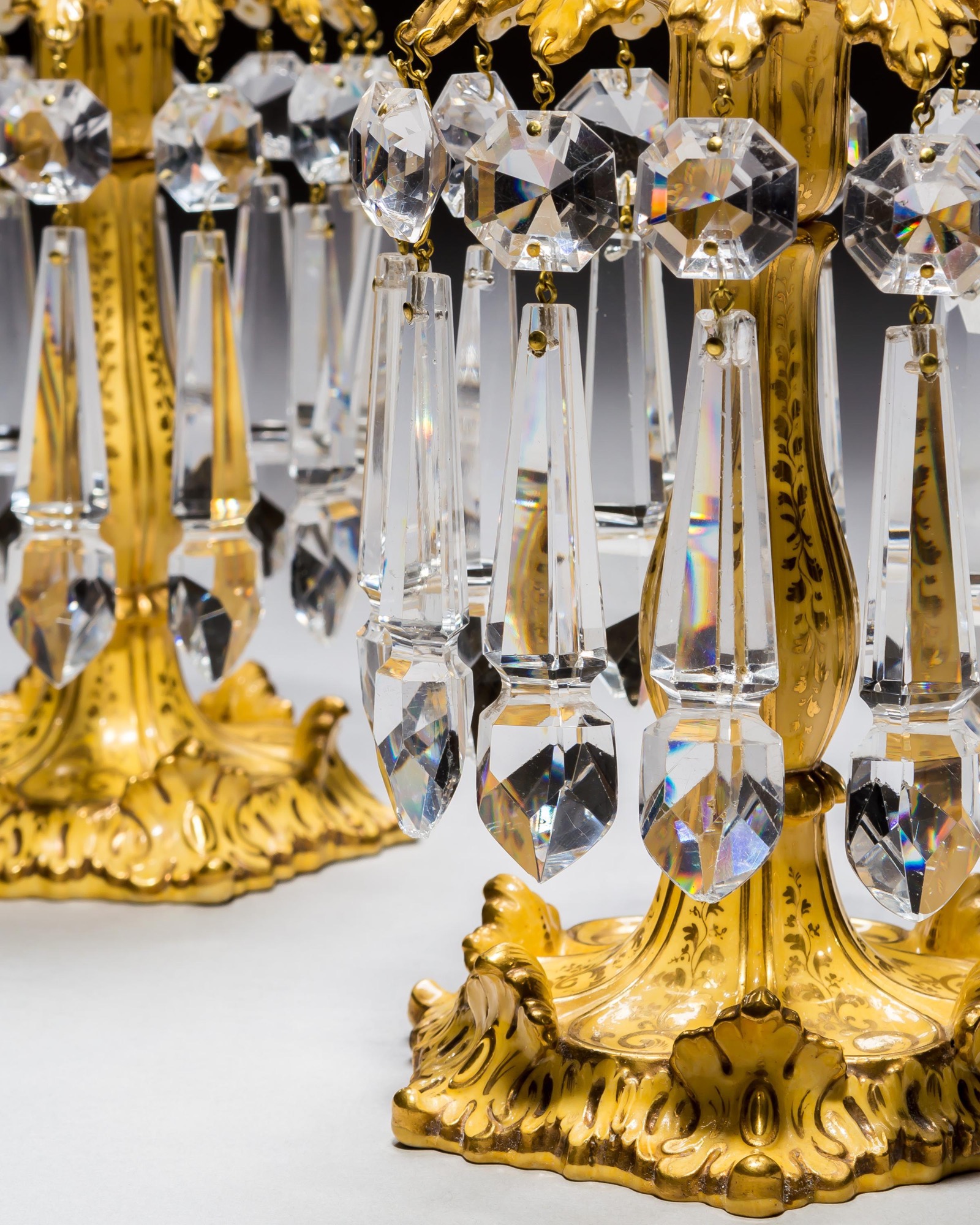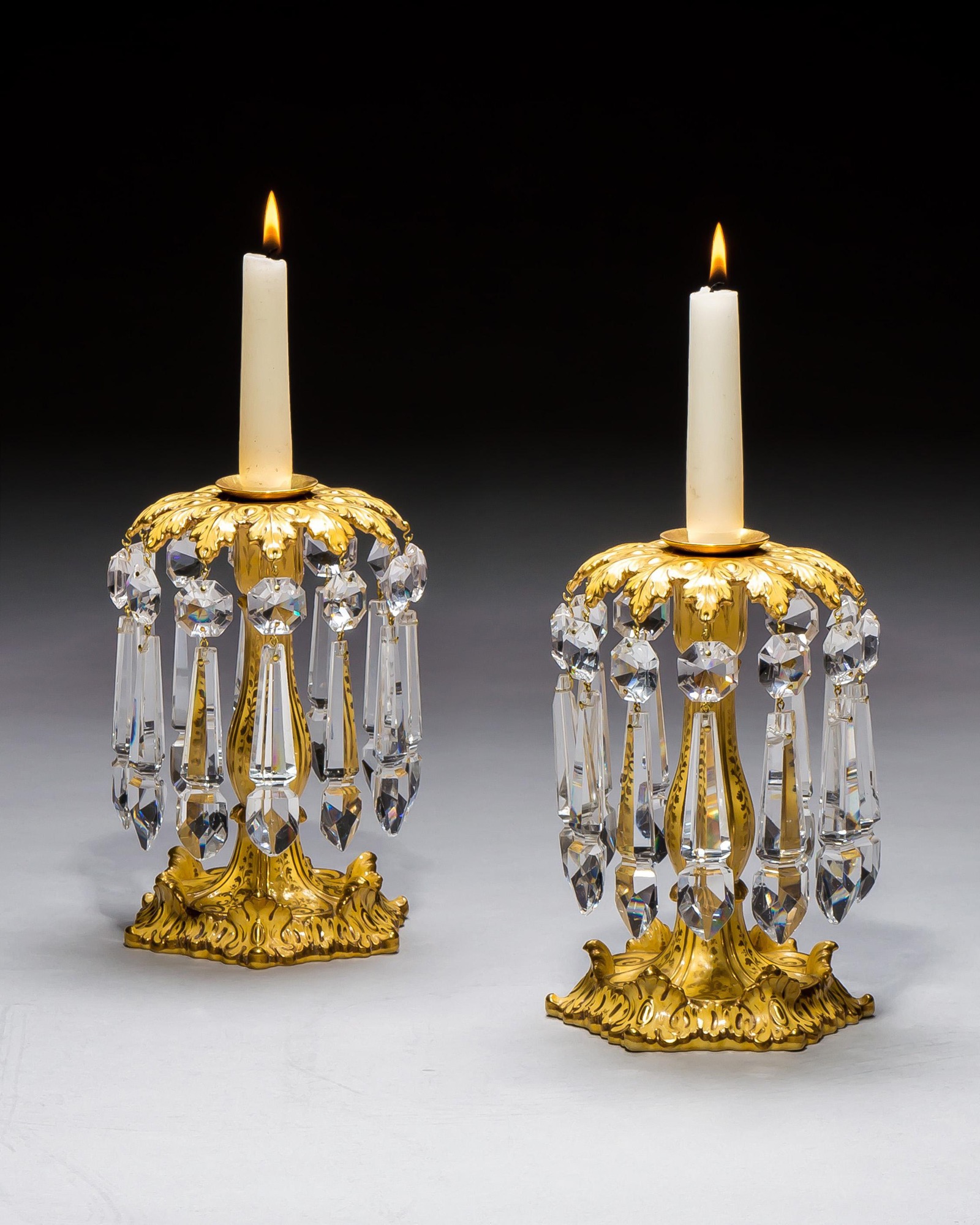 An exceptionally fine pair of Rockingham yellow porcelain candlesticks with fine gilt decoration, hung with most unusual spade drops.