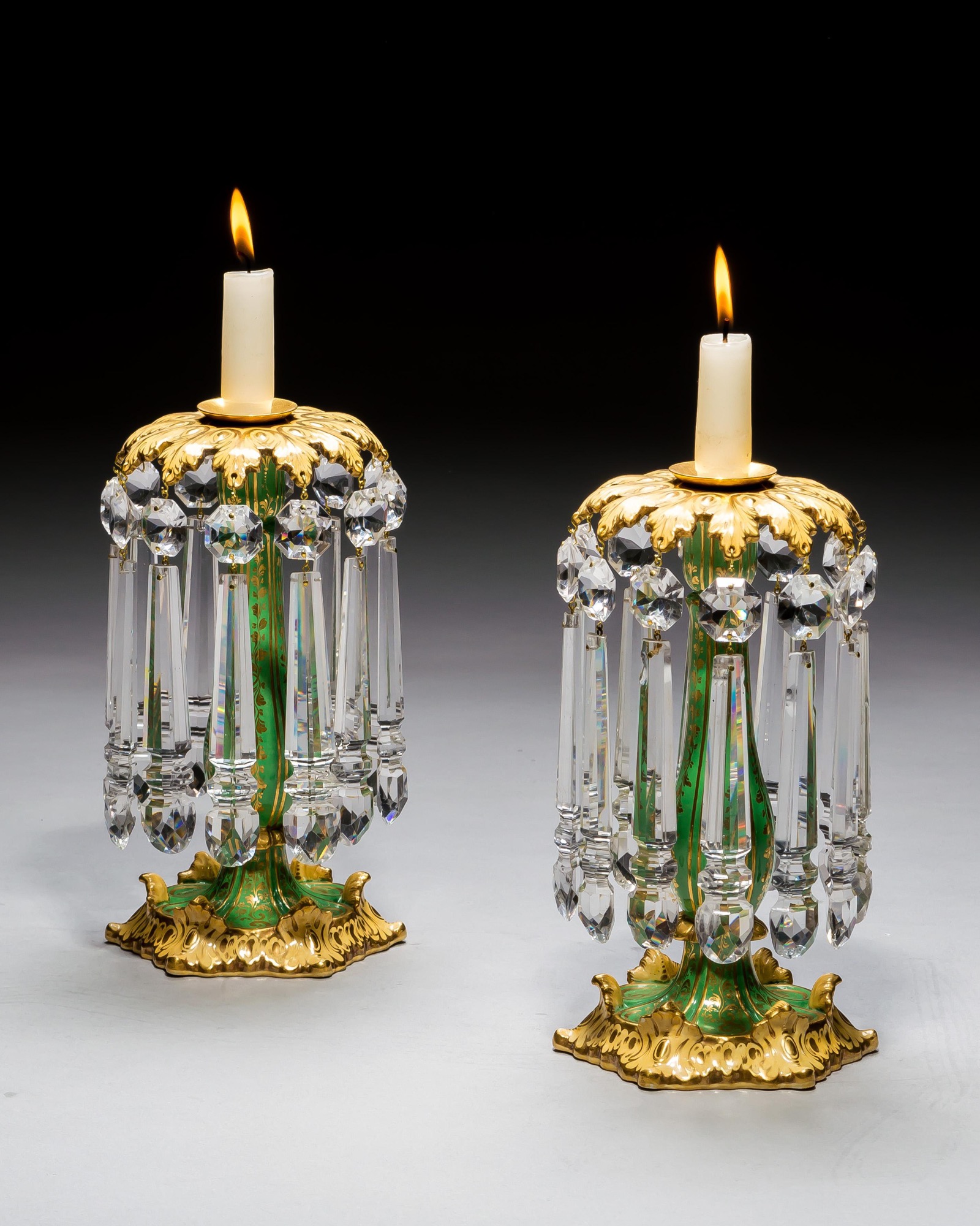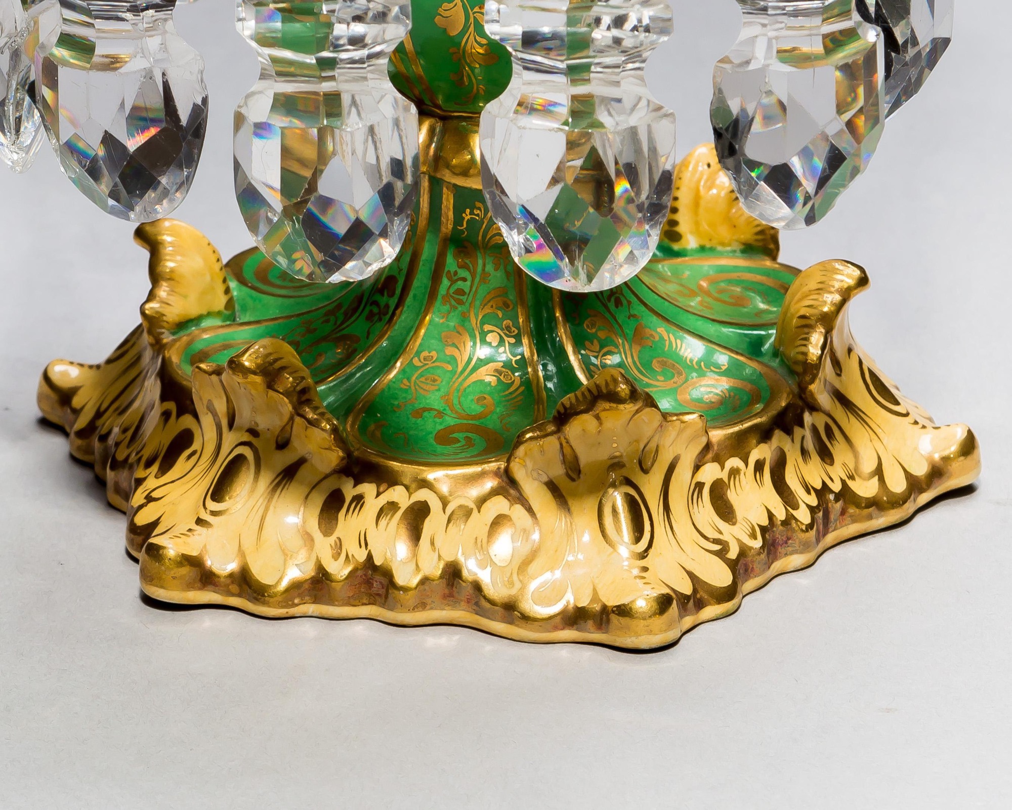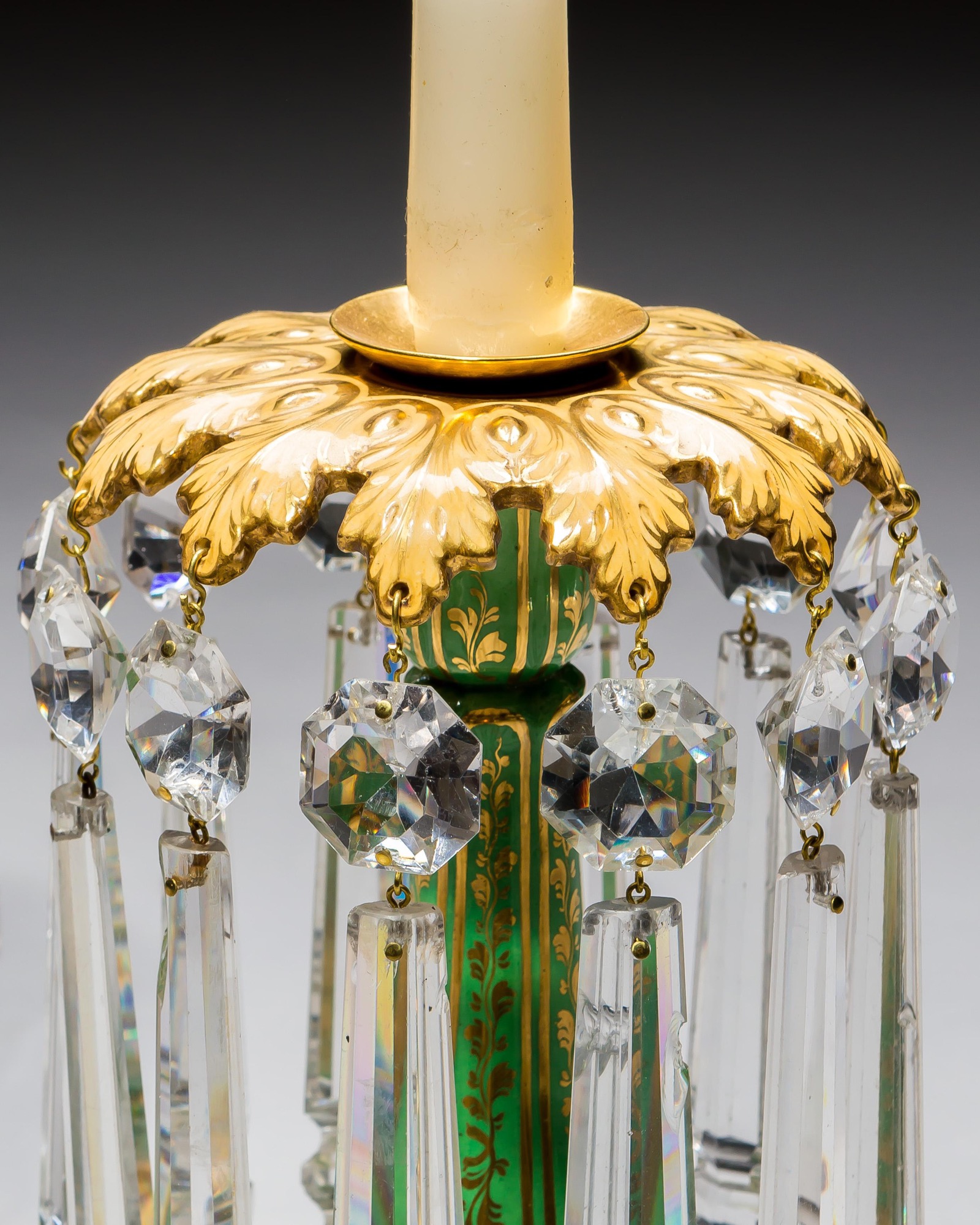 An exceptionally fine pair of Rockingham green porcelain candlesticks with fine gilt decoration, hung with most unusual spade drops.