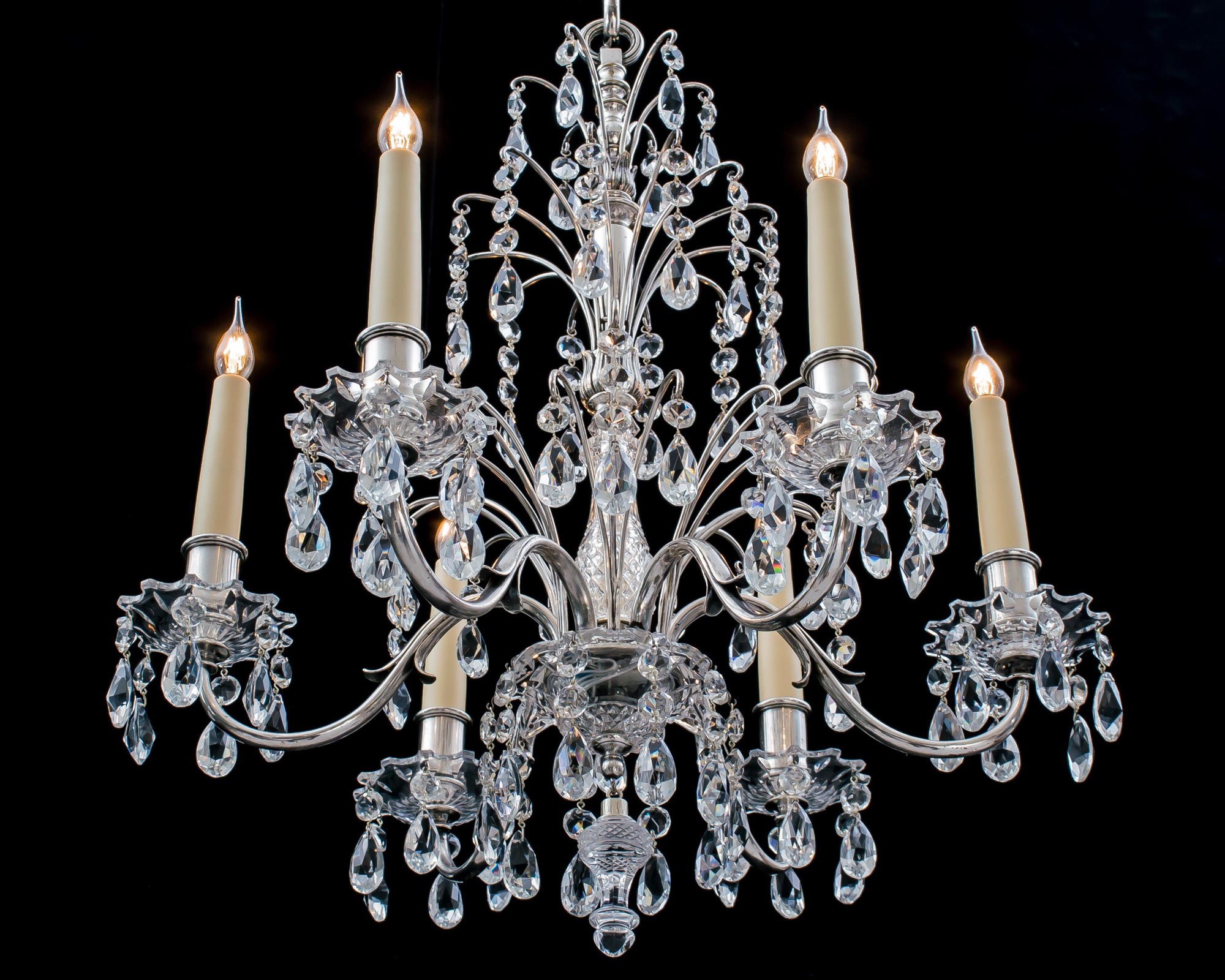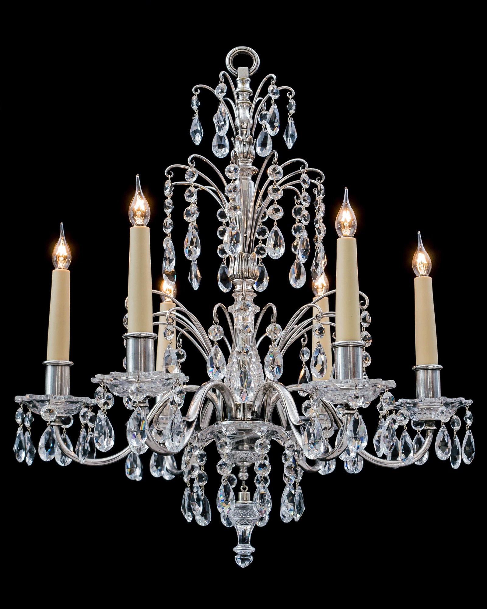 A charming little Edwardian chandelier of six lights, exquisitely crafted in cut glass and silvered brass. The elegant central column is composed of faceted glass element and receiver bowl, from which six gracefully scrolled arms extend, each supporting a drip pan and candle nozzle hung with cut glass drops. Delicate silvered sprays crown the upper section, hung with cascading strings of faceted drops and pendants, accentuating the chandelier's refined silhouette and radiating light with subtle brilliance.