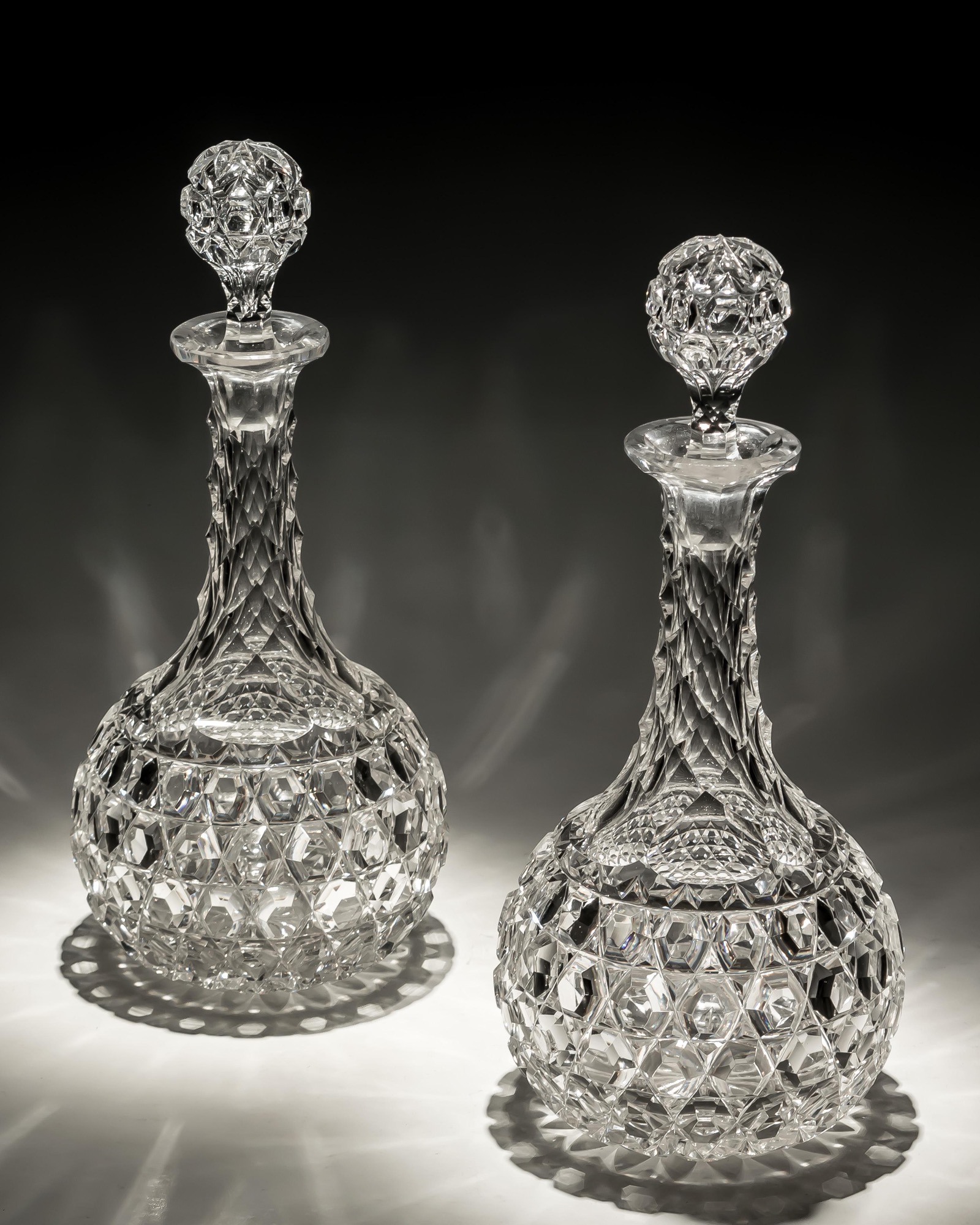 A pair of elaborately cut Victorian decanters with matching cut stoppers.