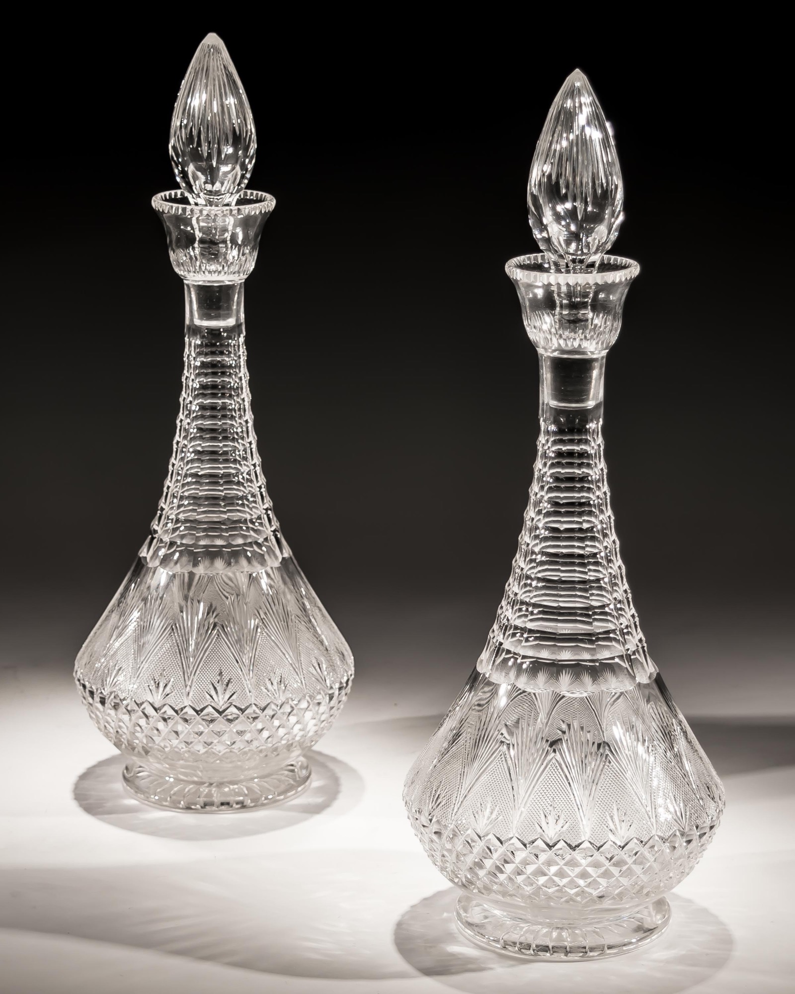 A pair of elaborately cut Victorian decanters.