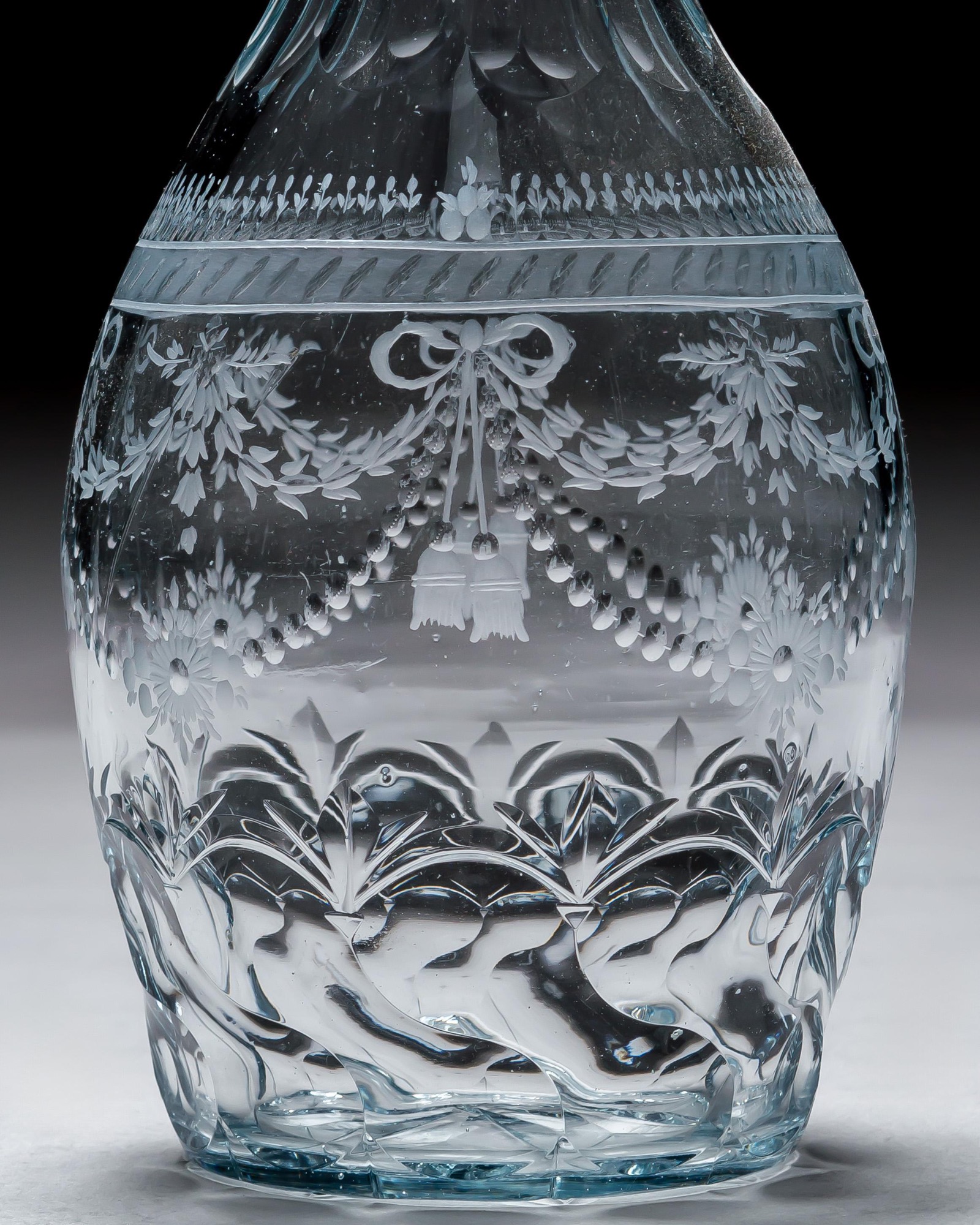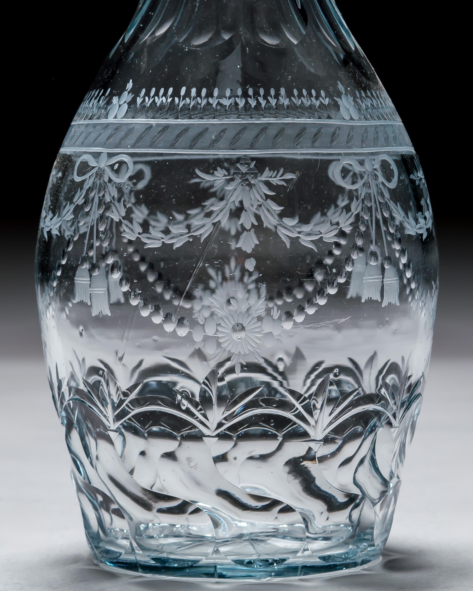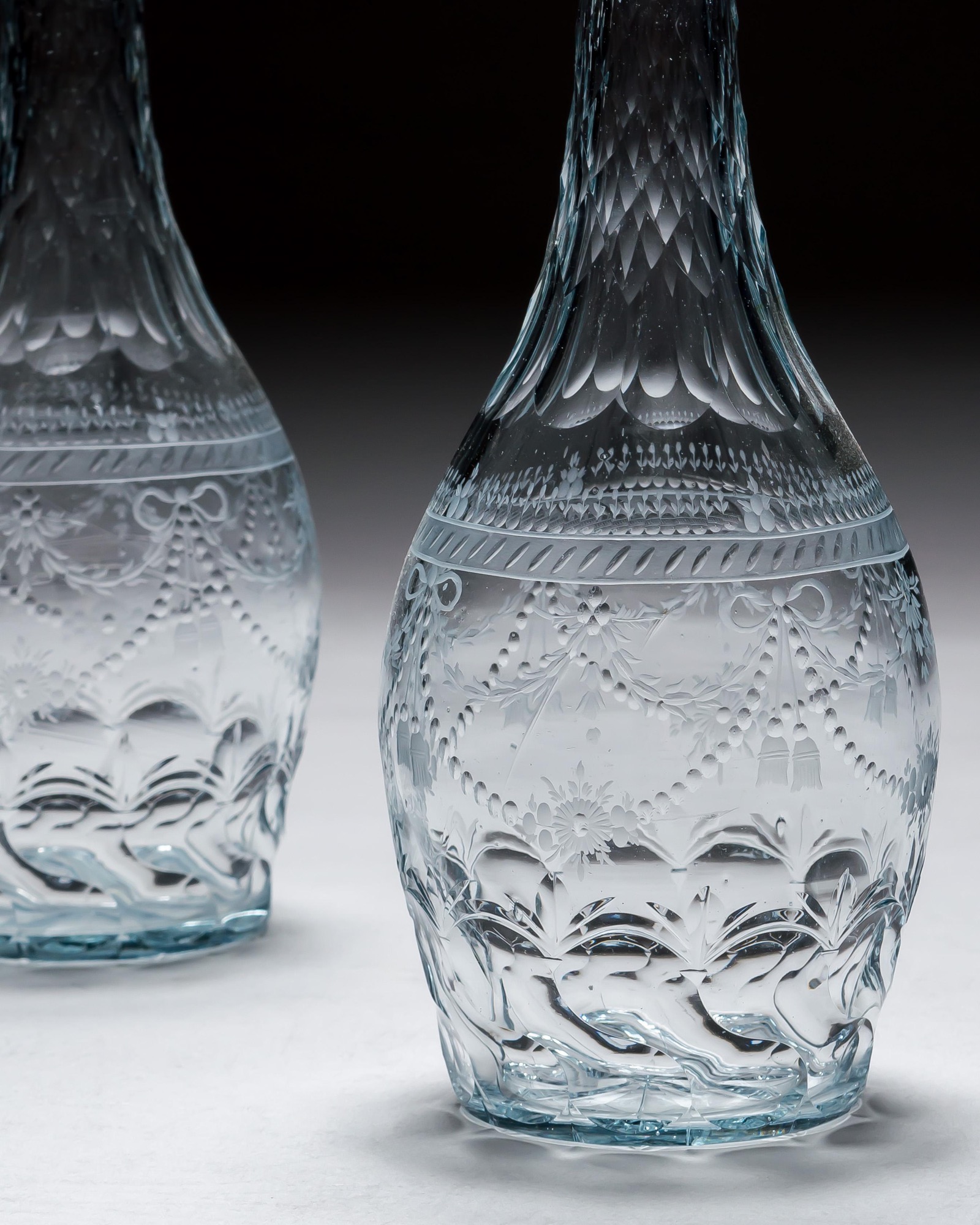 The pair of continental decanters of club form, with swirl cut and engraved bodies, depicting bows with tassels inter-linked with swags of flowers, headed by a bordered band, topped with flowers. The scale cut necks are fitted with faceted lozenge stoppers.