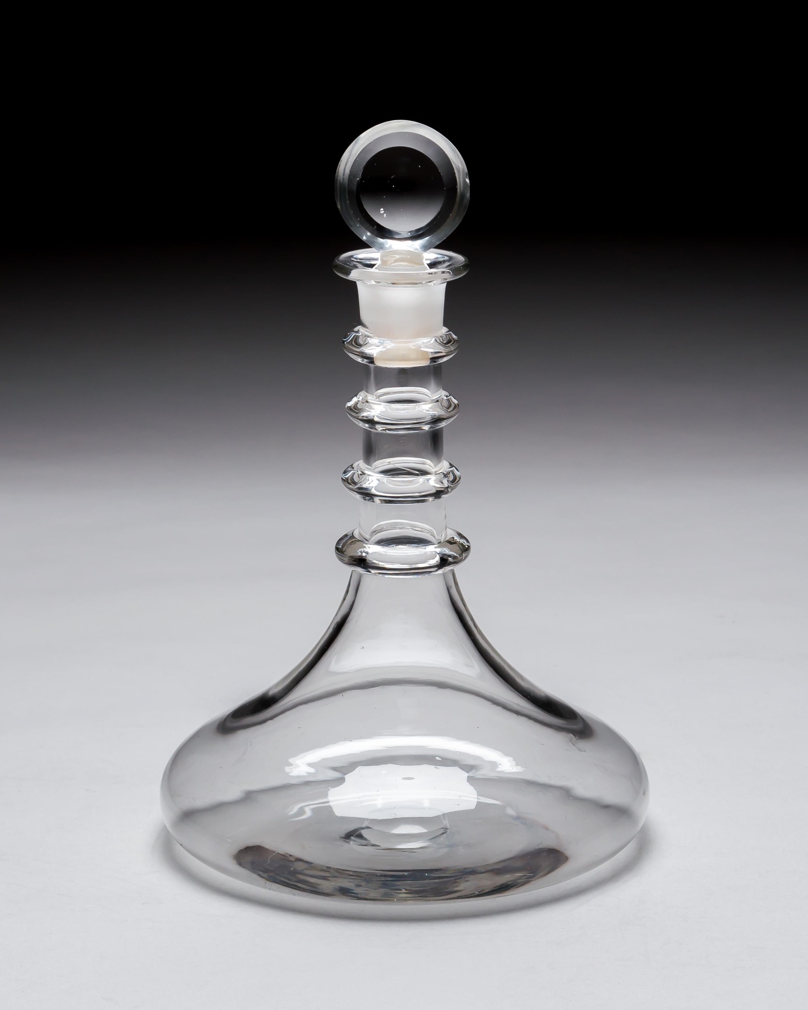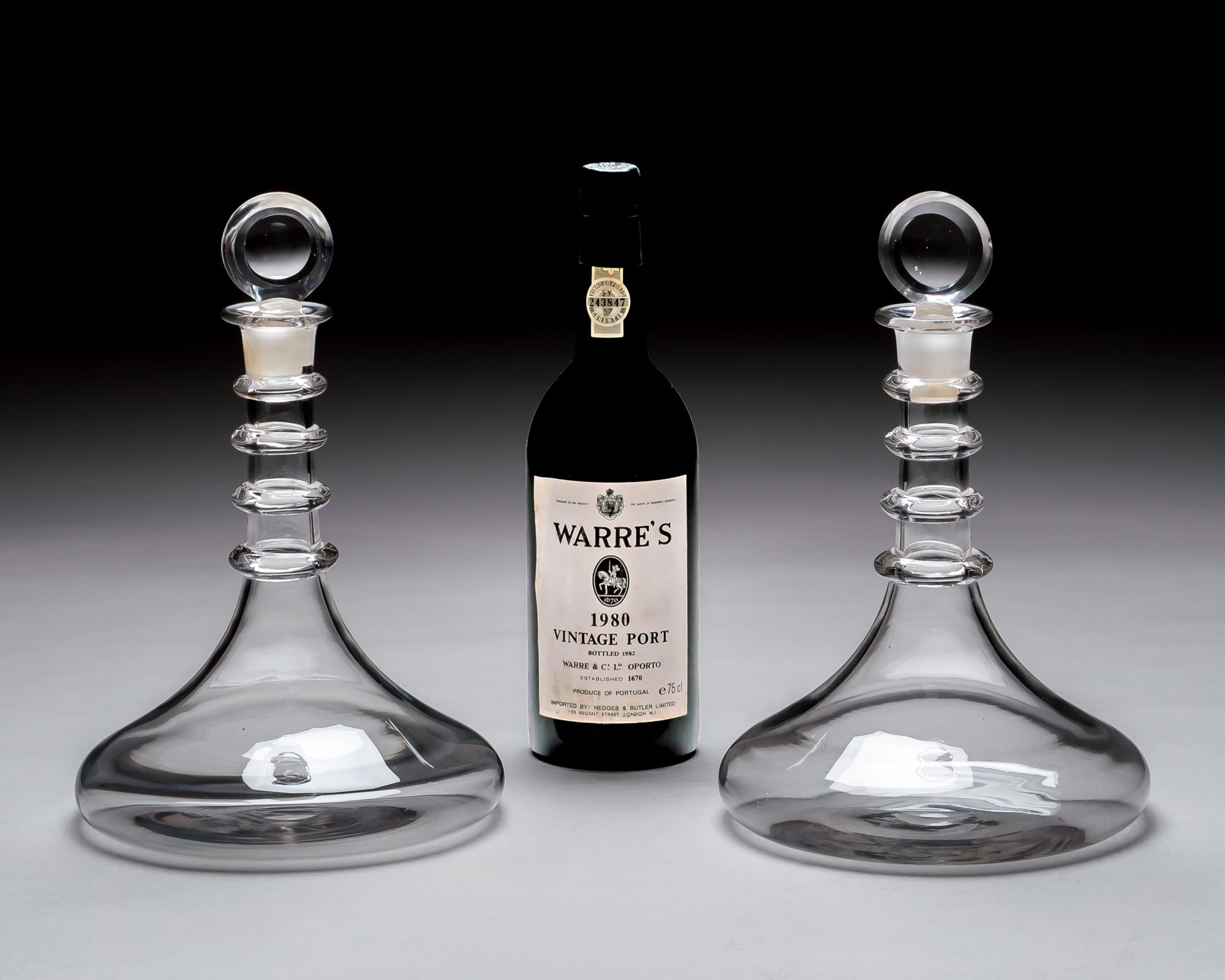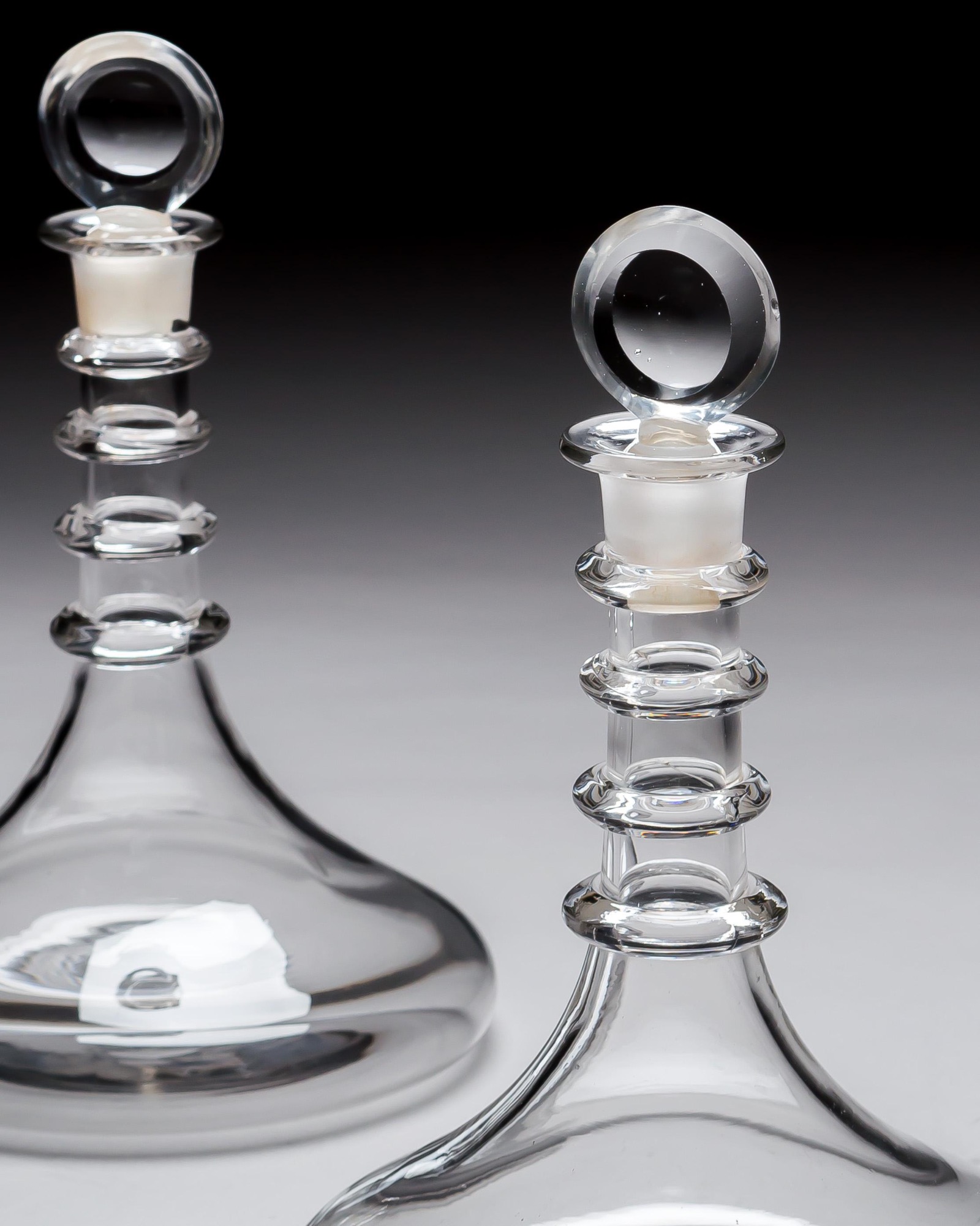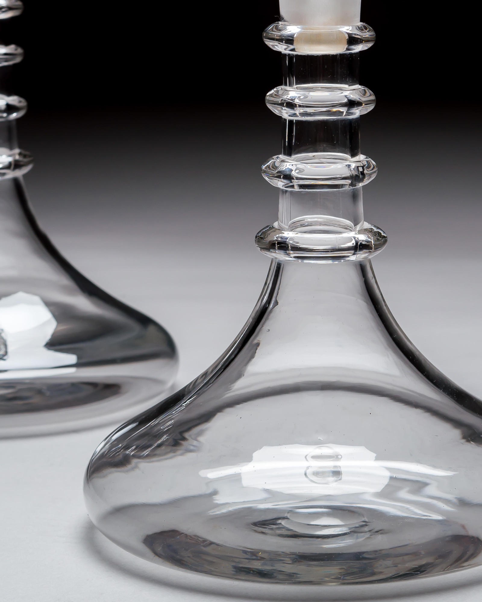 A pair of plain ships decanters with quadruple neck rings, fitted with bulls-eye stoppers.