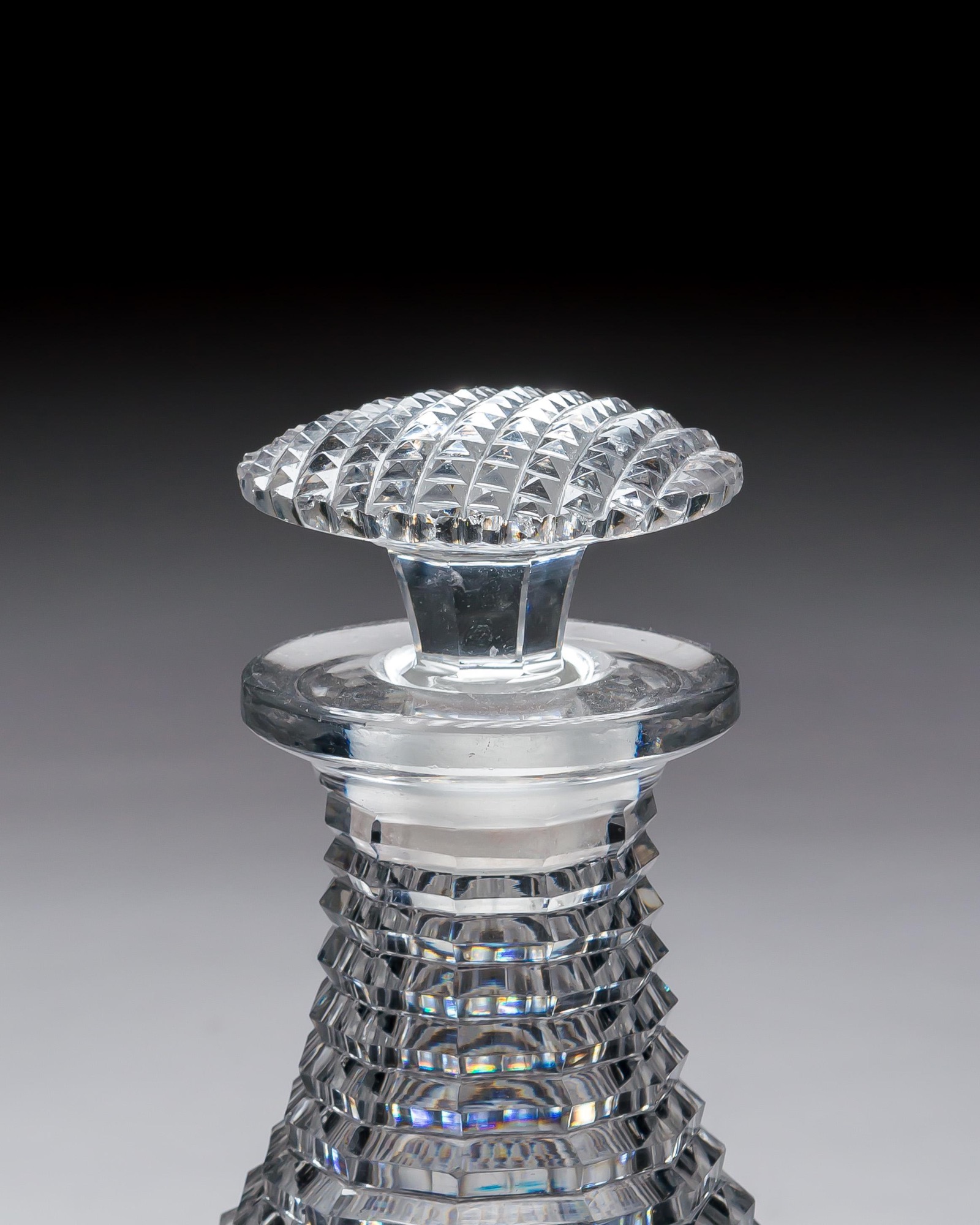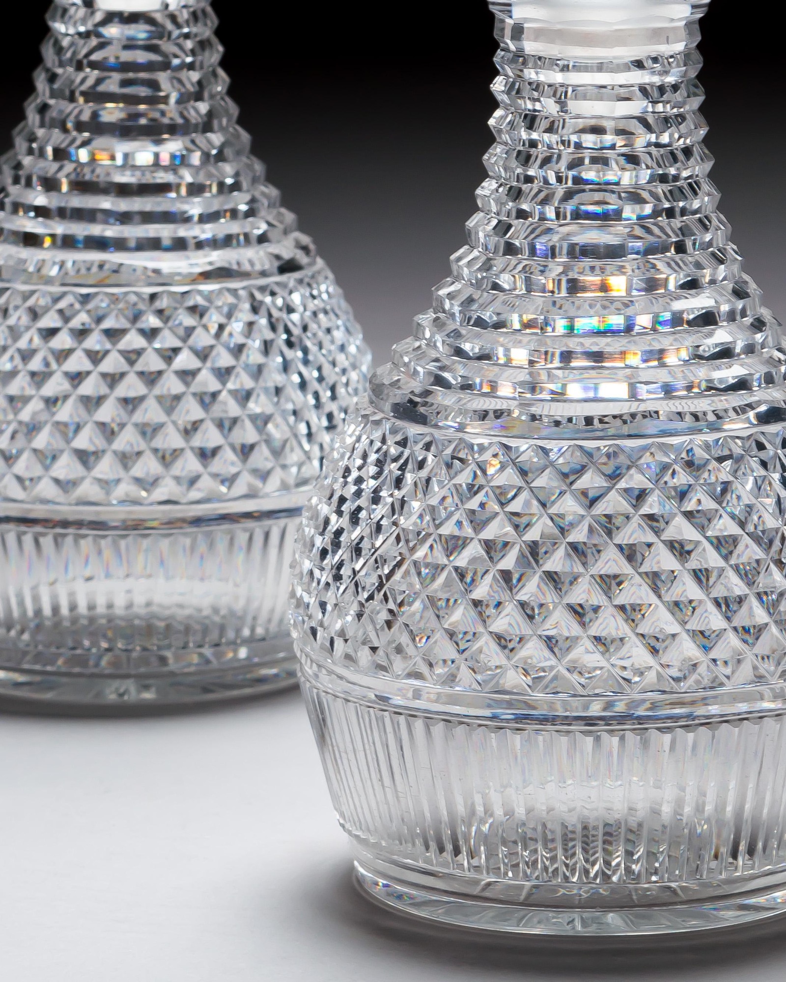 A pair of diamond and step cut Regency decanters with corresponding mushroom stoppers.
