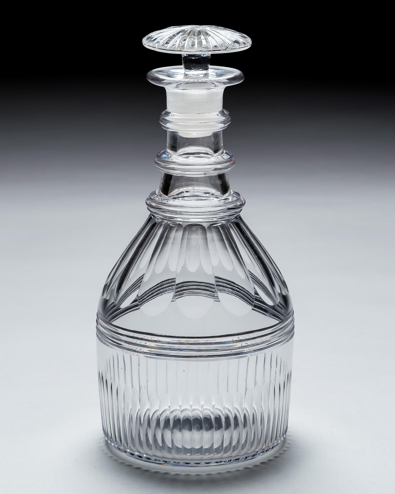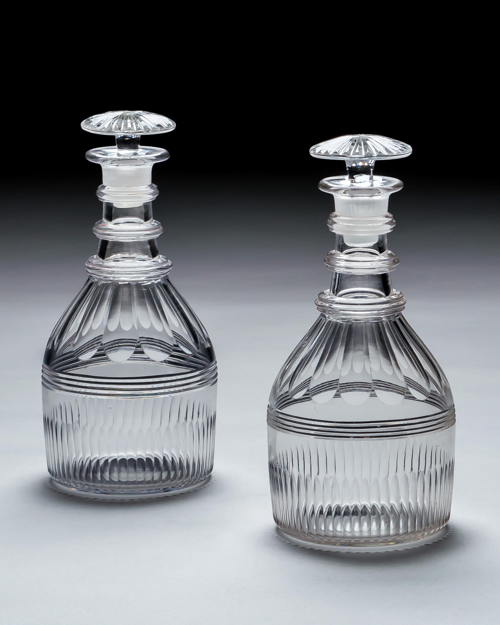 A refined pair of early Regency cut glass decanters, each of ovoid form with beautifully balanced proportions and crowned by radial cut mushroom shaped stoppers. The bodies are elegantly decorated with broad fluted bands and petal-cut shoulders, centred with fine horizontal mitre cutting.