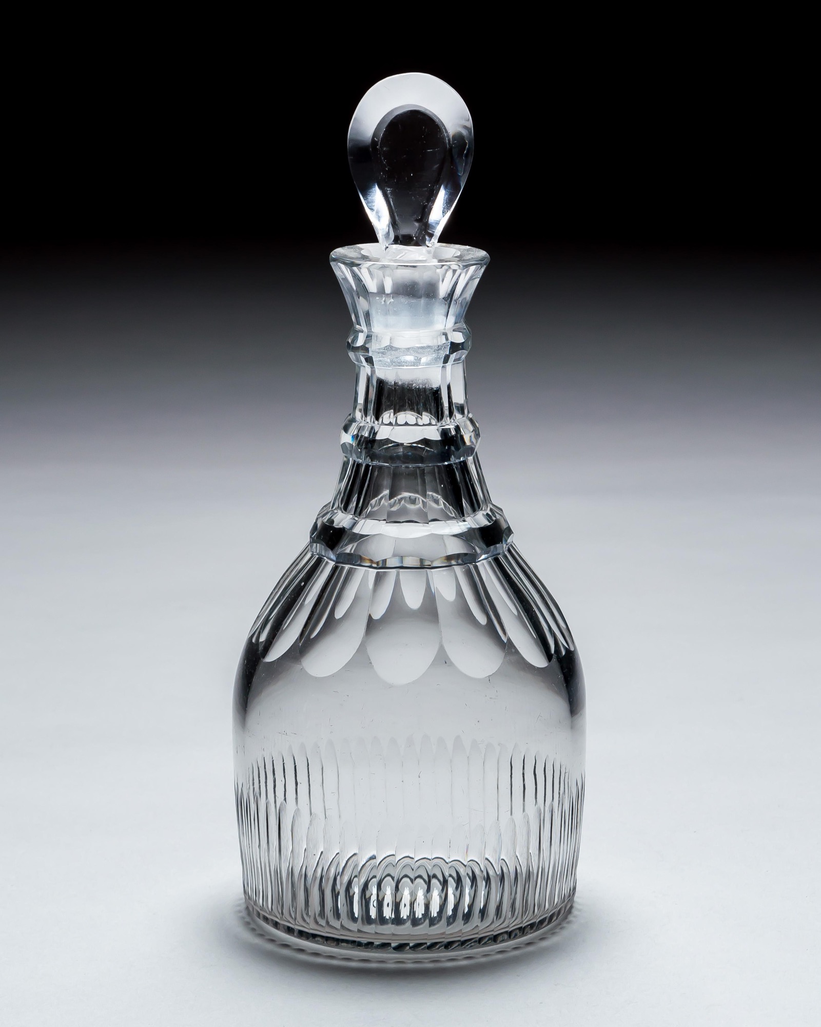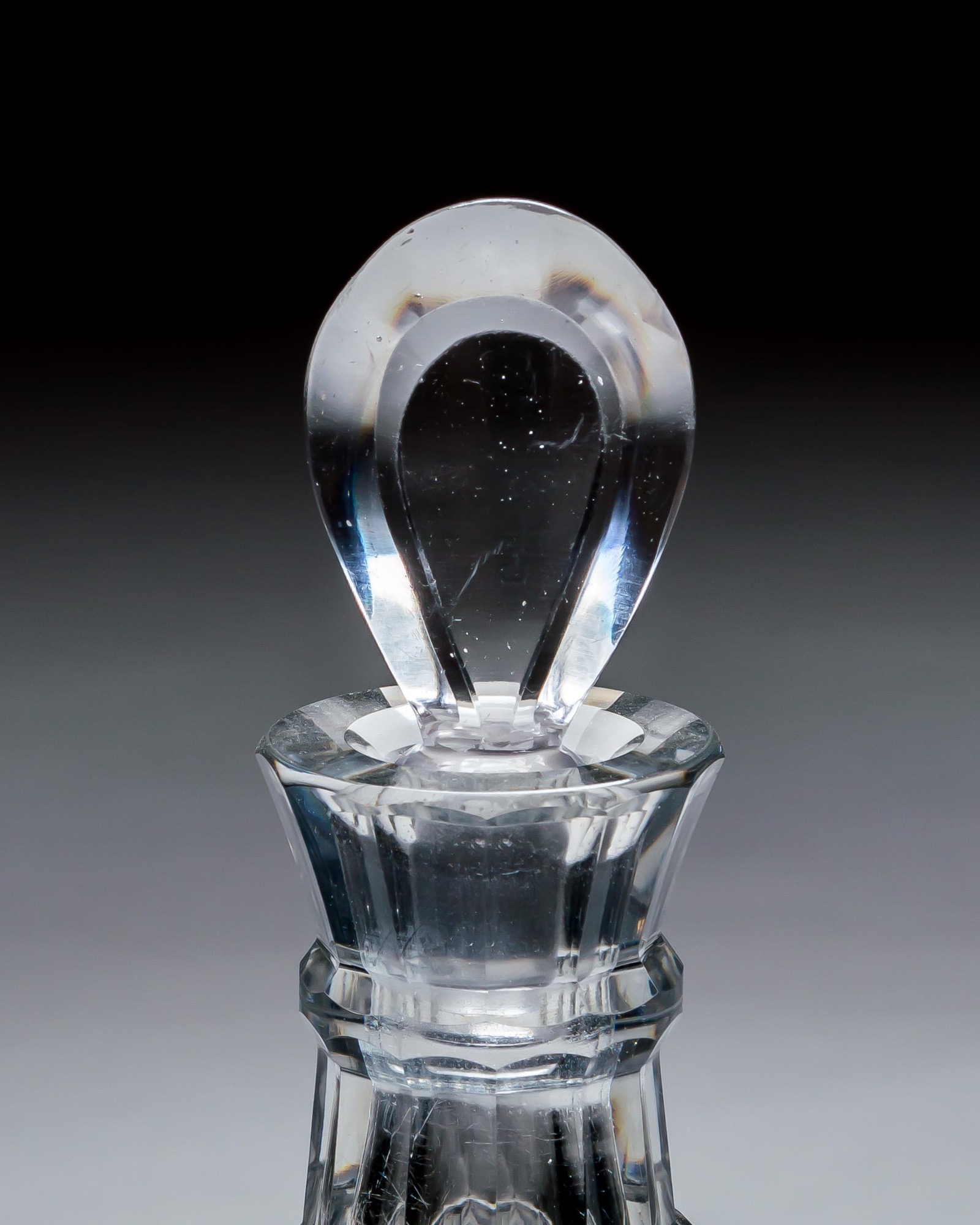A refined pair of cut-glass decanters, each of ovoid form with facet cut triple neck rings and lozenge stoppers. The bodies are elegantly decorated with bands of fluting to the lower section and petal-shaped slice cutting around the shoulders.