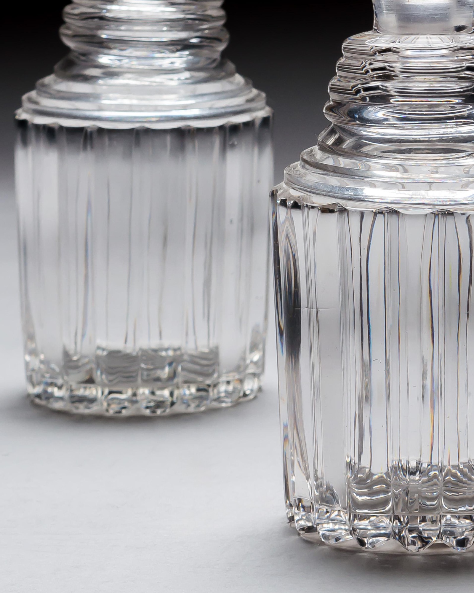 This elegant pair of cut-glass spirit decanters reflects the refined craftsmanship of the William IV period. Cylindrical in form, each features a stepped neck with concentric rings and a striking pillar edge, star cut mushroom stopper. The bodies are decorated with deep pillar cutting that enhances the clarity of the glass, ending in a scalloped base.