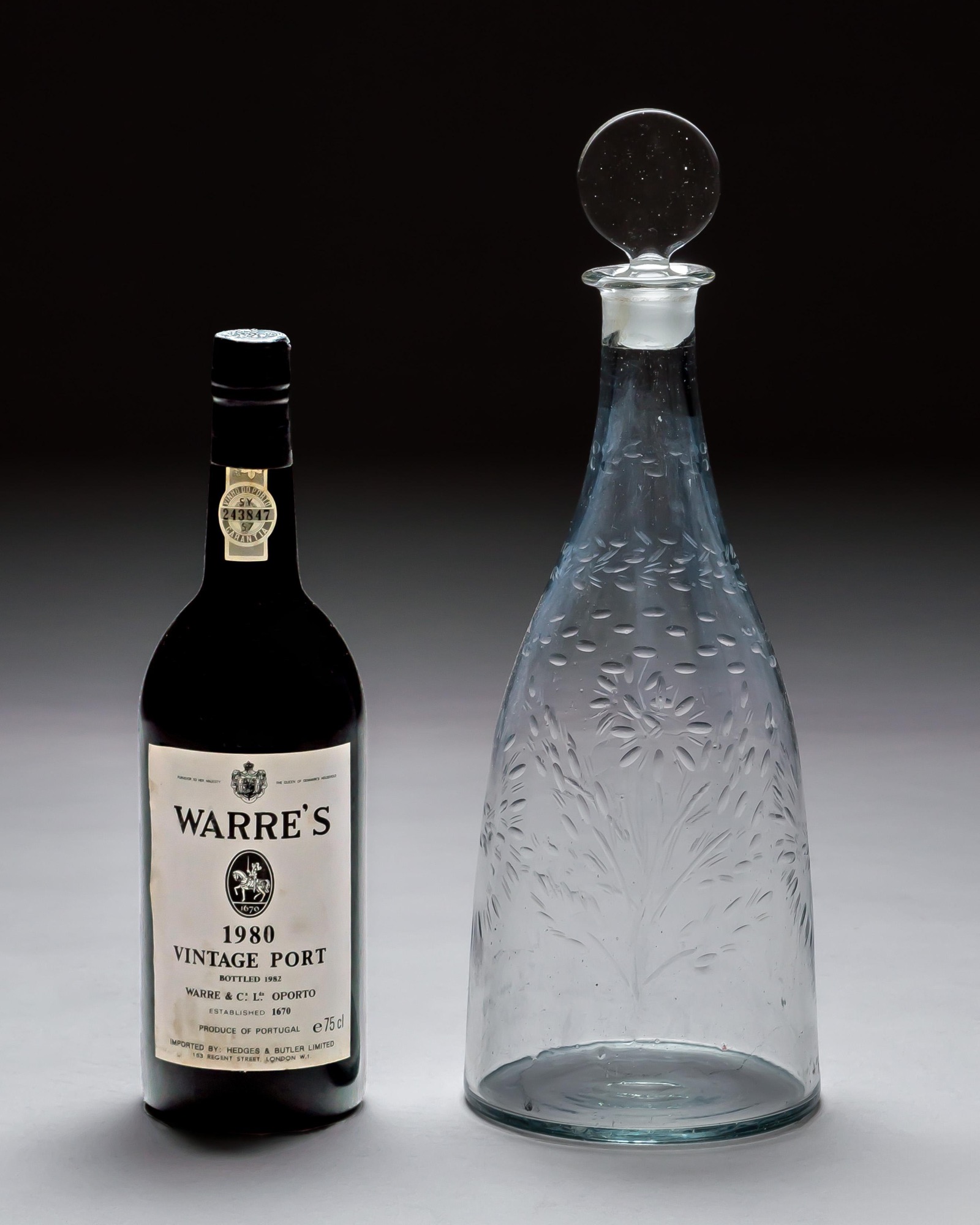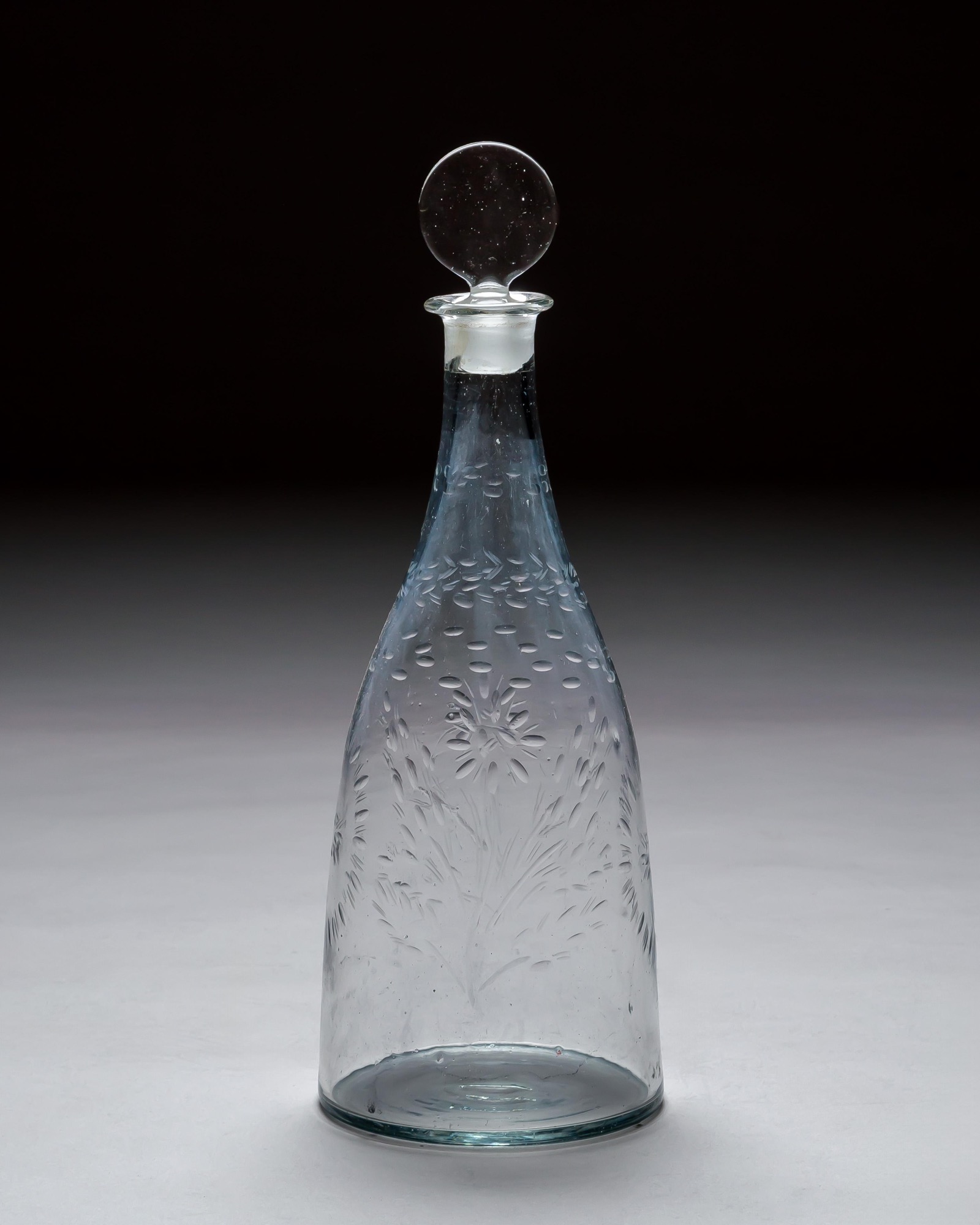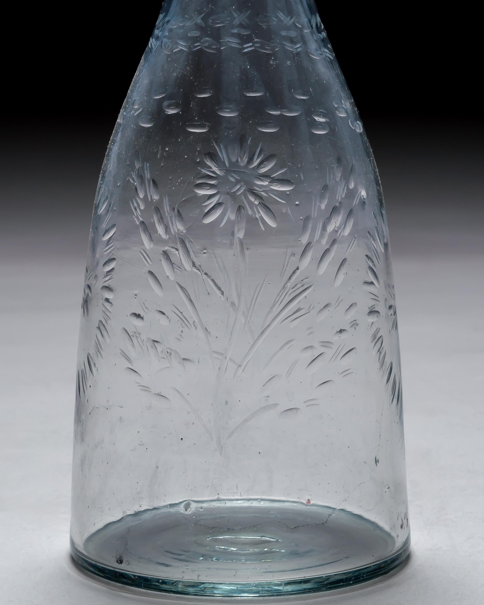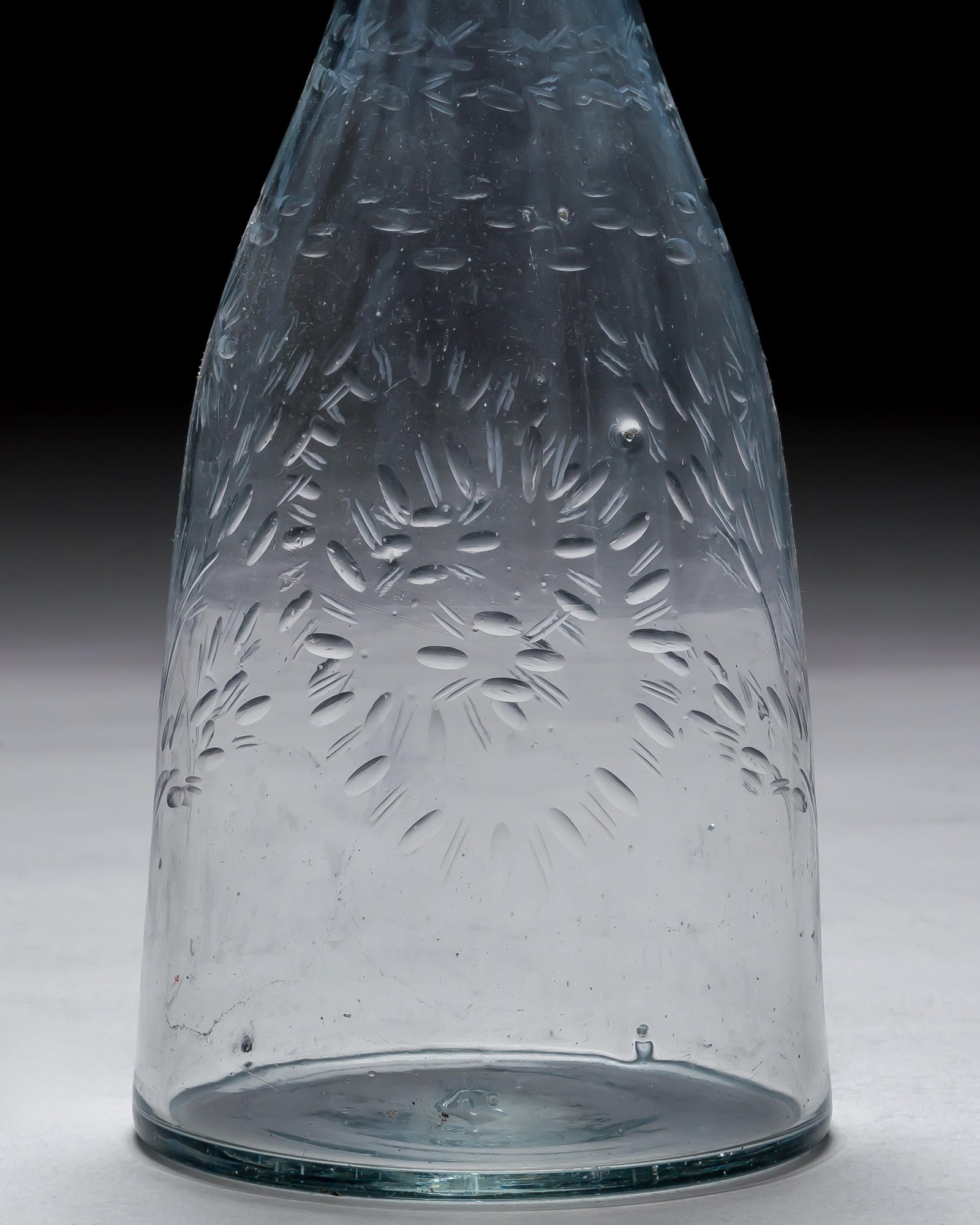 A graceful Georgian period glass magnum decanter of elegant simplicity, the body is delicately cut with a charming pattern of stylised foliage and scattered oval motifs, evoking the softness of falling petals.