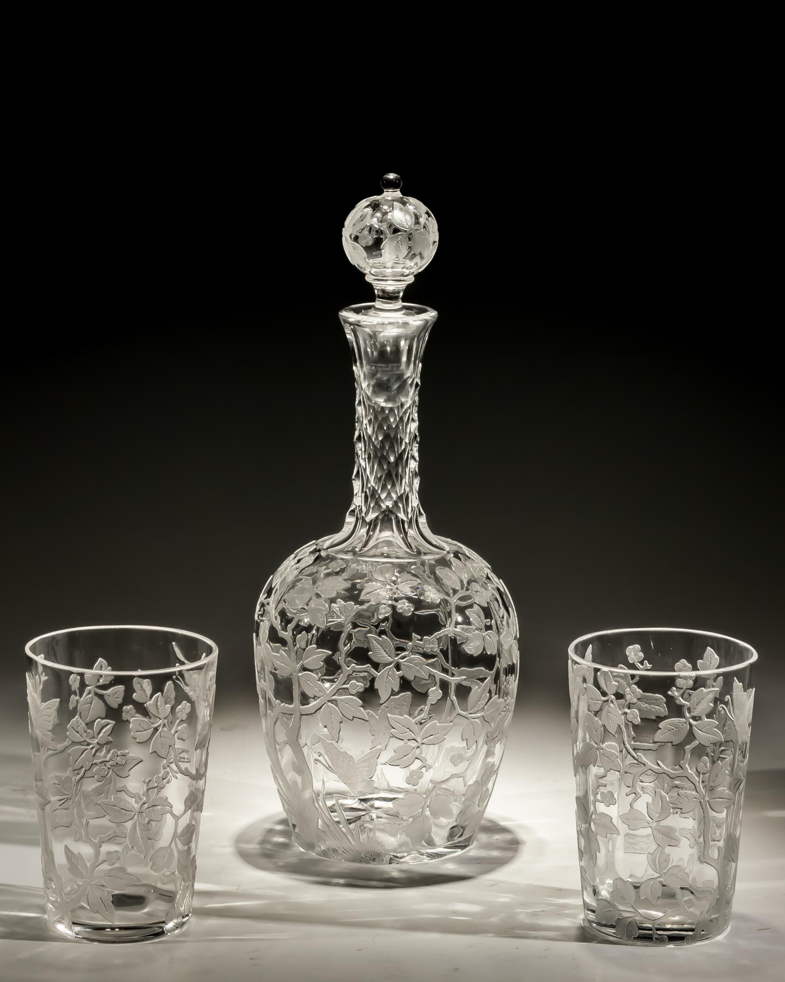 A FINELY DECORATED DECANTER WITH MATCHING TUMBLERS
