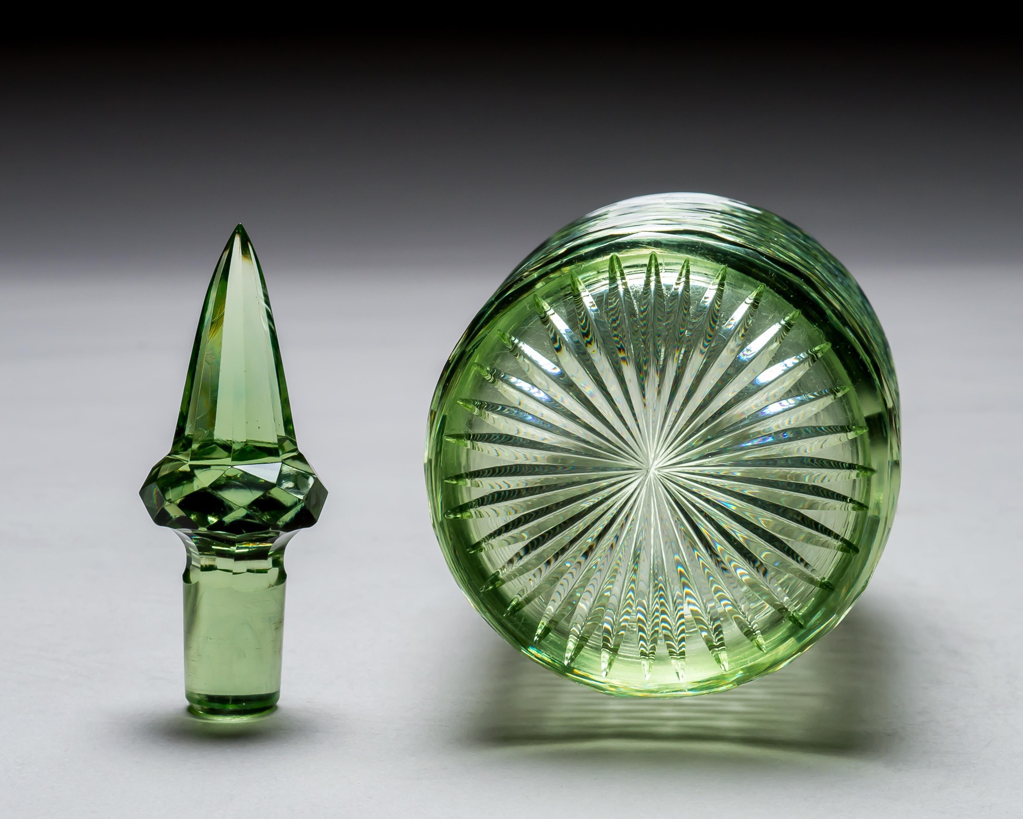 A tall green glass decanter with prism cut body and neck, star cut base and fitted with facet cut spire stopper.