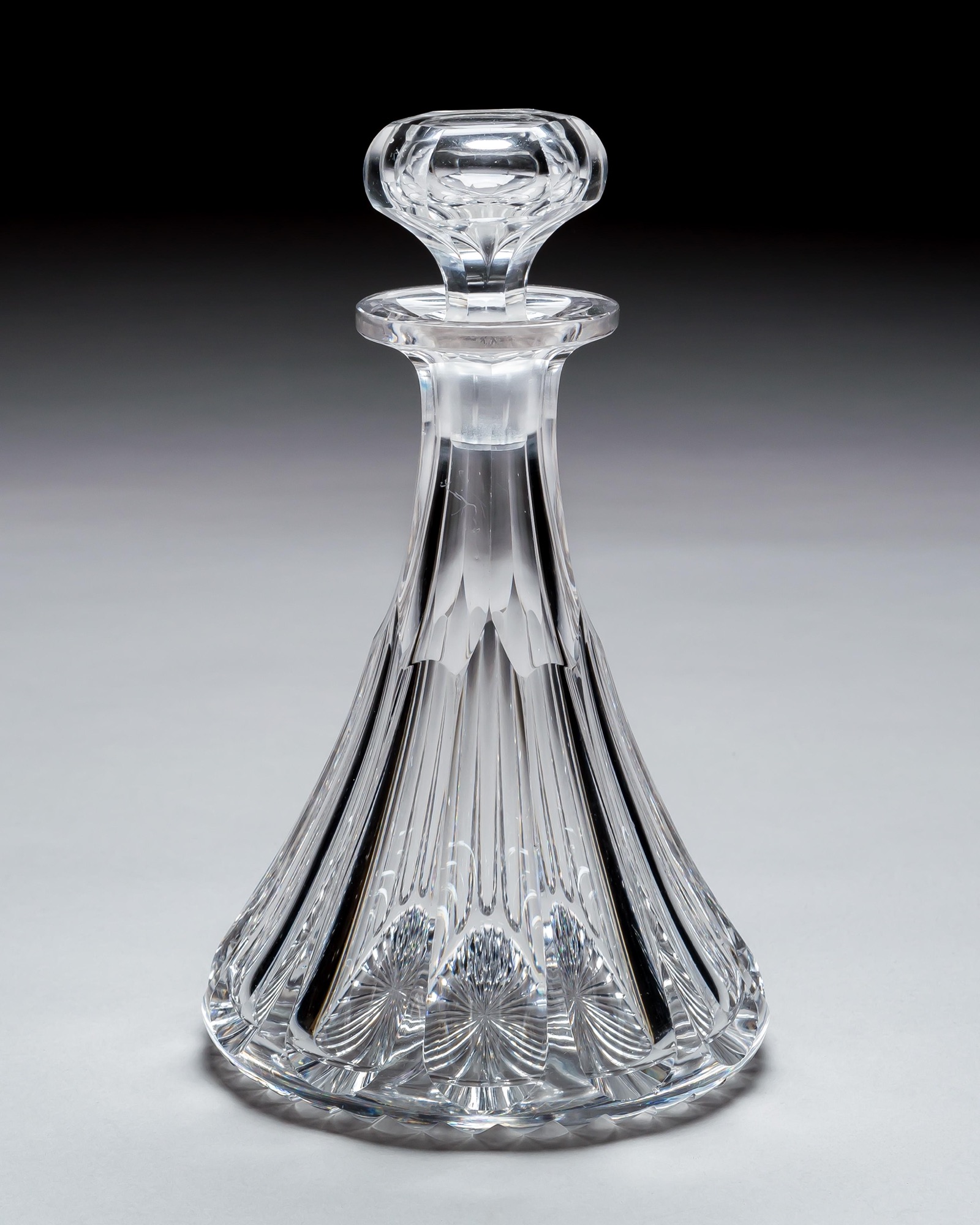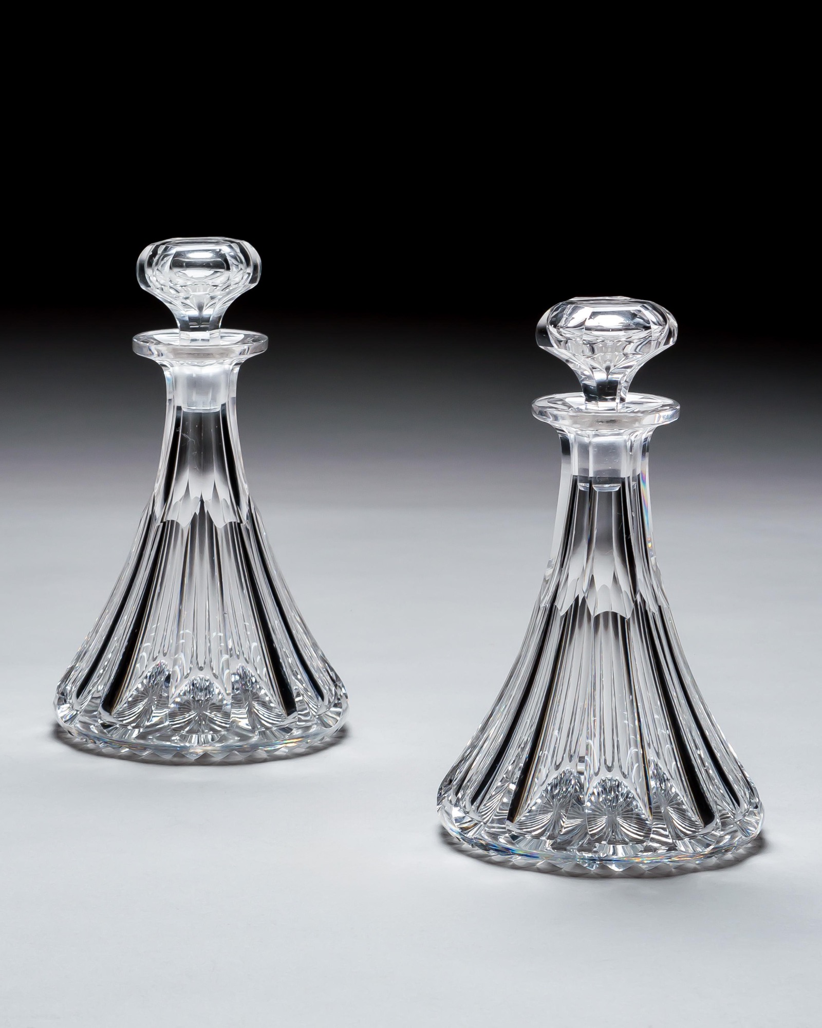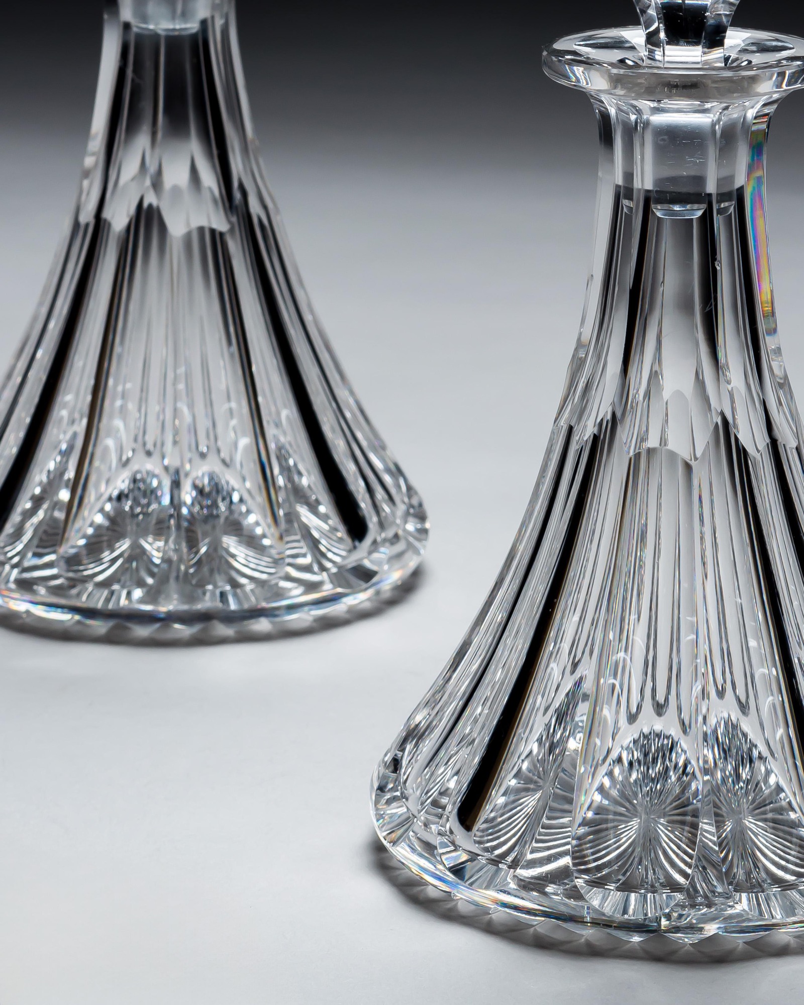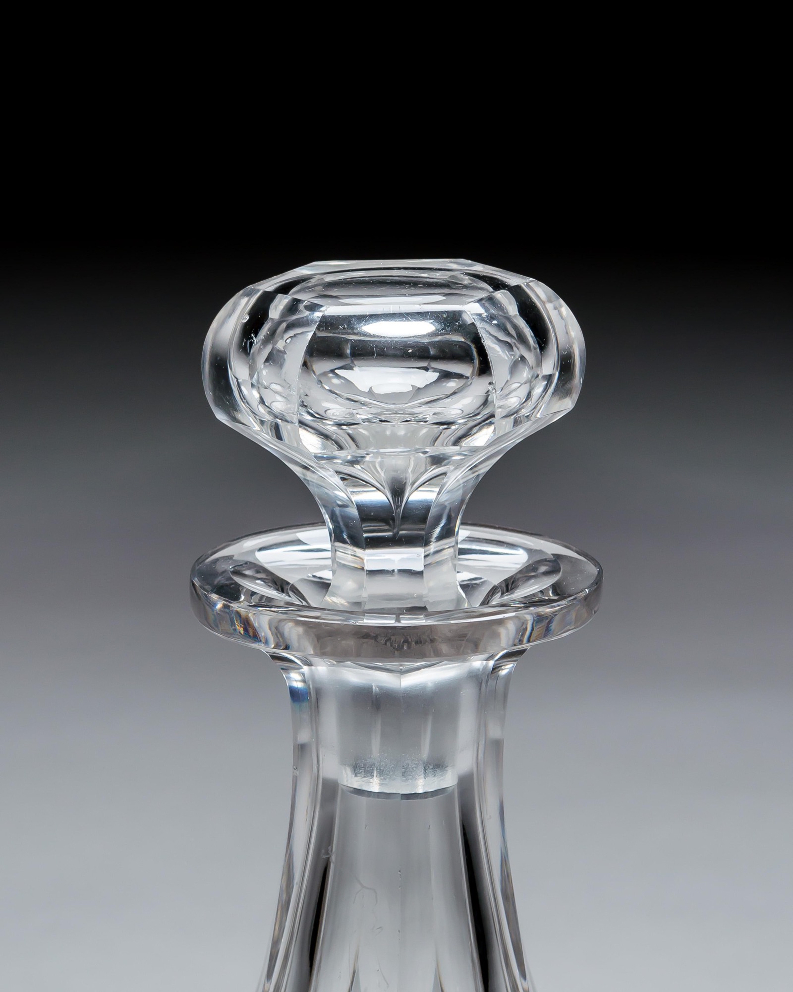 A striking pair of Victorian cut glass spirit decanters, each of elegant flared semi-ships form with deeply cut flutes rising from a richly faceted starburst base. Each decanter is topped with a matching faceted stopper, adding balance and harmony to the overall silhouette.