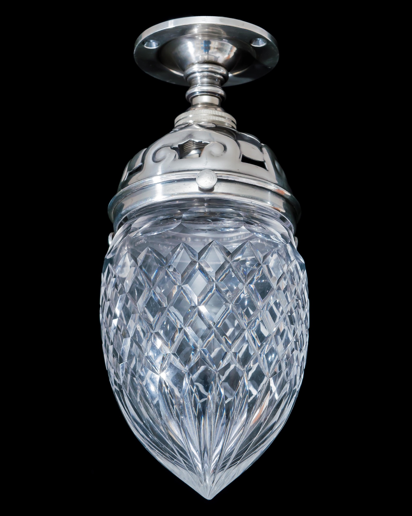 A refined set of three ceiling-mounted pendant lights, each featuring an elegant cut glass shade of acorn form suspended from finely crafted silvered mounts. The glass shades are beautifully faceted in a flat diamond-cut pattern, designed to catch and refract light with exquisite brilliance, while the mounts display pierced neoclassical motifs and a polished finish that complements the clarity of the glass.